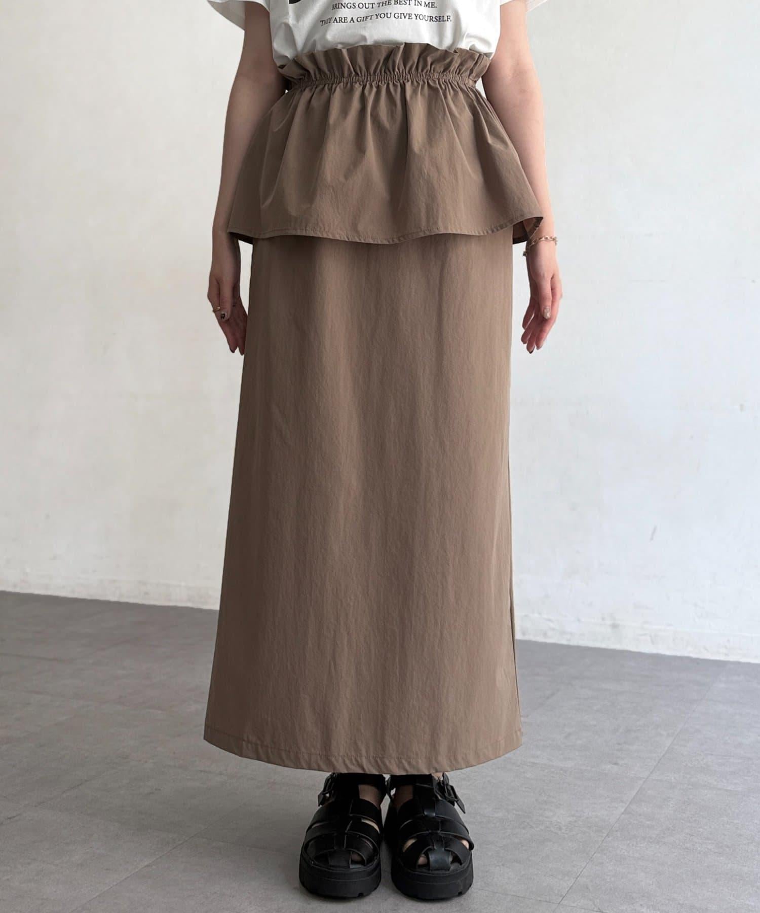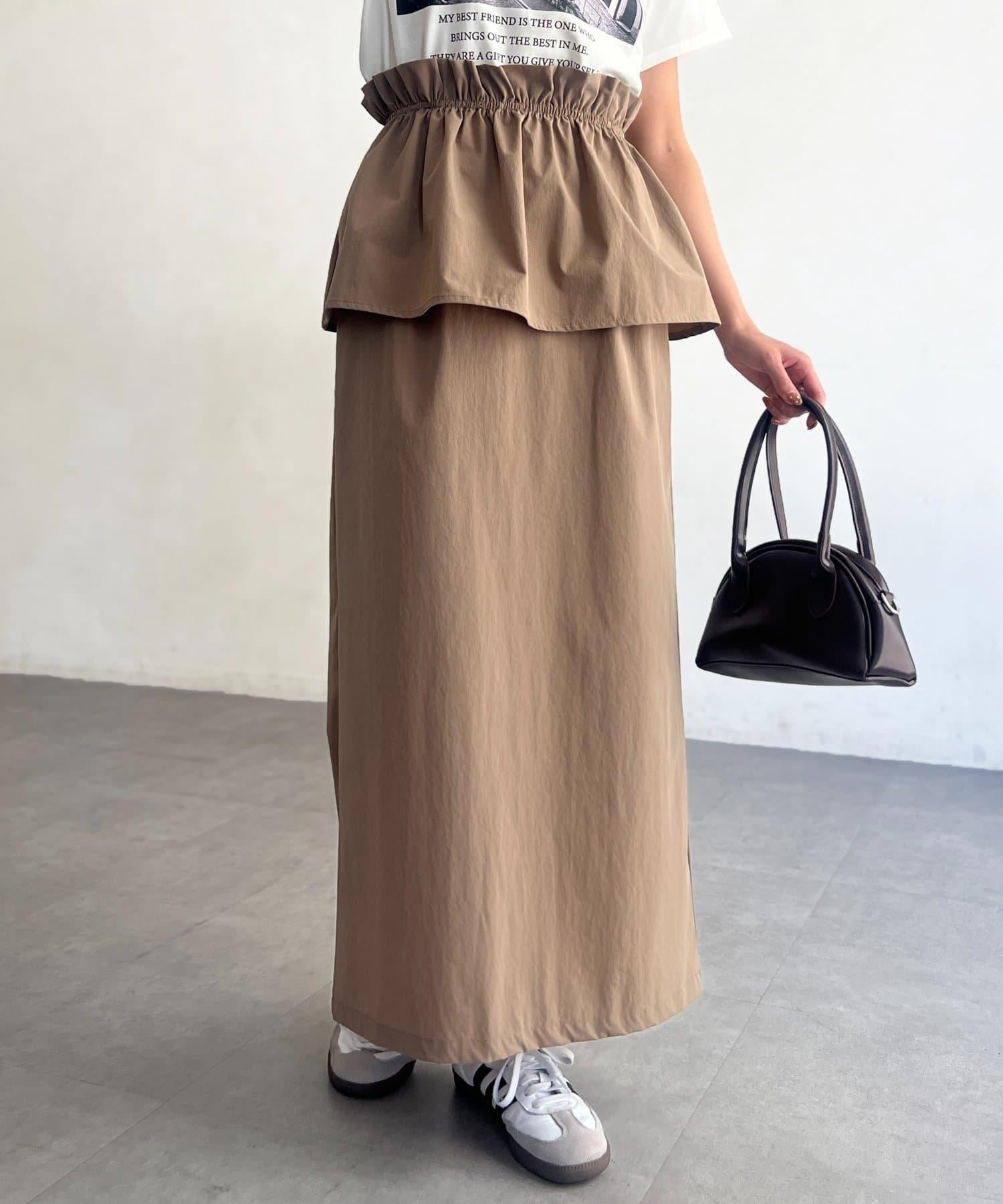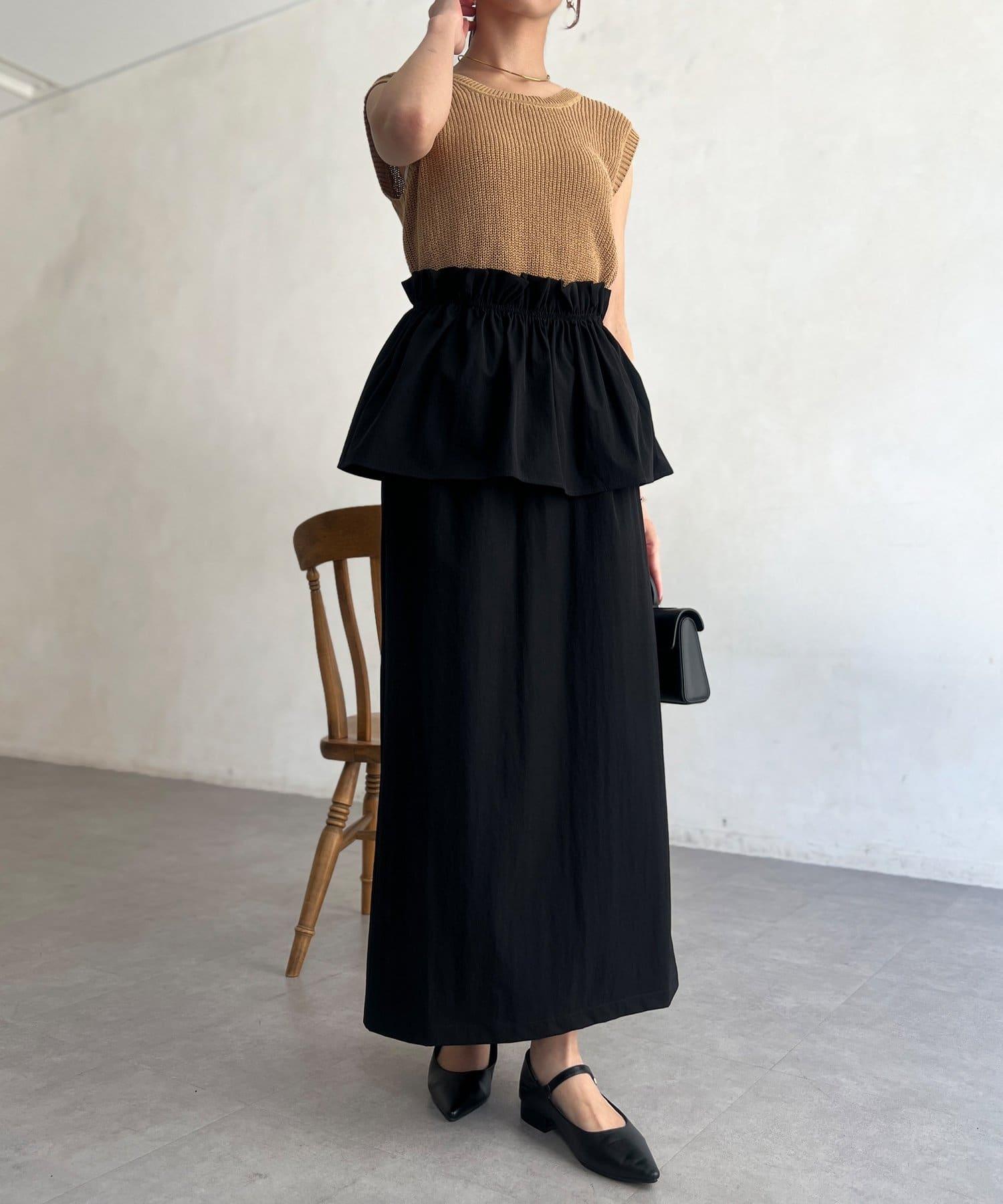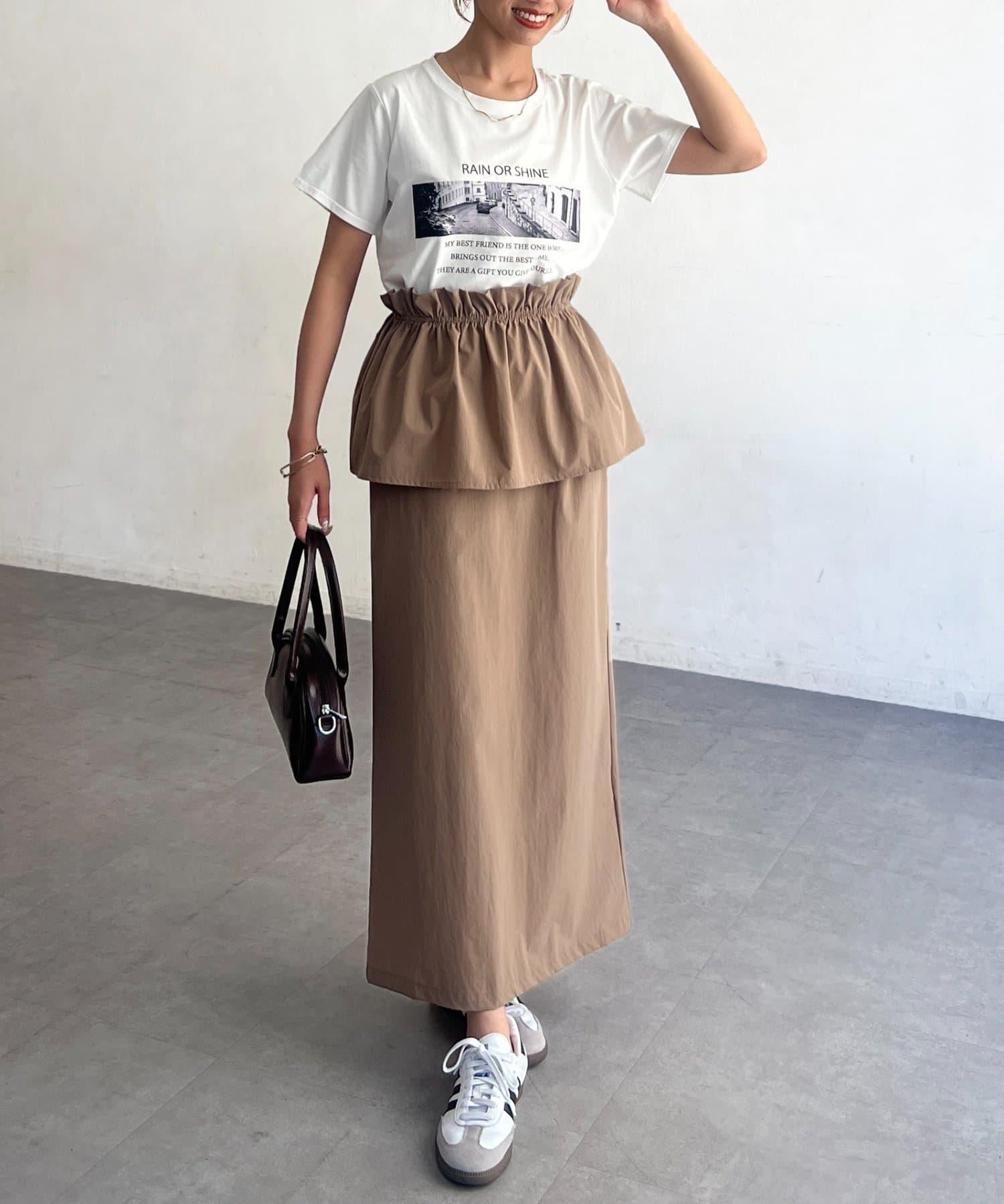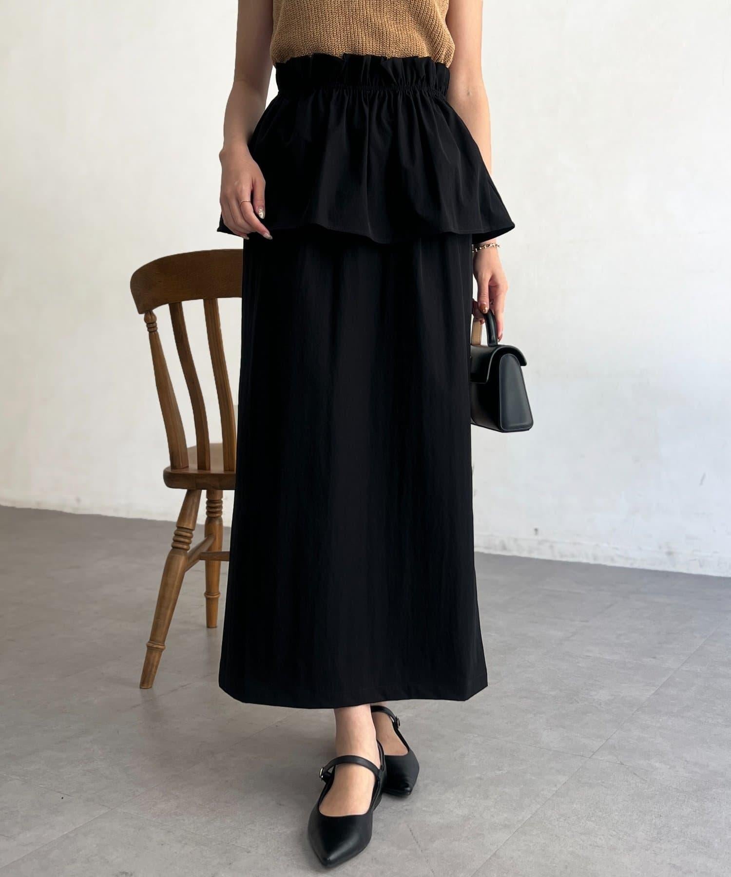 前部收腰的窄裙後腰處有鬆緊帶和袋口,穿起來輕鬆自如。