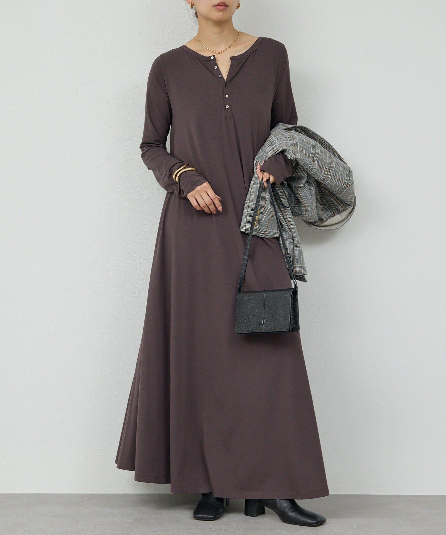 這款連衣裙的輪廓有前後兩種款式,也可以通過繫上兩側的紐扣實現不對稱設計。