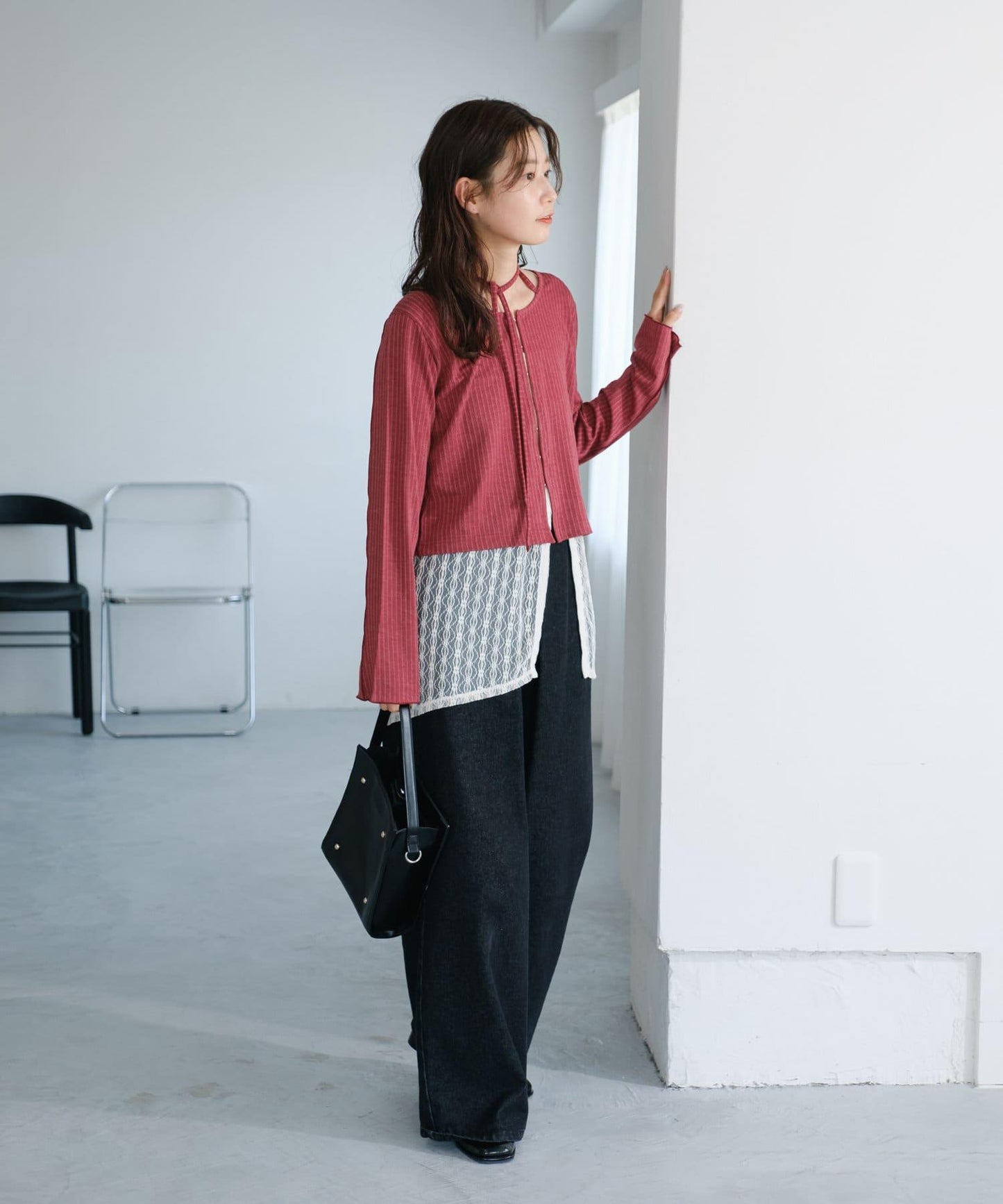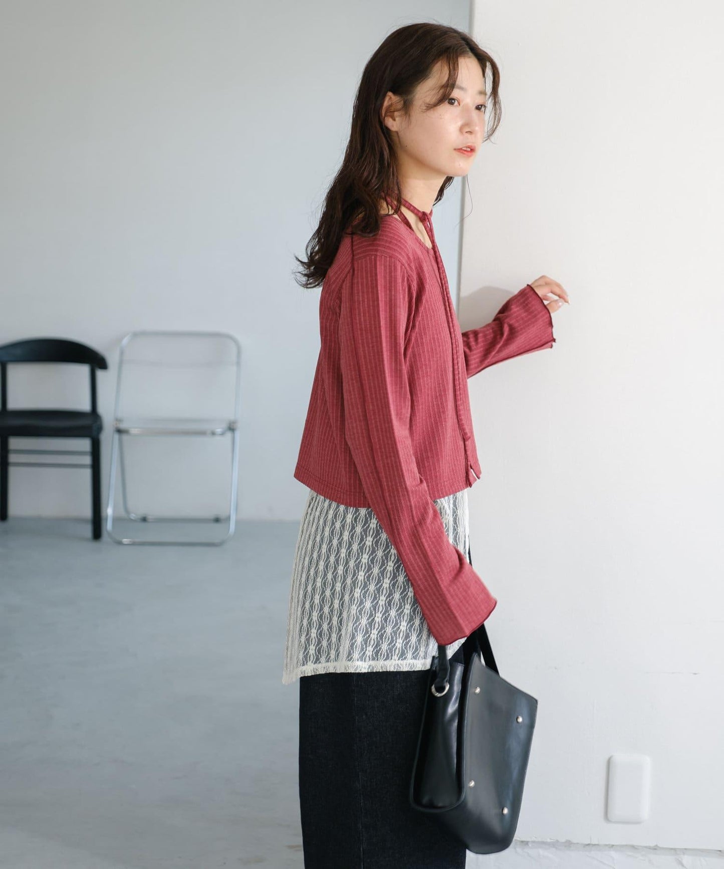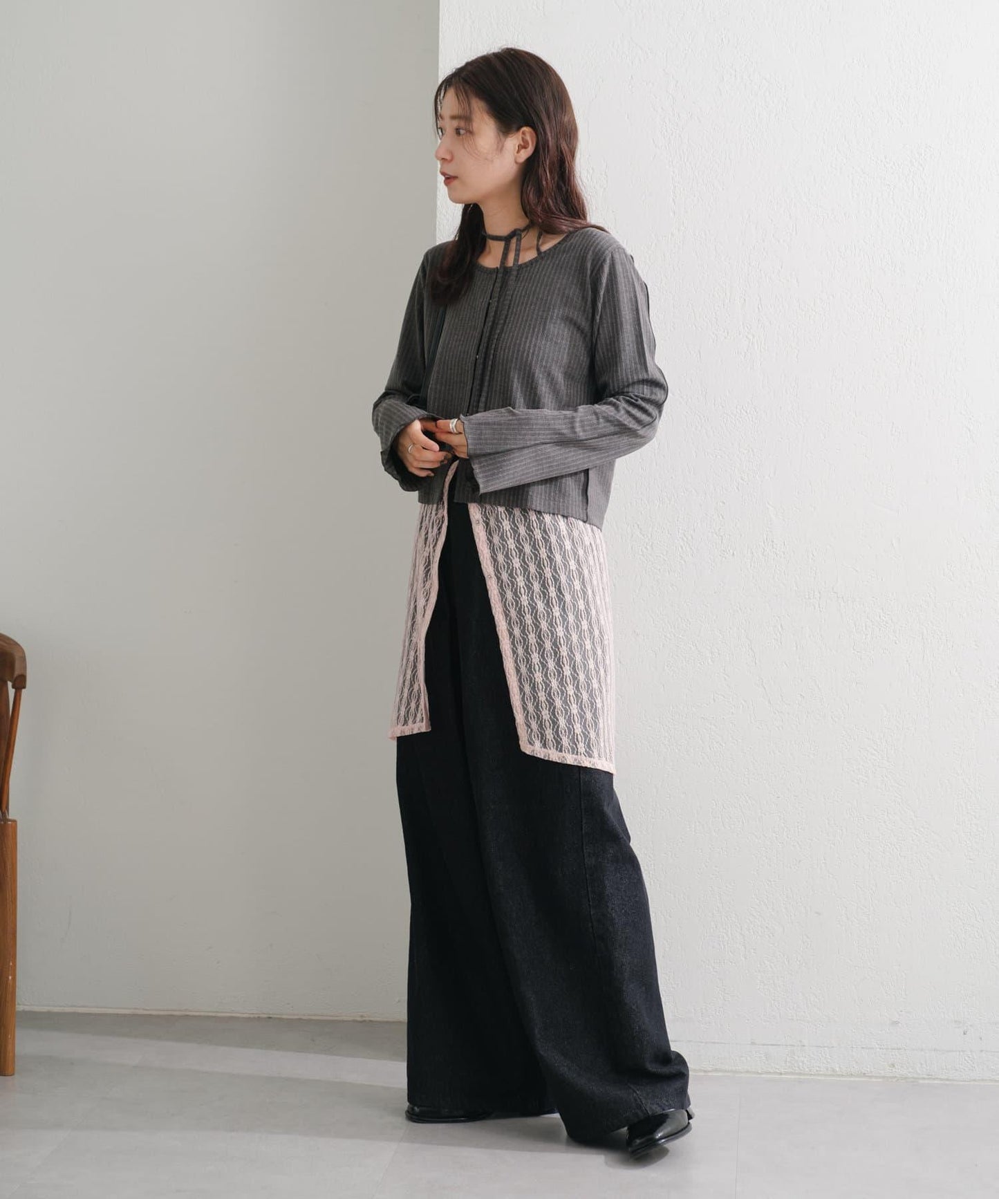 建議搭配牛仔長褲,充分發揮蕾絲的透明感。
