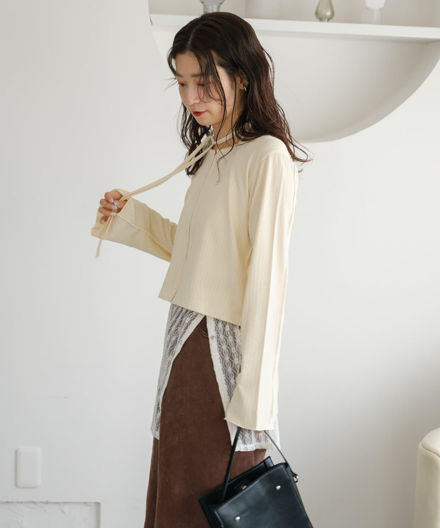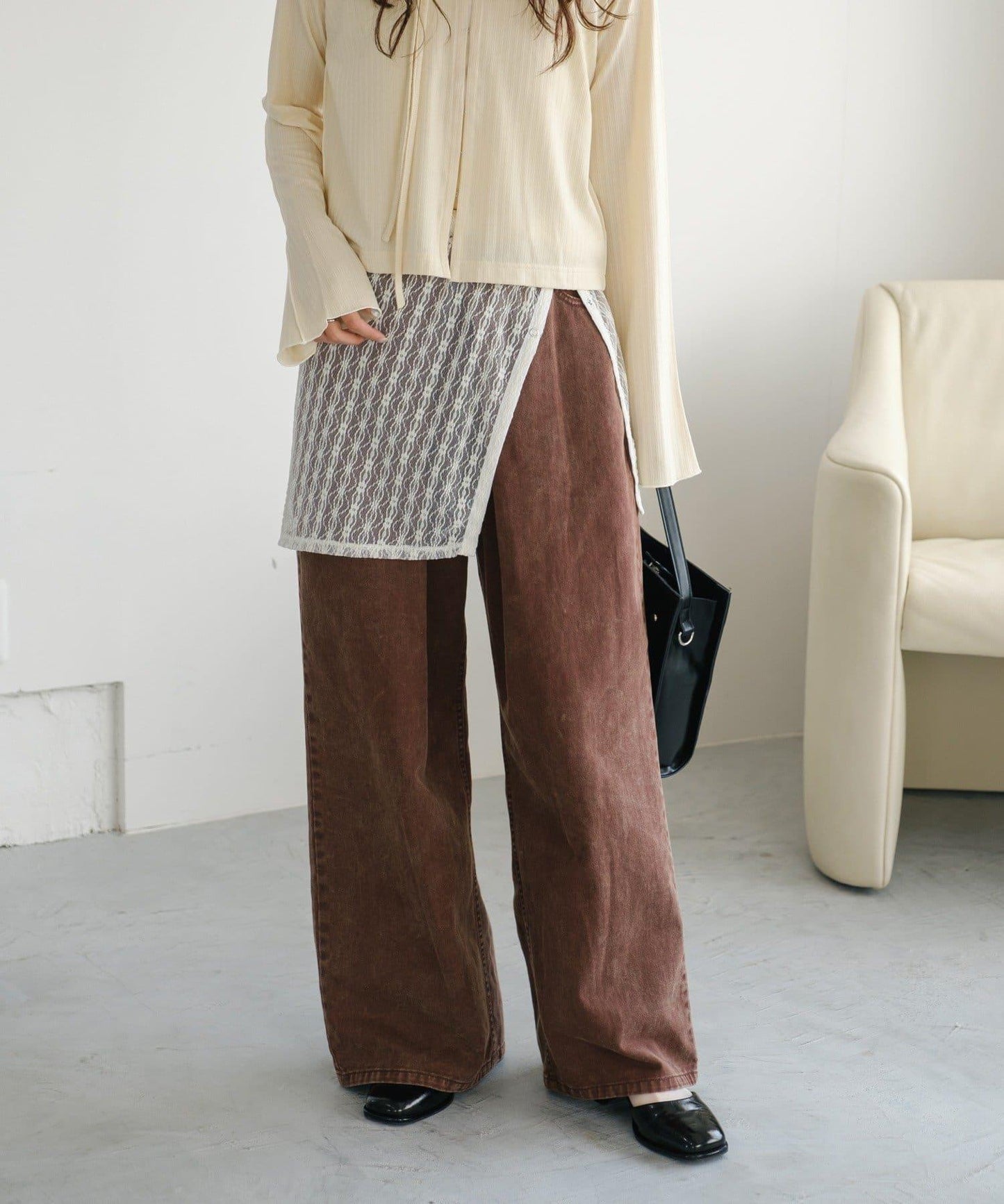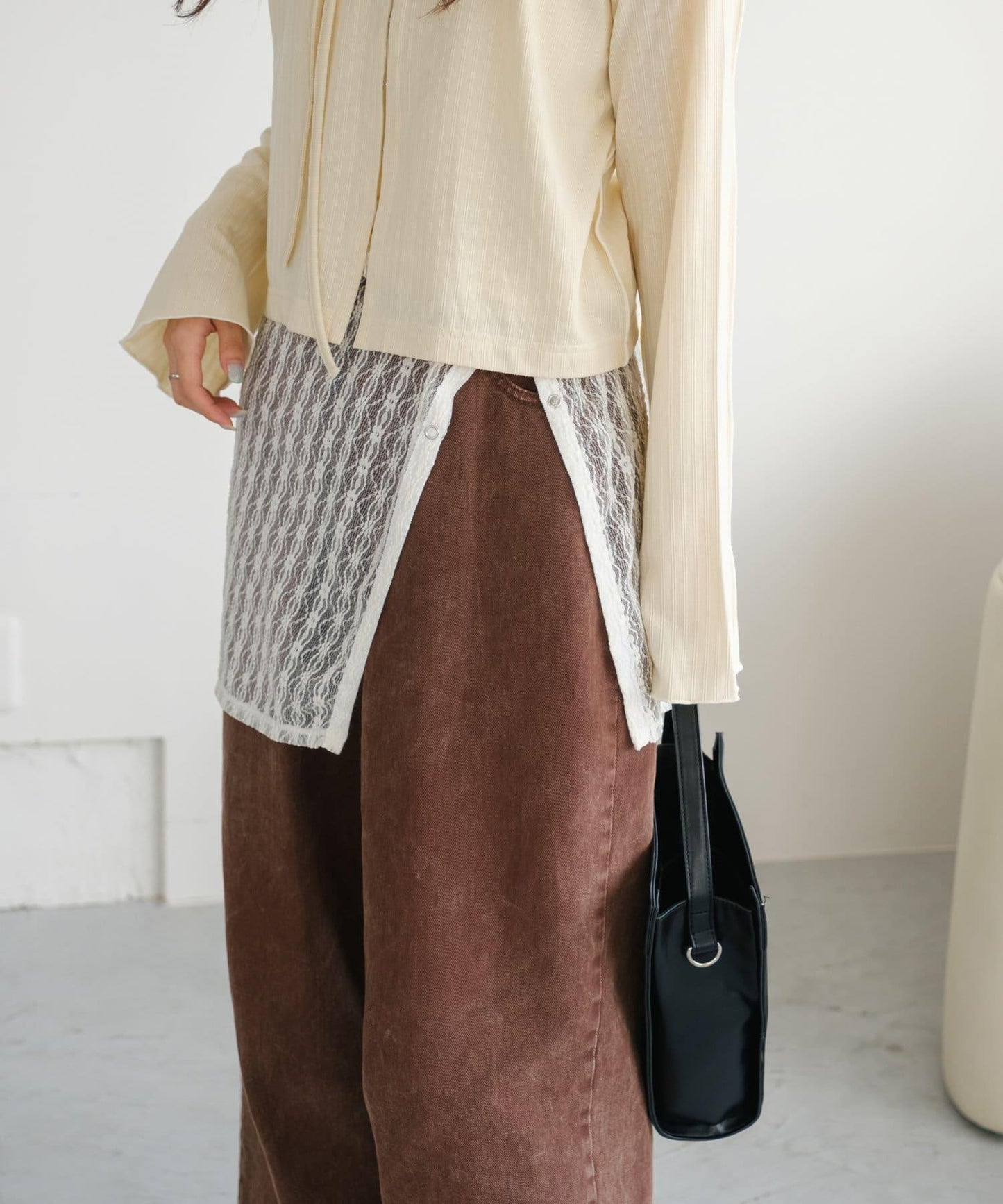 建議搭配牛仔長褲,充分發揮蕾絲的透明感。