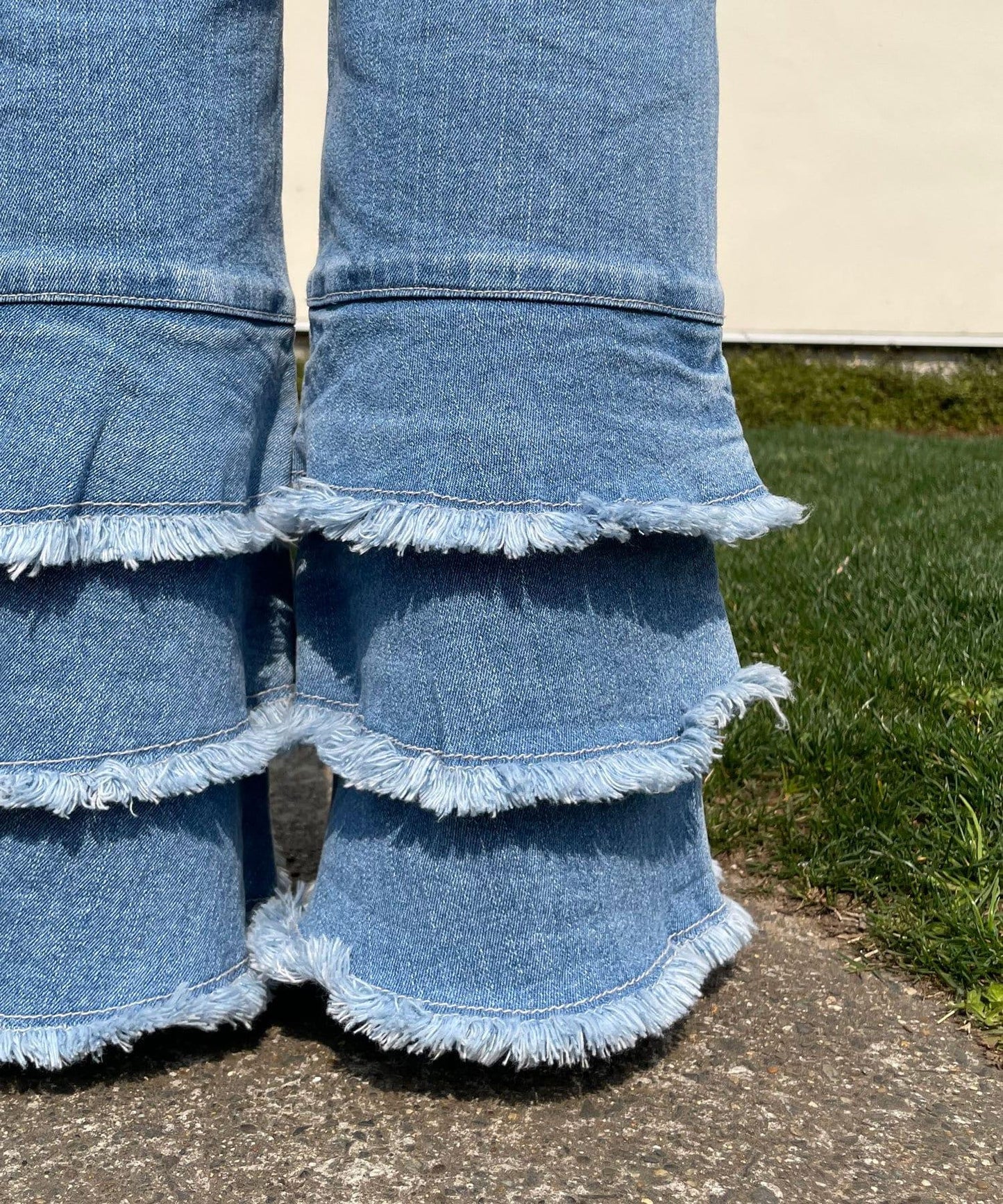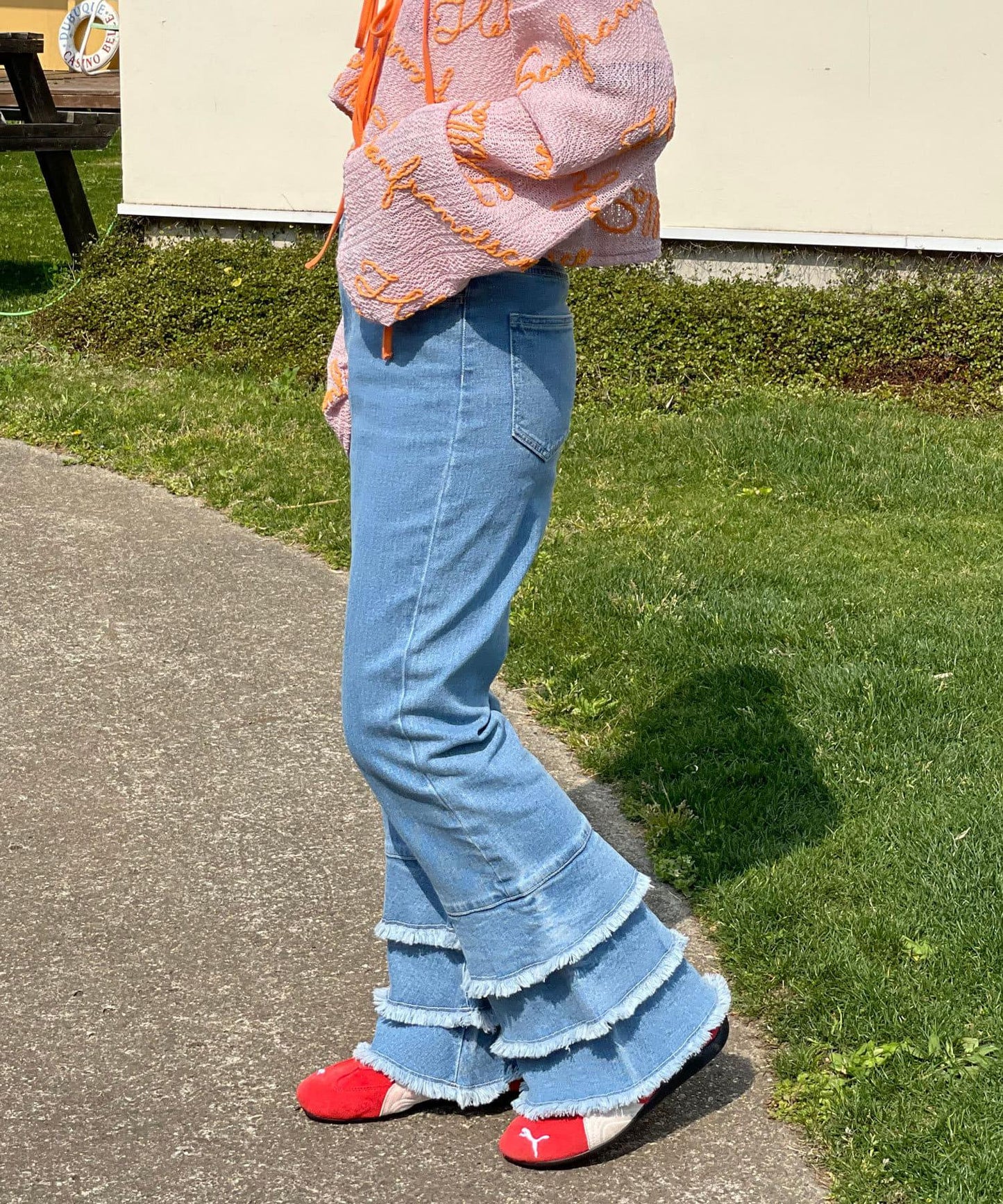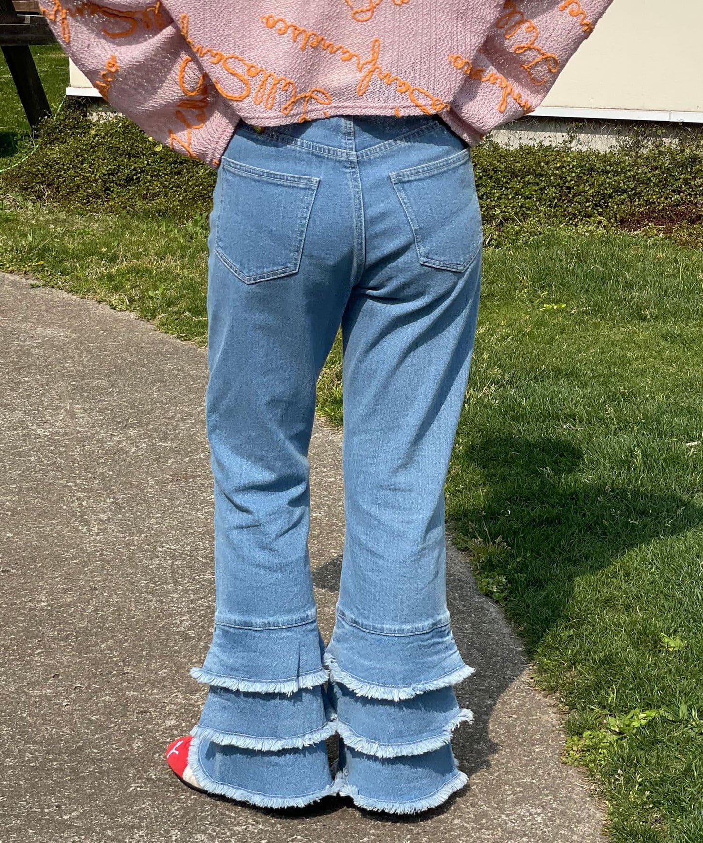 喇叭廓形牛仔長褲,三層荷葉邊下襬設計引人注目。