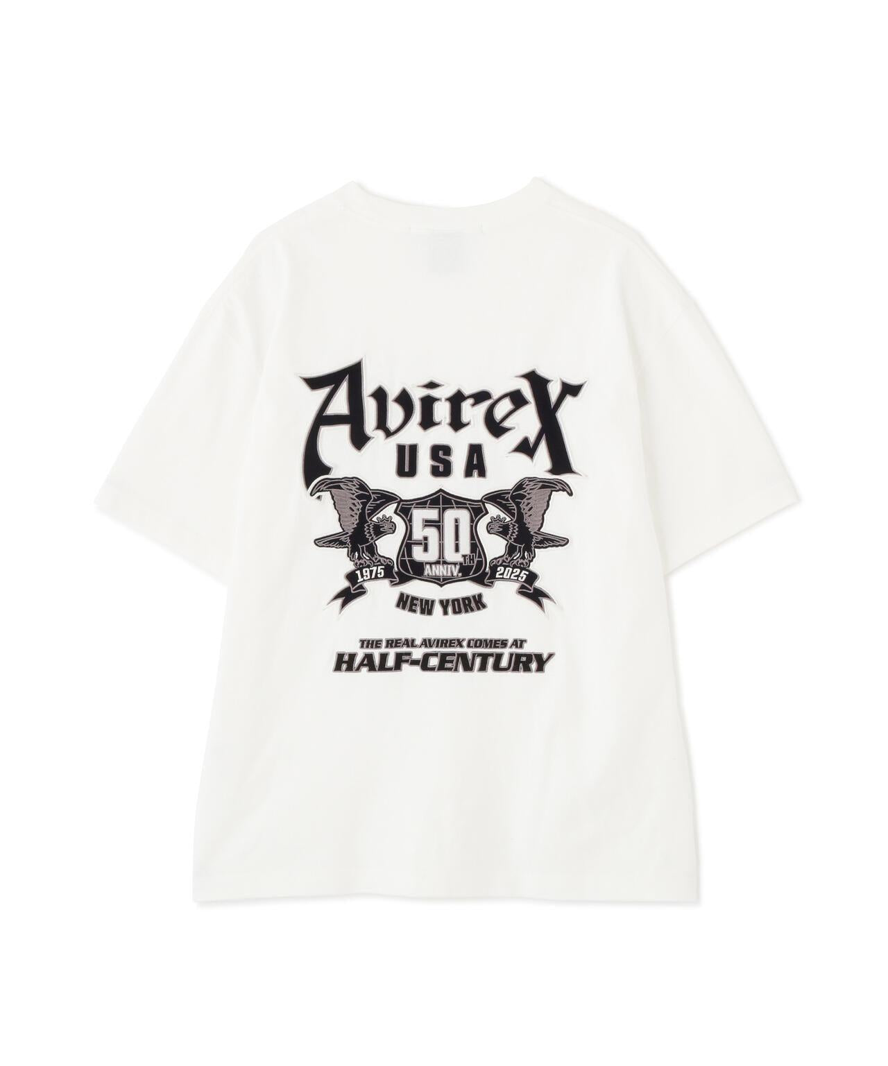 品牌 50 週年紀念短袖 T 恤 - 左胸前繡有原創標誌 - 背面繡有 AVIREX 50 週年紀念圖案的刺繡設計 - 表現立體效果的刺繡 - 基本款雙色開發 - 稍微寬鬆的良好廓形 [AVIREX / 阿維雷克斯] 1975 年美國空軍。1975 年,AVIREX 作為美國空軍的承包商成立。1985 年,AVIREX 以不屈不撓的設計精神進軍運動休閒領域,通過提供飛行夾克大幅提高了知名度。該系列獨特的色彩和富有創意的圖案設計深受當紅藝術家和運動員的喜愛,尤其是在 HIPHOP 領域。