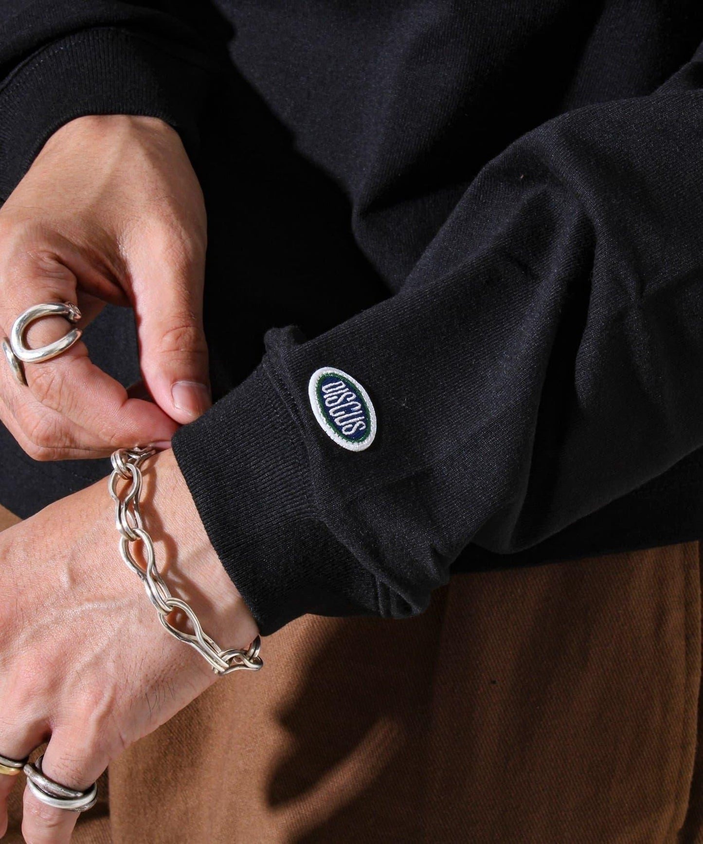 袖口的 DISCUS 徽標徽章和下襬的品牌標籤在簡潔的同時營造出一種存在感。