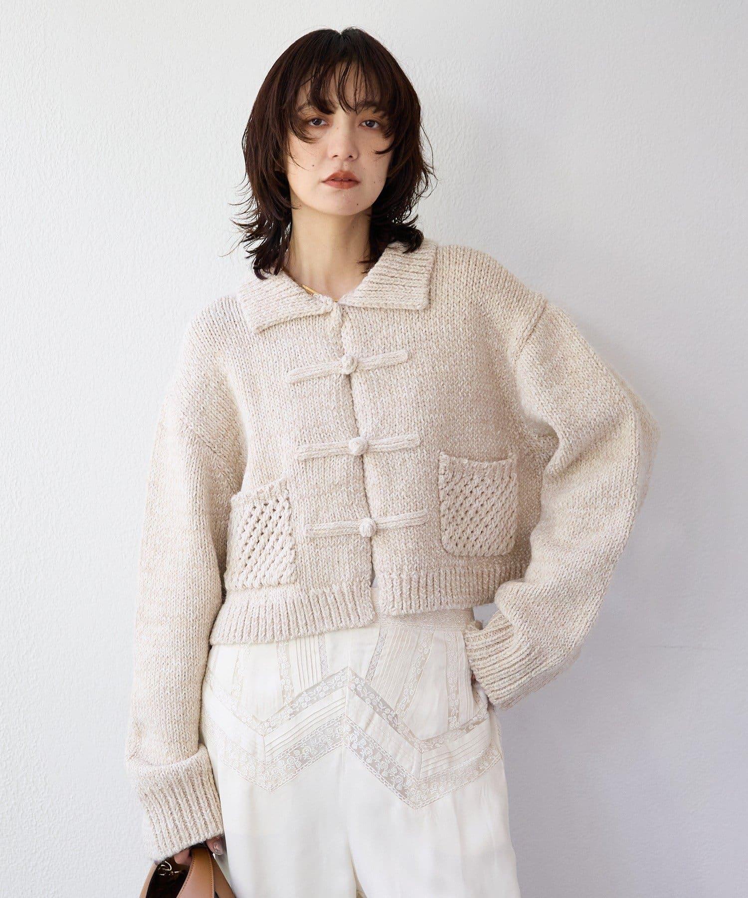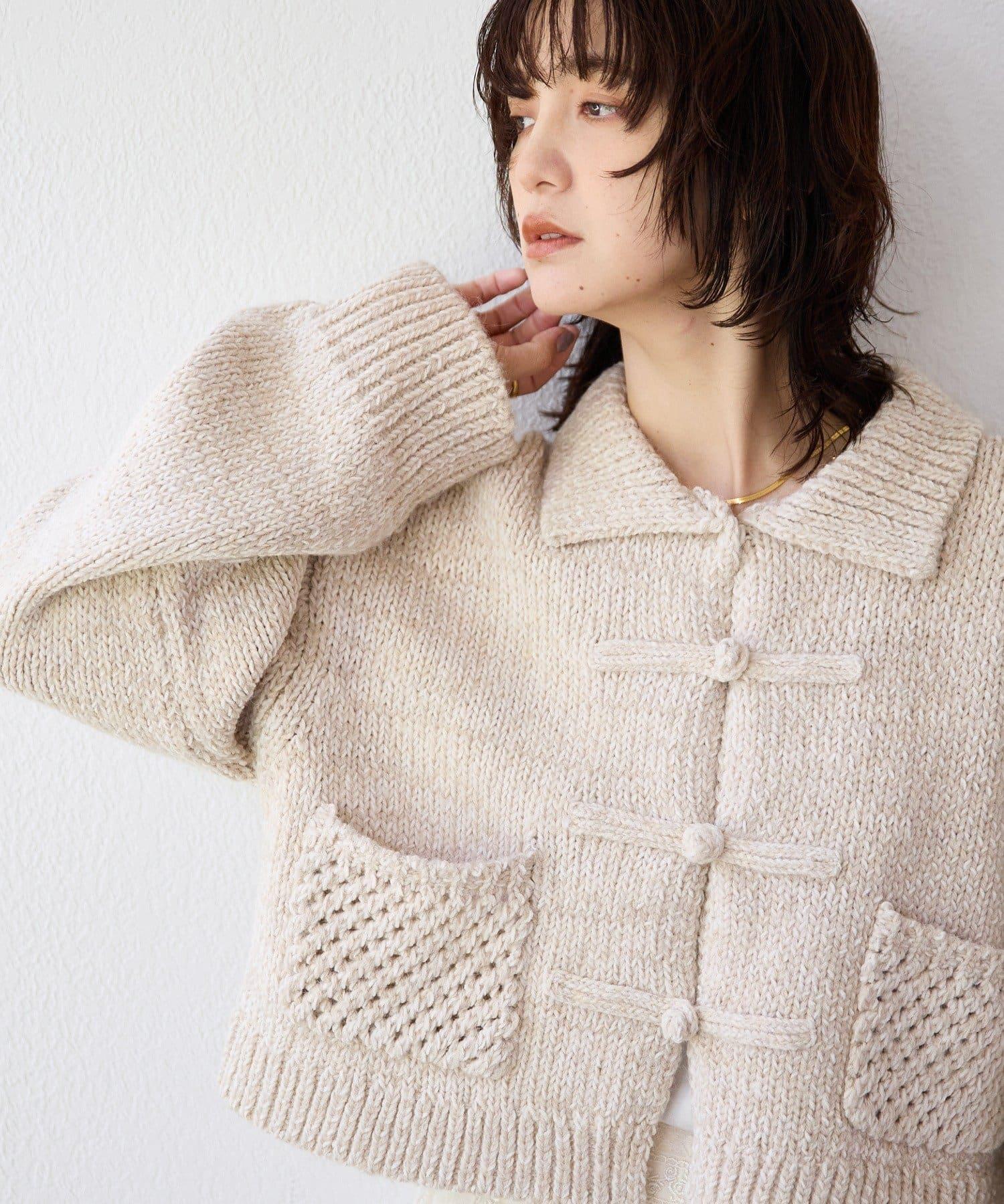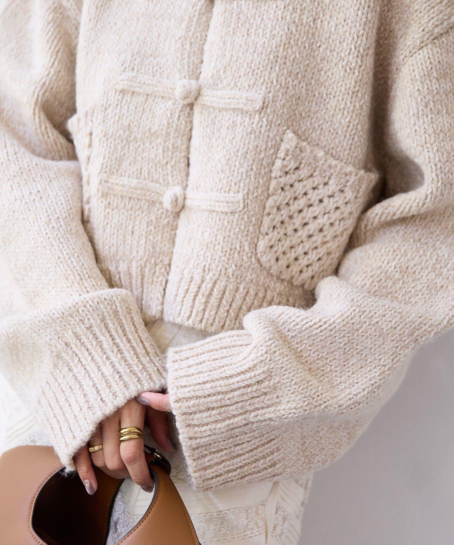 這款夾克注重細節,中國鈕釦由相同的材料編織而成,口袋則由鉤針編織物製成。