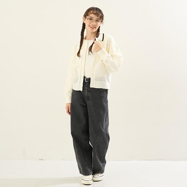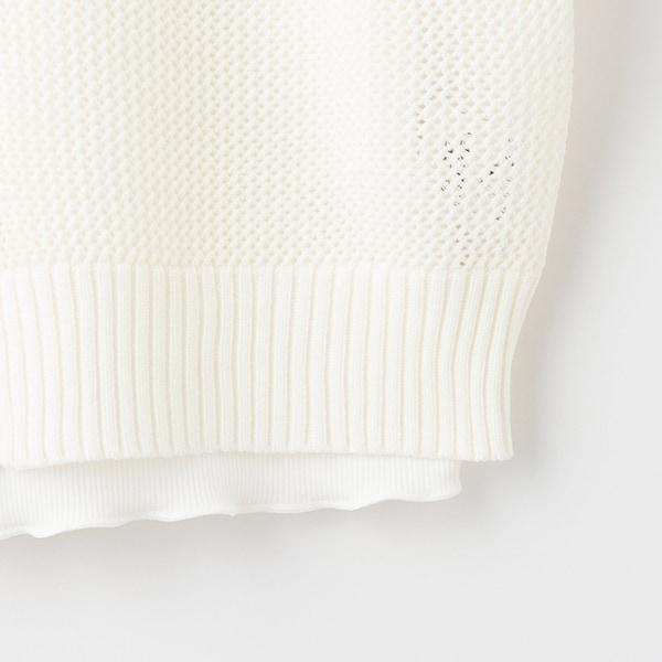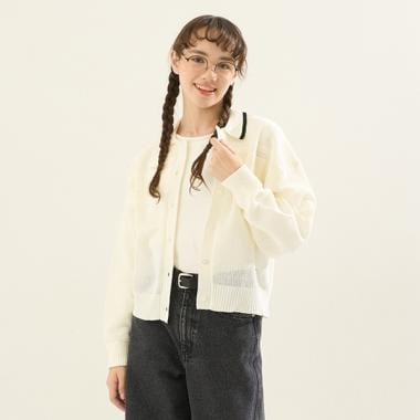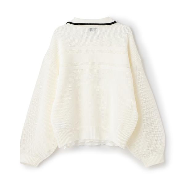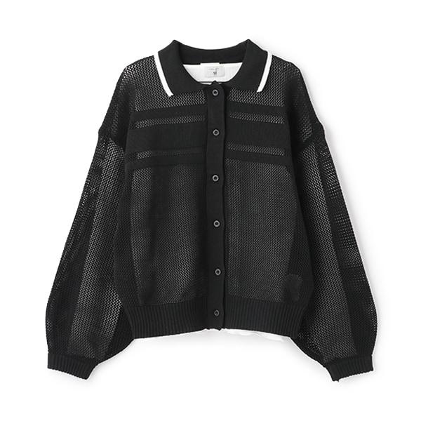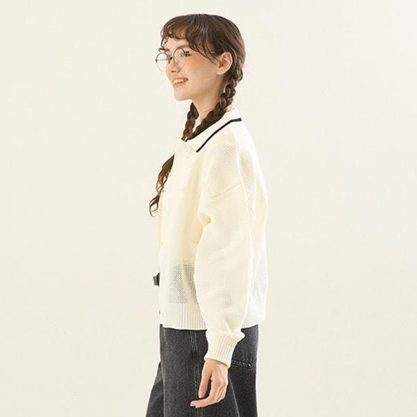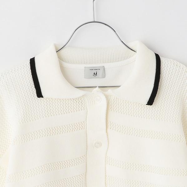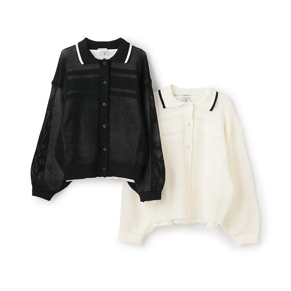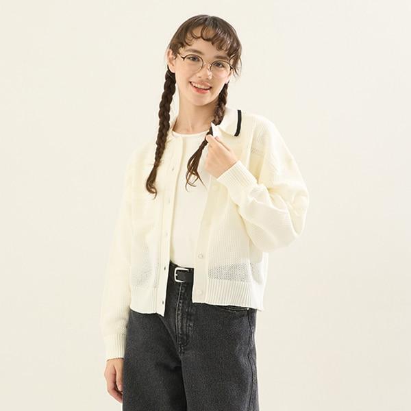 【AMI】條紋領網眼開衫與長袖T恤套裝