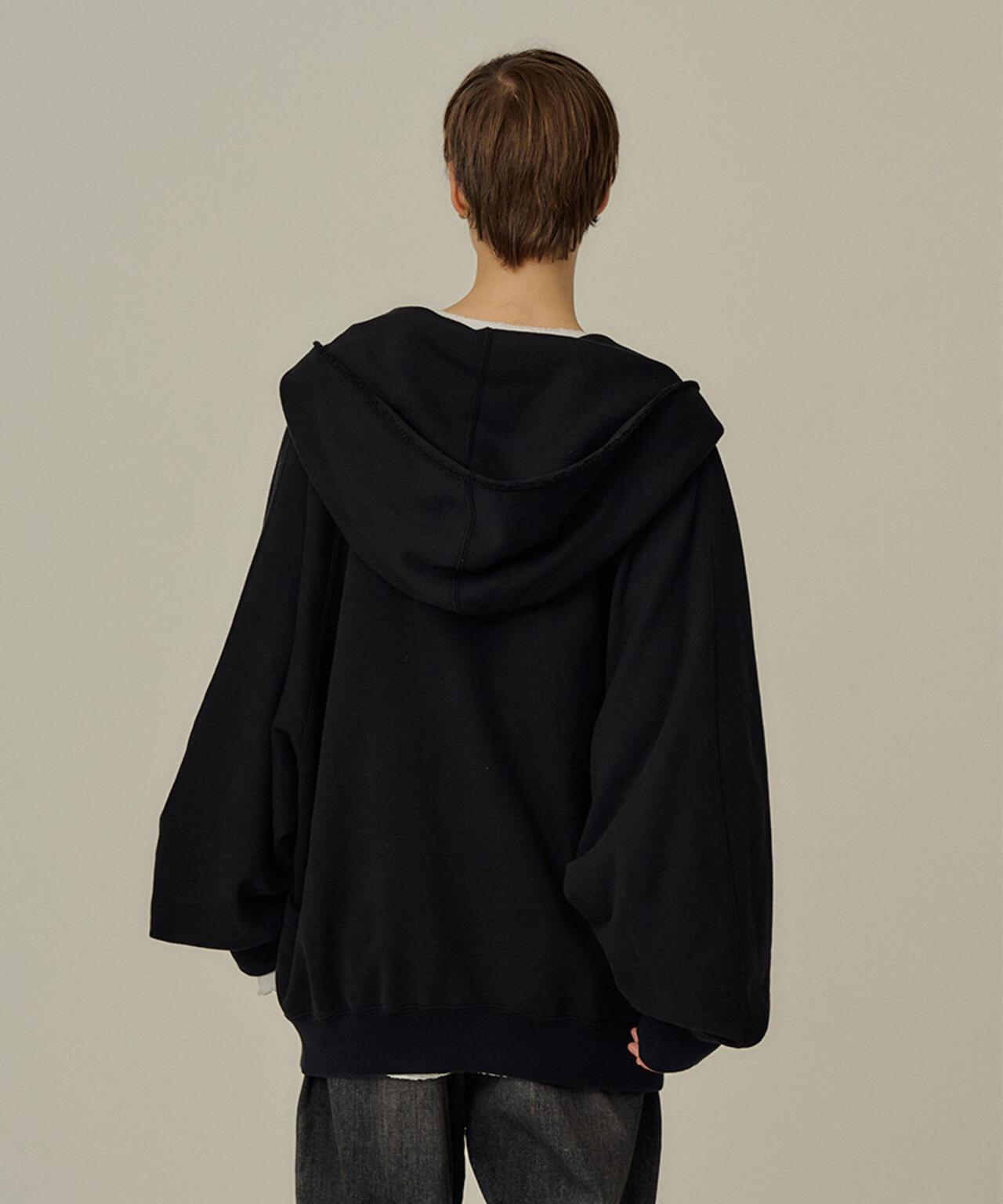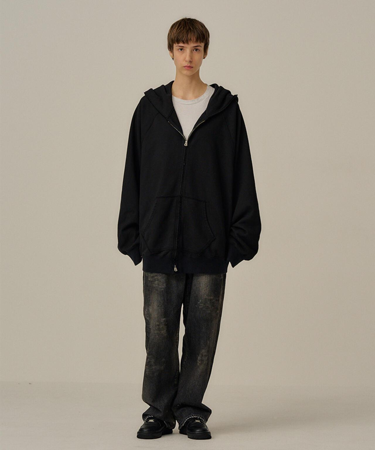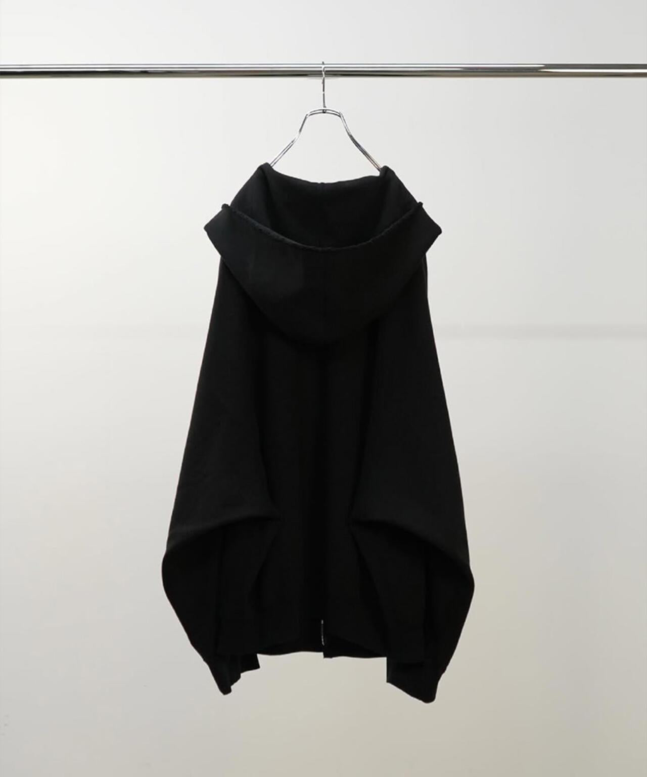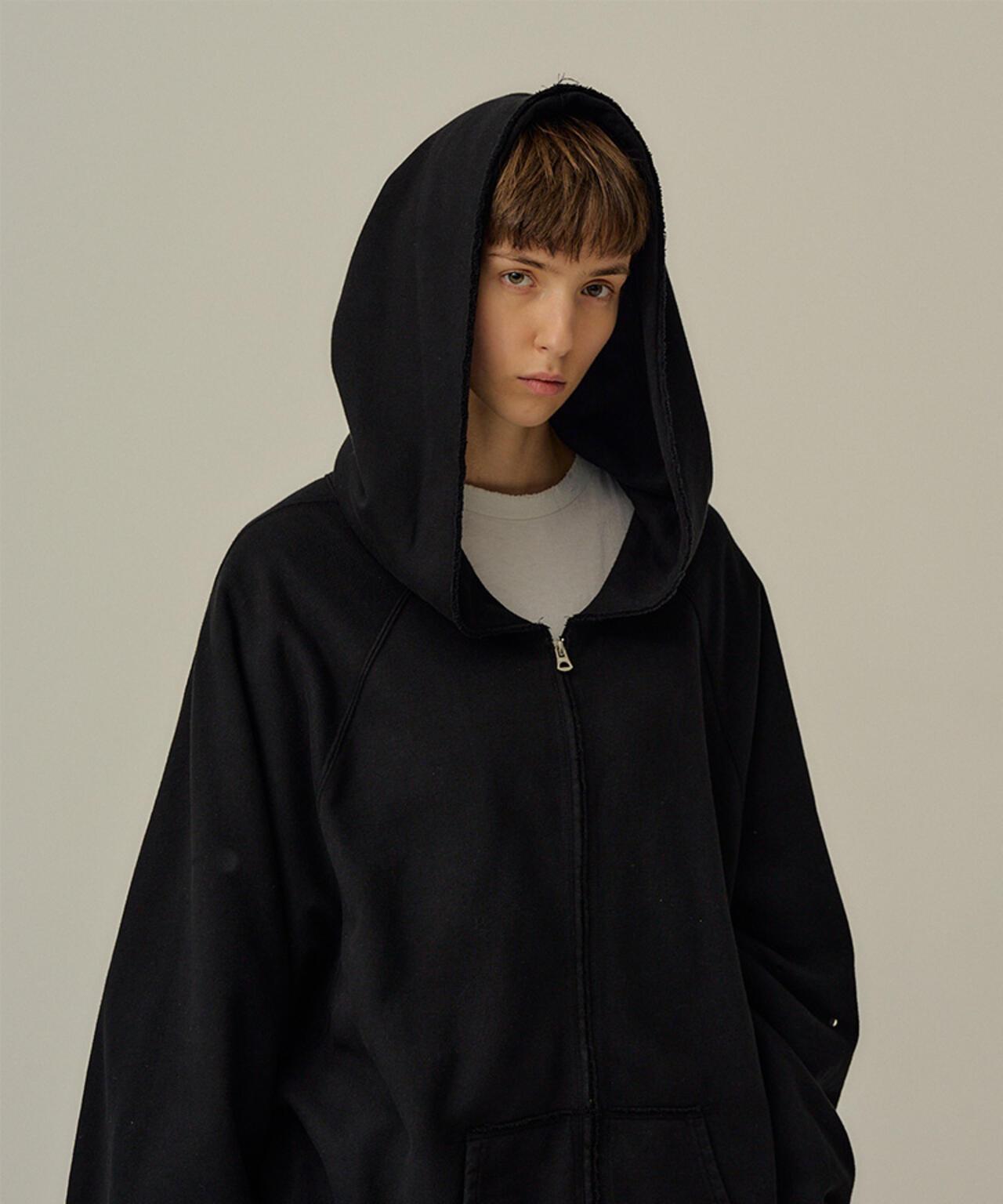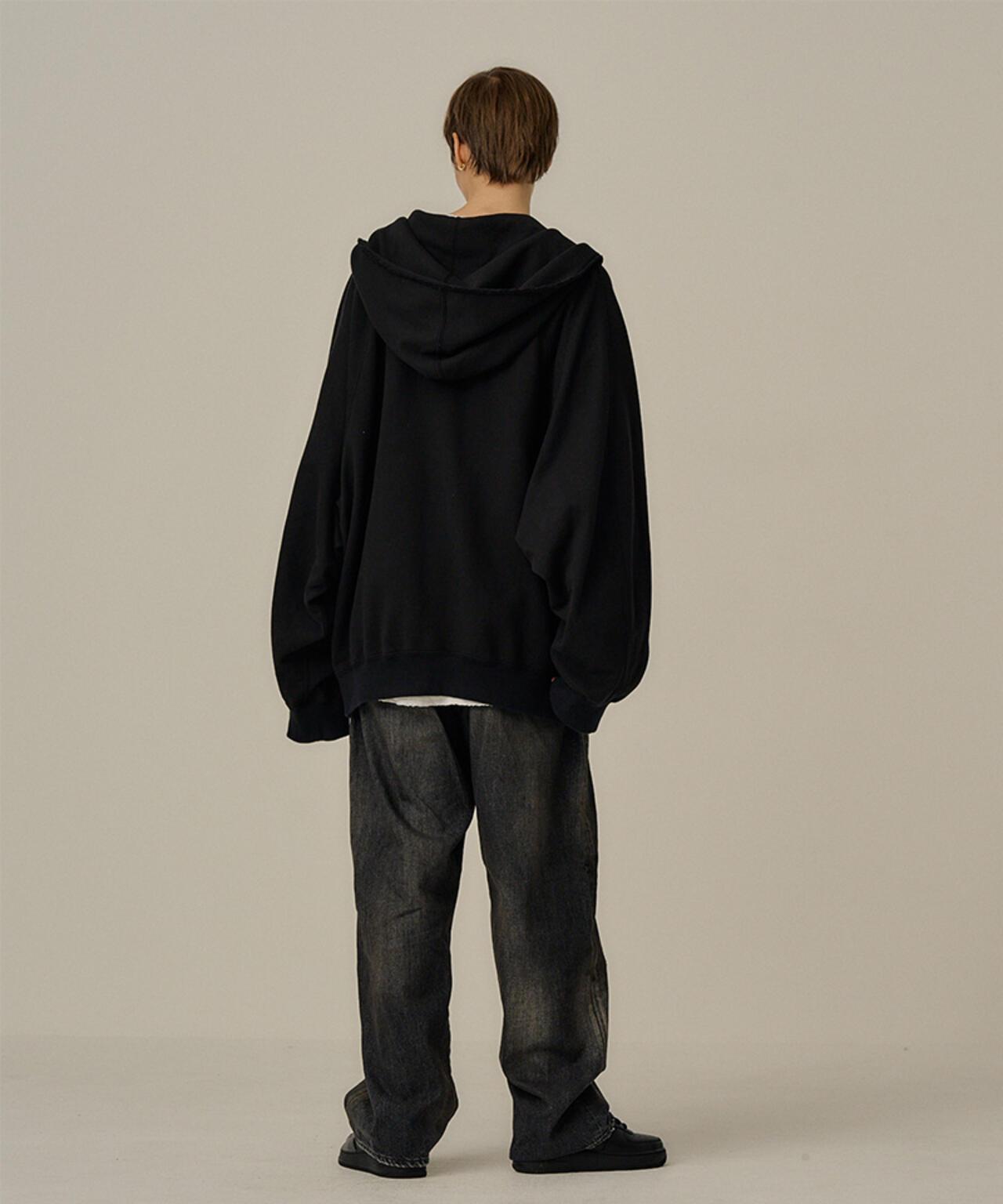 ANCELLM/SWEAT HOODIE COATA 大膽的超大衛衣連帽外套。腋下和衣身寬度處有大量布料,可作為大衣進行多層疊穿,凸顯整體形象的力量感。雙拉鍊可調節前襟開口,外穿夾克、運動衫、針織衫甚至大衣。此外,還可以像穿和服或武士服一樣,在不拉上拉鍊的情況下將門襟深深地重疊在一起,並在腰部繫上腰帶。我們認為,如果能根據自己的想法將它疊穿在很多東西上,造型會變得更加有趣。由於全身所佔面積較大,因此巧妙地將破損處分散開,營造出層次感和立體感。 馬德