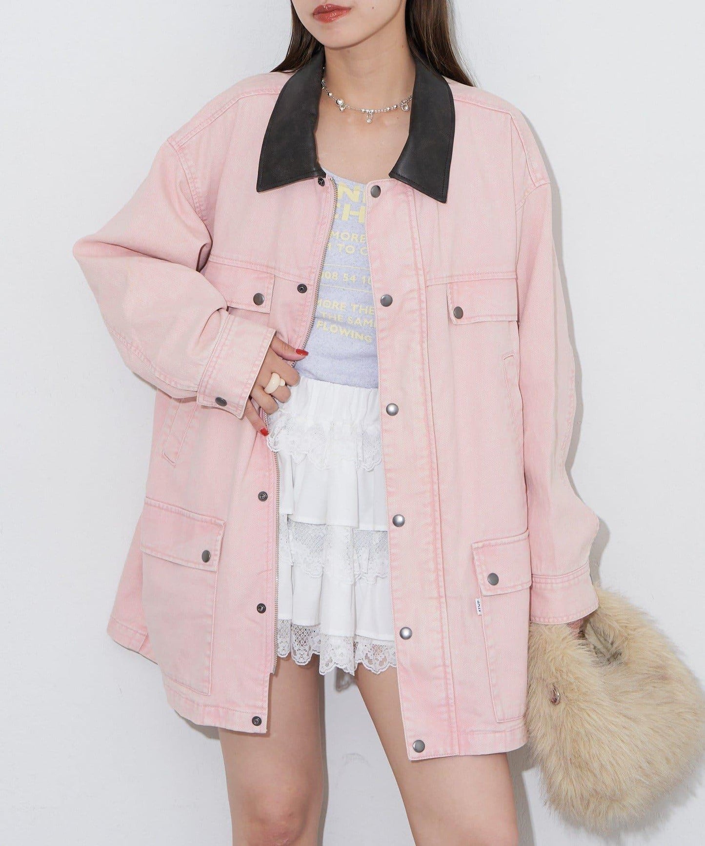 牛仔獵裝夾克,工裝風格,皮質衣領更顯品位。