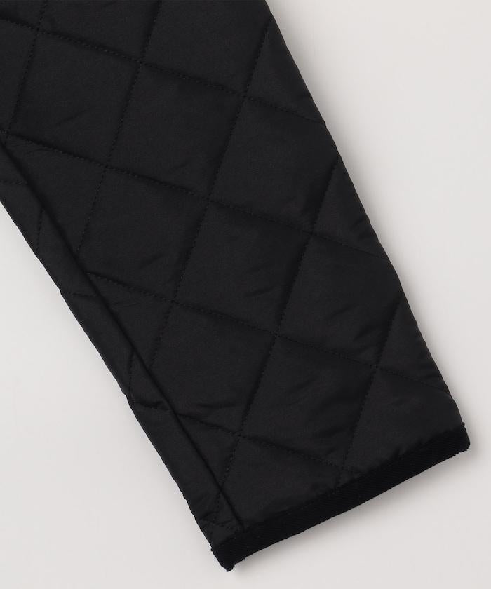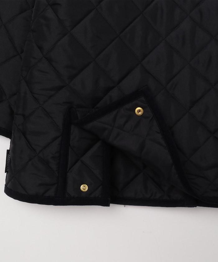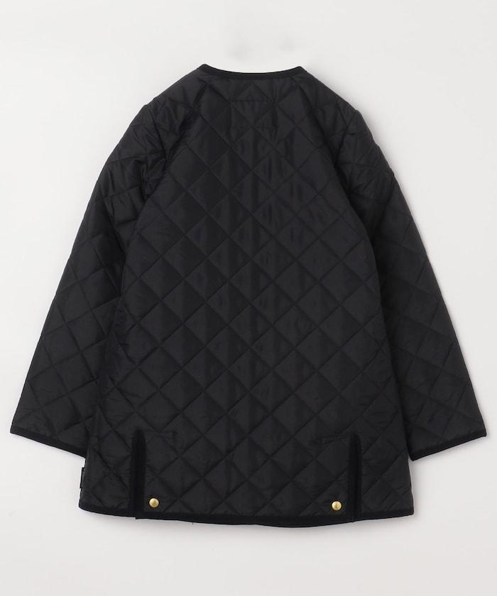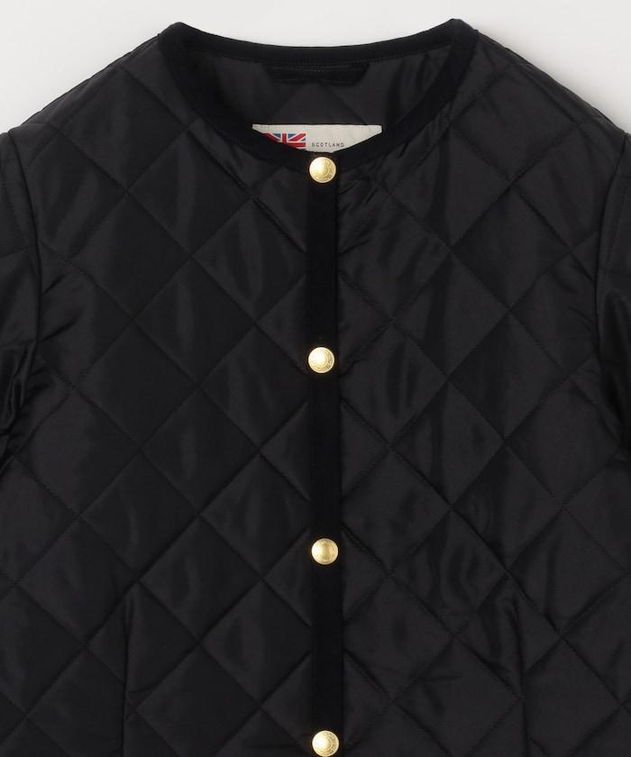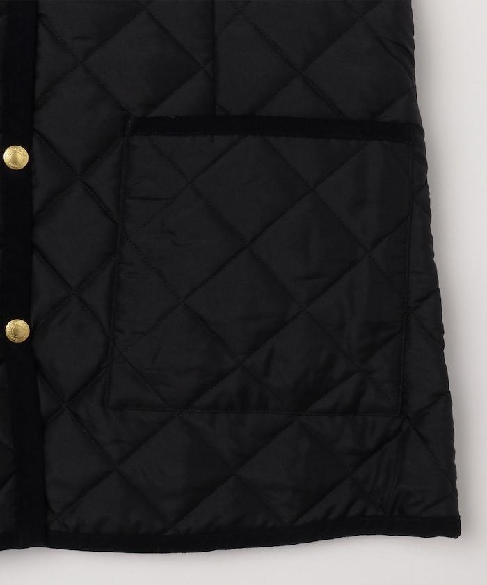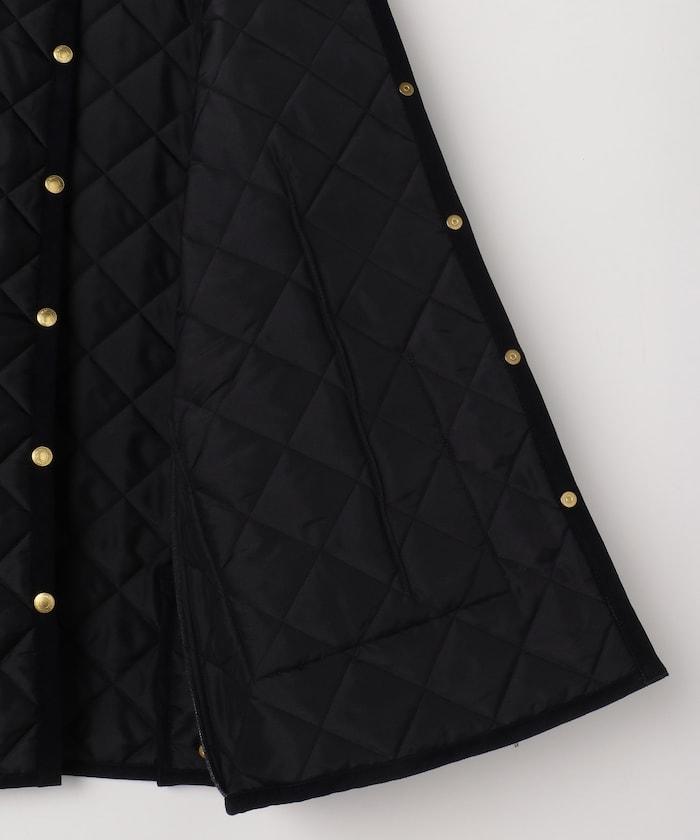 中長款無領絎縫夾克,精緻的燈芯絨滾邊和溫暖的金色圓點紐扣營造出奢華的氛圍。