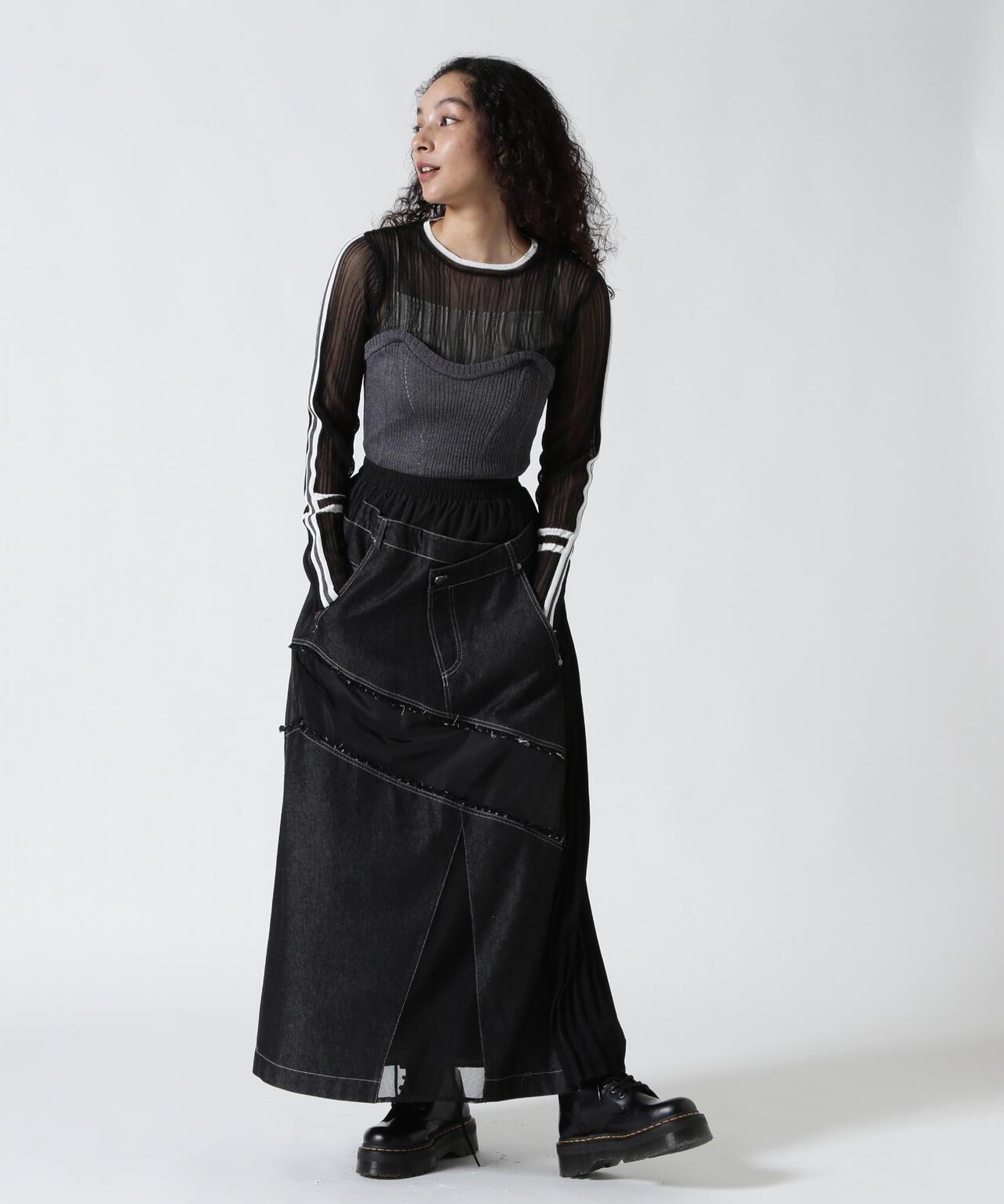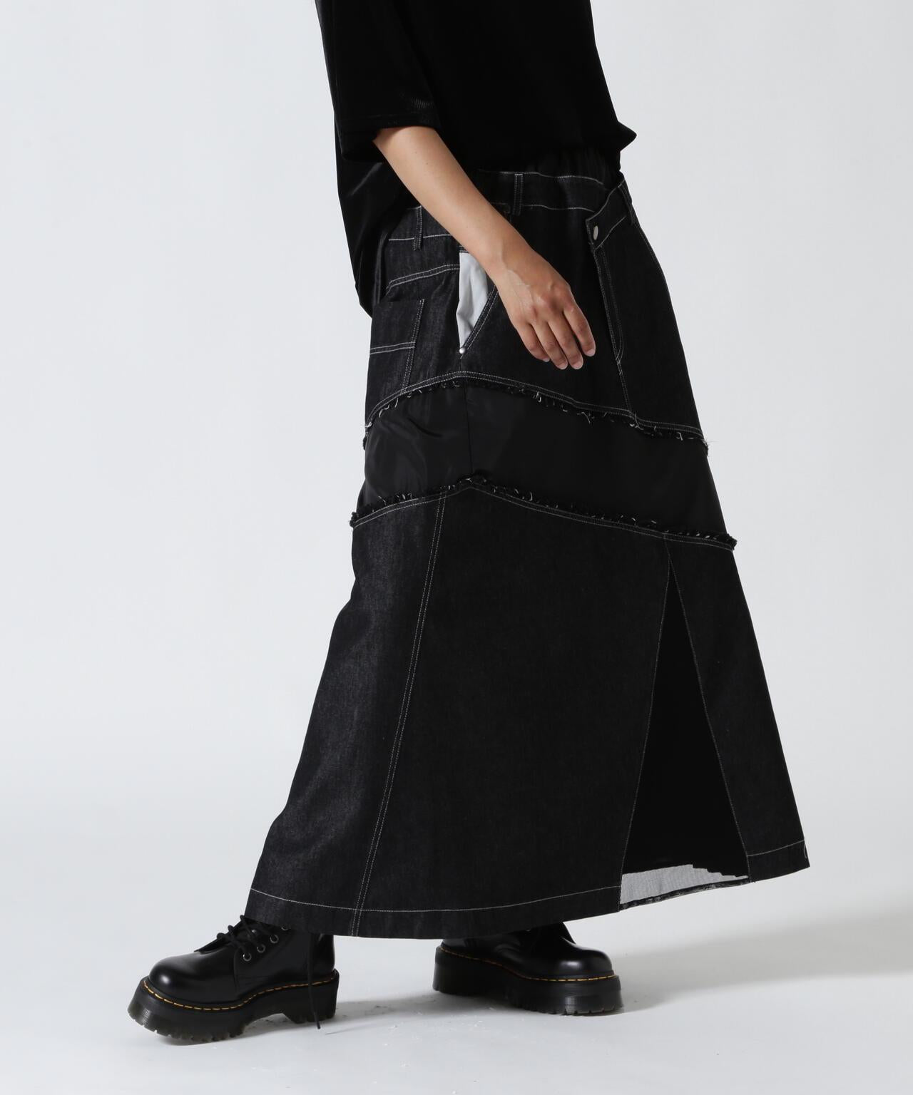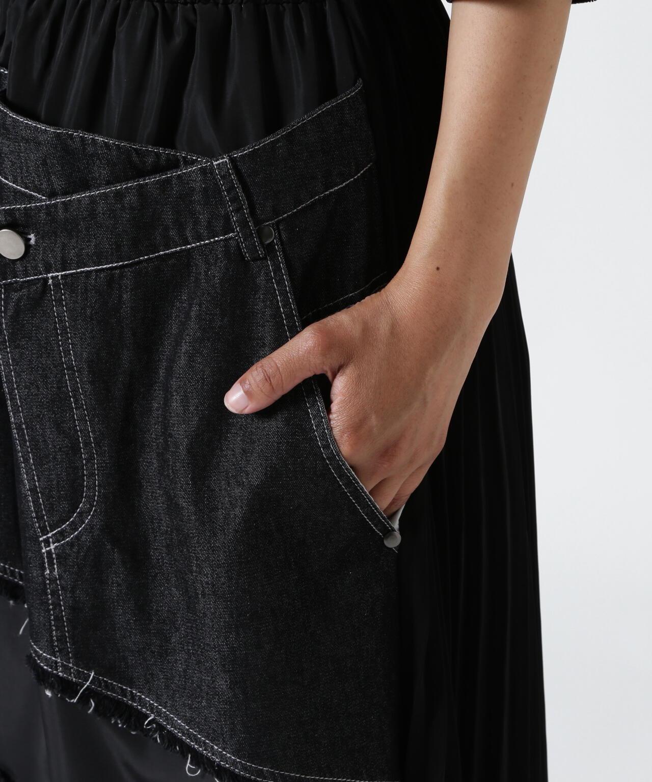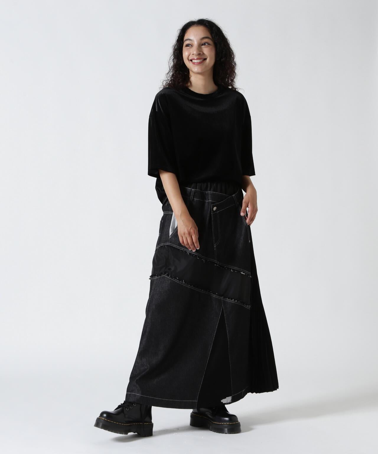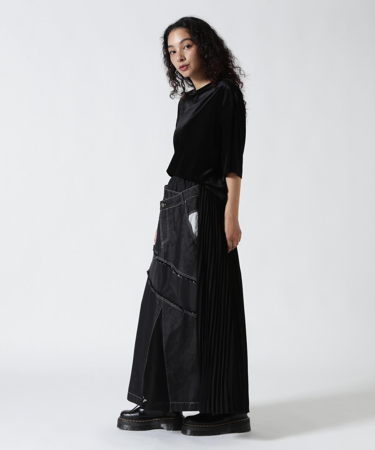 這款搶眼的裙子主要由輕質牛仔布製成,經過對角線剪裁和翻新,看起來就像由不同的材料製成。多層次的腰部採用鬆緊設計,穿起來毫無壓力,也可作為超短裙穿在腰間或下垂至胯骨部位。極具衝擊力的設計使其易於搭配簡潔的上衣。襯裡是棉質光滑型,即使在出汗的季節也不會粘在身上。與直排式相比,材質有所改變,特別訂製了灰色縫線的黑色款。尺寸也比直排式更小巧,因此直排式的 0 在這裡變成了 1 的大小。AULA AILA] 獨特的風格。