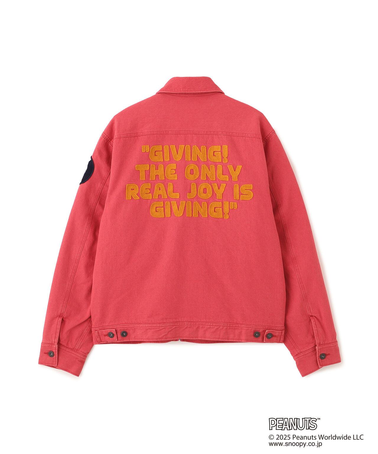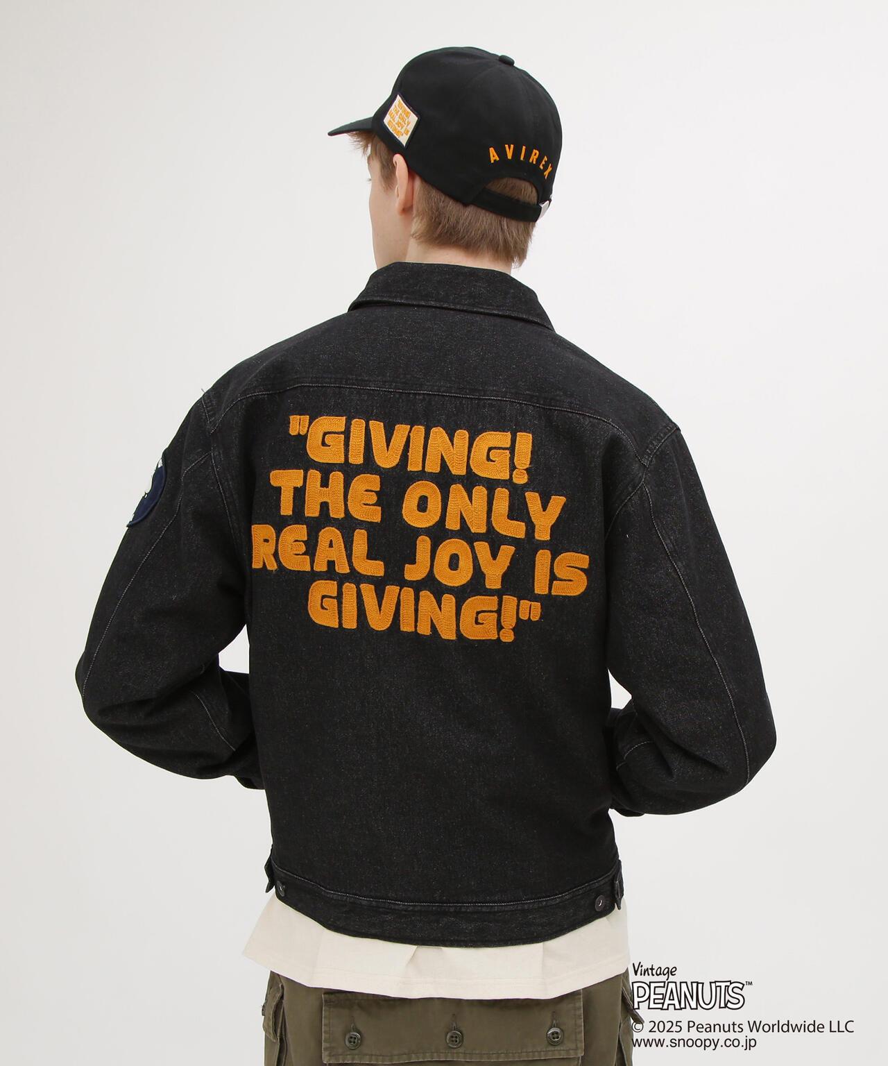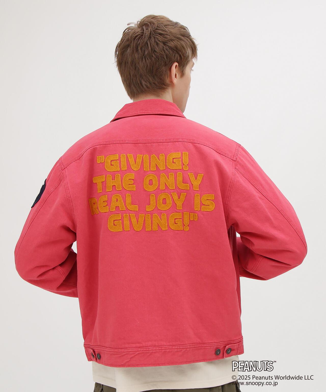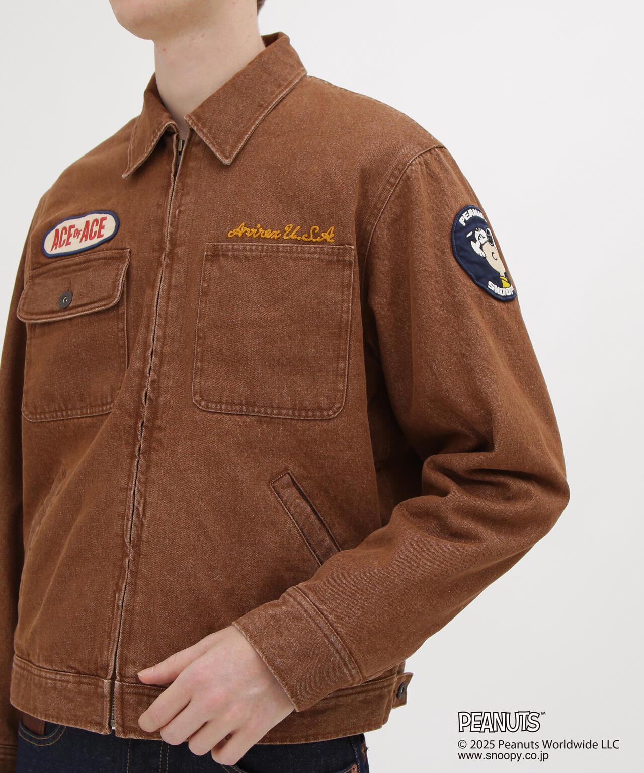 花生漫畫》(PEANUTS)是一部風靡全球的連環畫,至今仍在全球 75 個國家、21 種語言的 2200 份報紙上連載。該系列以漫畫中可愛的人物史努比和他的朋友們為主題,採用復古藝術印花和刺繡的形式,並融入了 AVIREX 的流行產品中,成為原創設計系列商品。該款以 AVIREX 經銷的👍工作夾克為原型,右胸有 "ACE☆ACE "的徽標貼布,左胸有品牌徽標刺繡,左袖有史努比和查理-布朗的貼布,背面有 "GIVING!背面繡有 "ONLY REAL JOY IS GIVING!"字樣。