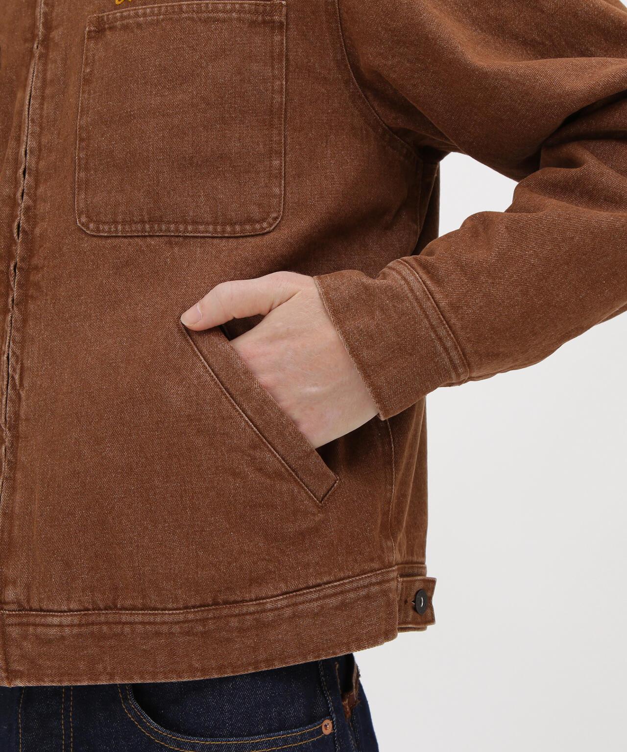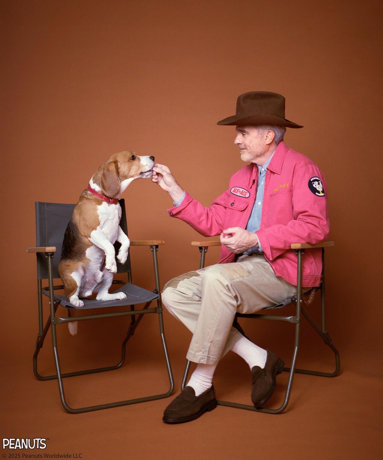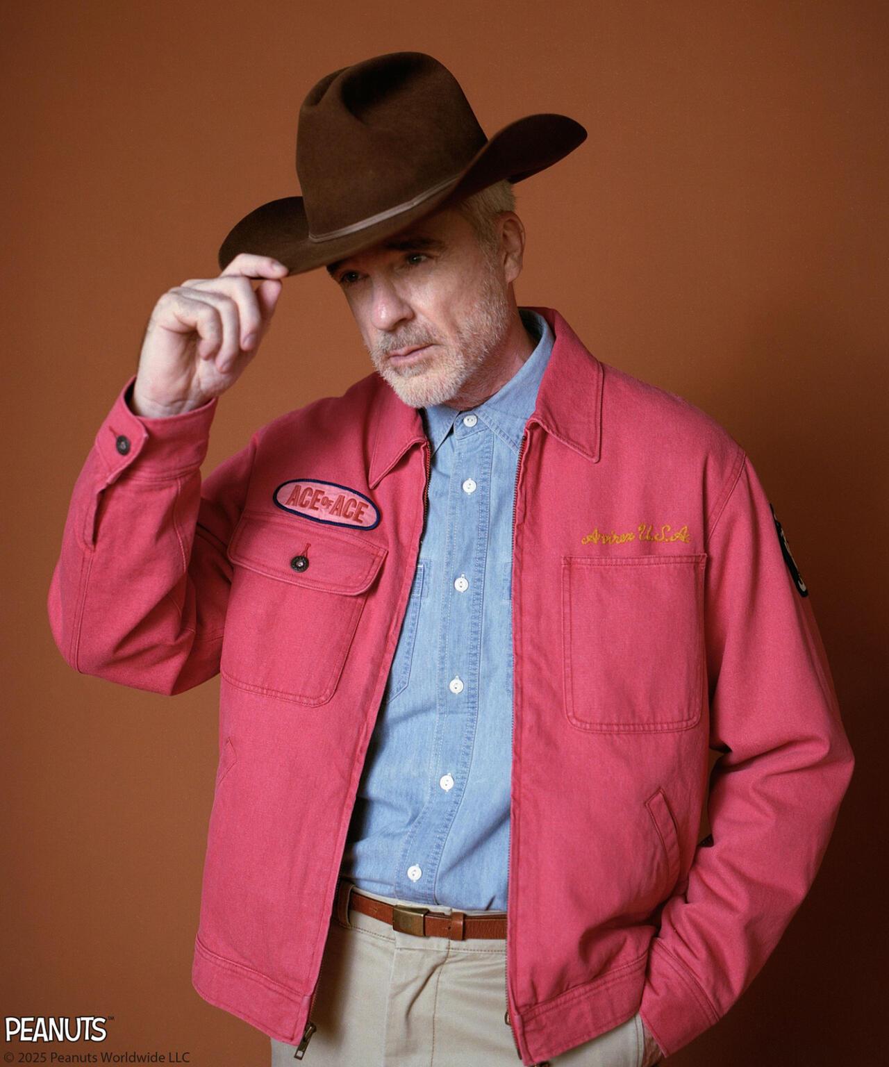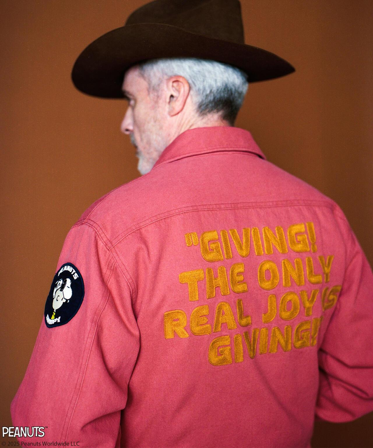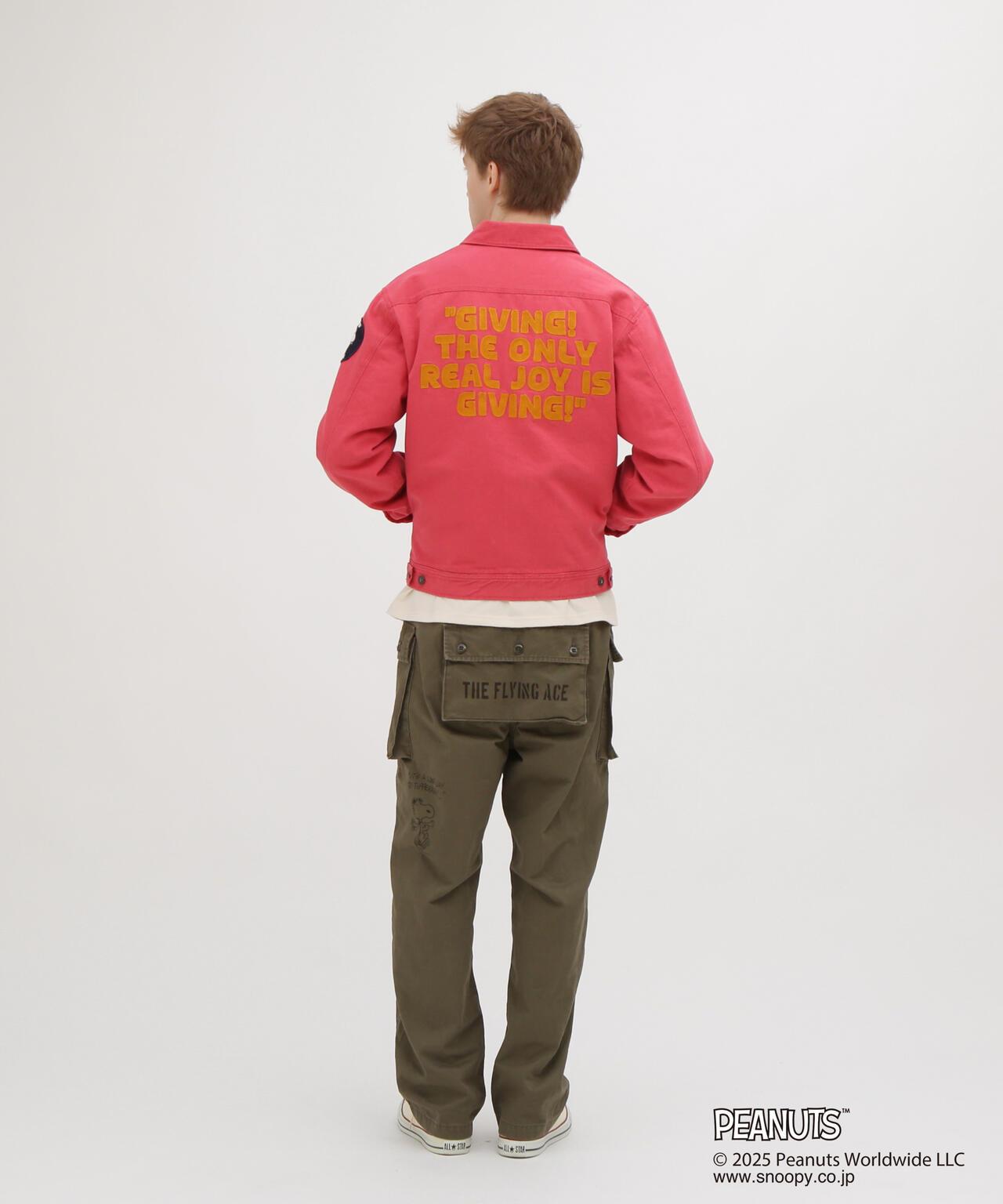 花生漫畫》(PEANUTS)是一部風靡全球的連環畫,至今仍在全球 75 個國家、21 種語言的 2200 份報紙上連載。該系列以漫畫中可愛的人物史努比和他的朋友們為主題,採用復古藝術印花和刺繡的形式,並融入了 AVIREX 的流行產品中,成為原創設計系列商品。該款以 AVIREX 經銷的👍工作夾克為原型,右胸有 "ACE☆ACE "的徽標貼布,左胸有品牌徽標刺繡,左袖有史努比和查理-布朗的貼布,背面有 "GIVING!背面繡有 "ONLY REAL JOY IS GIVING!"字樣。
