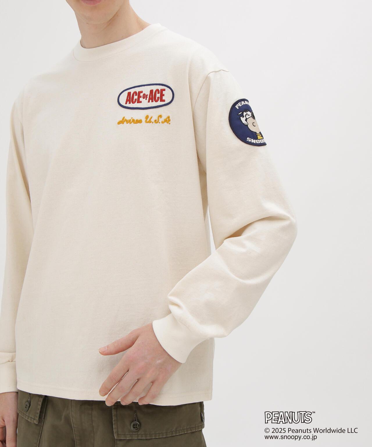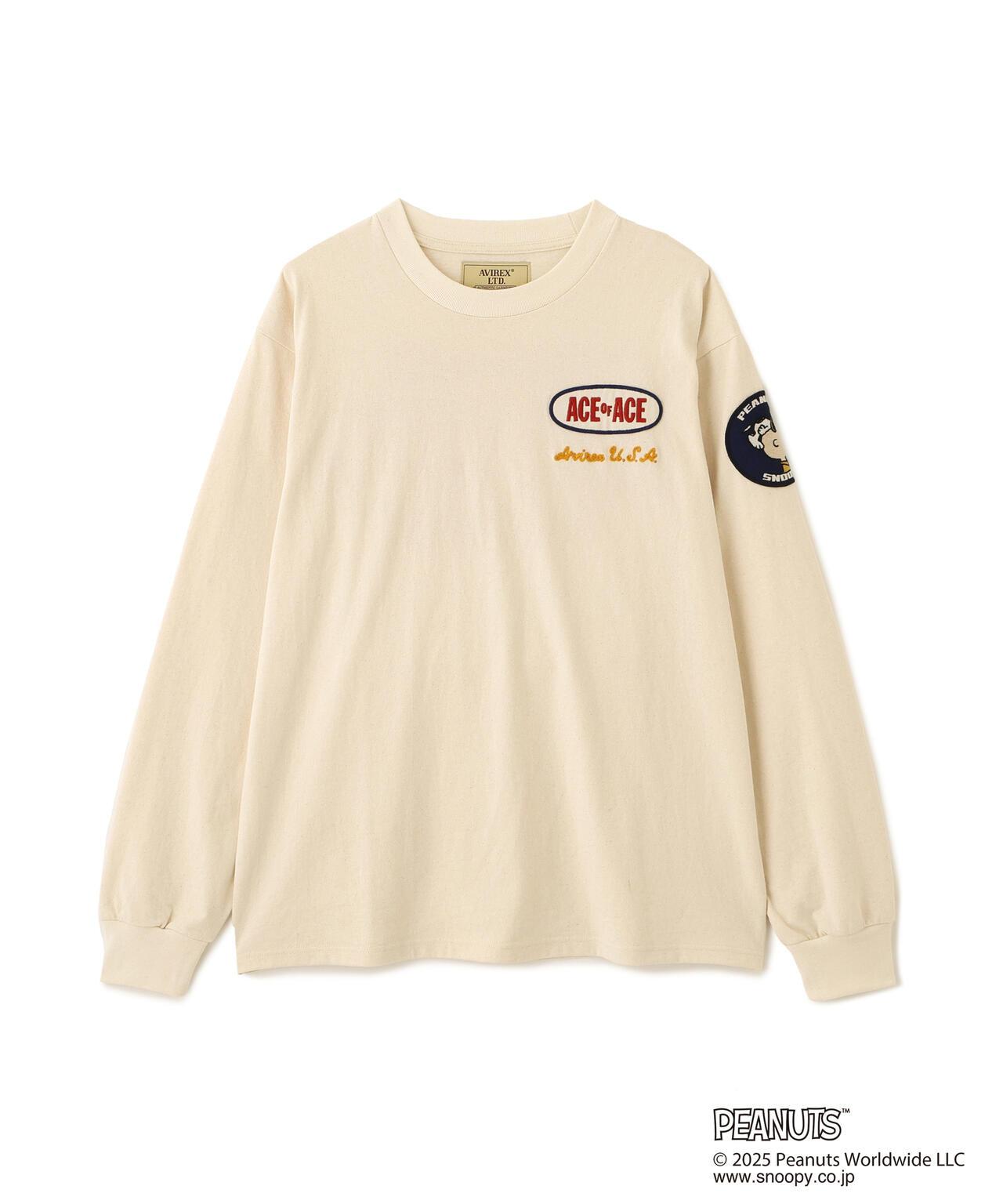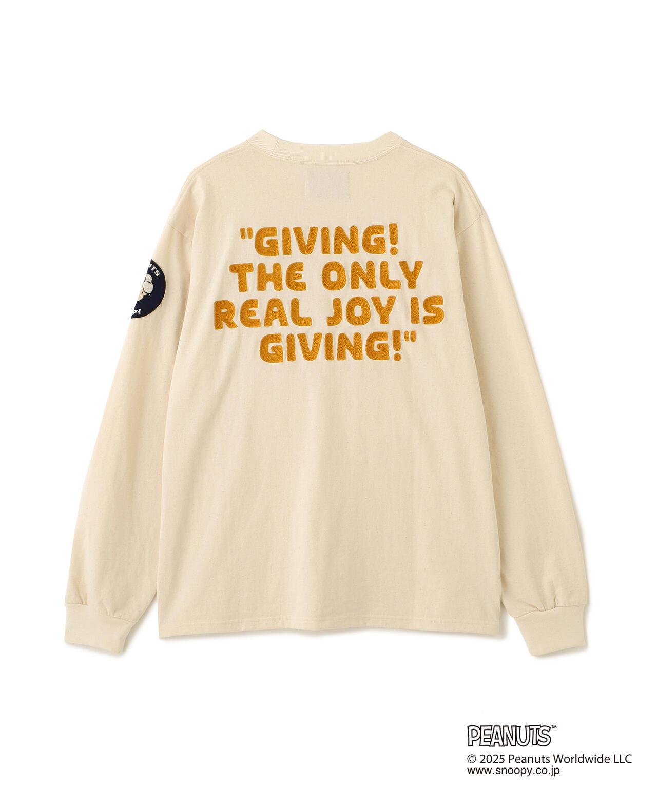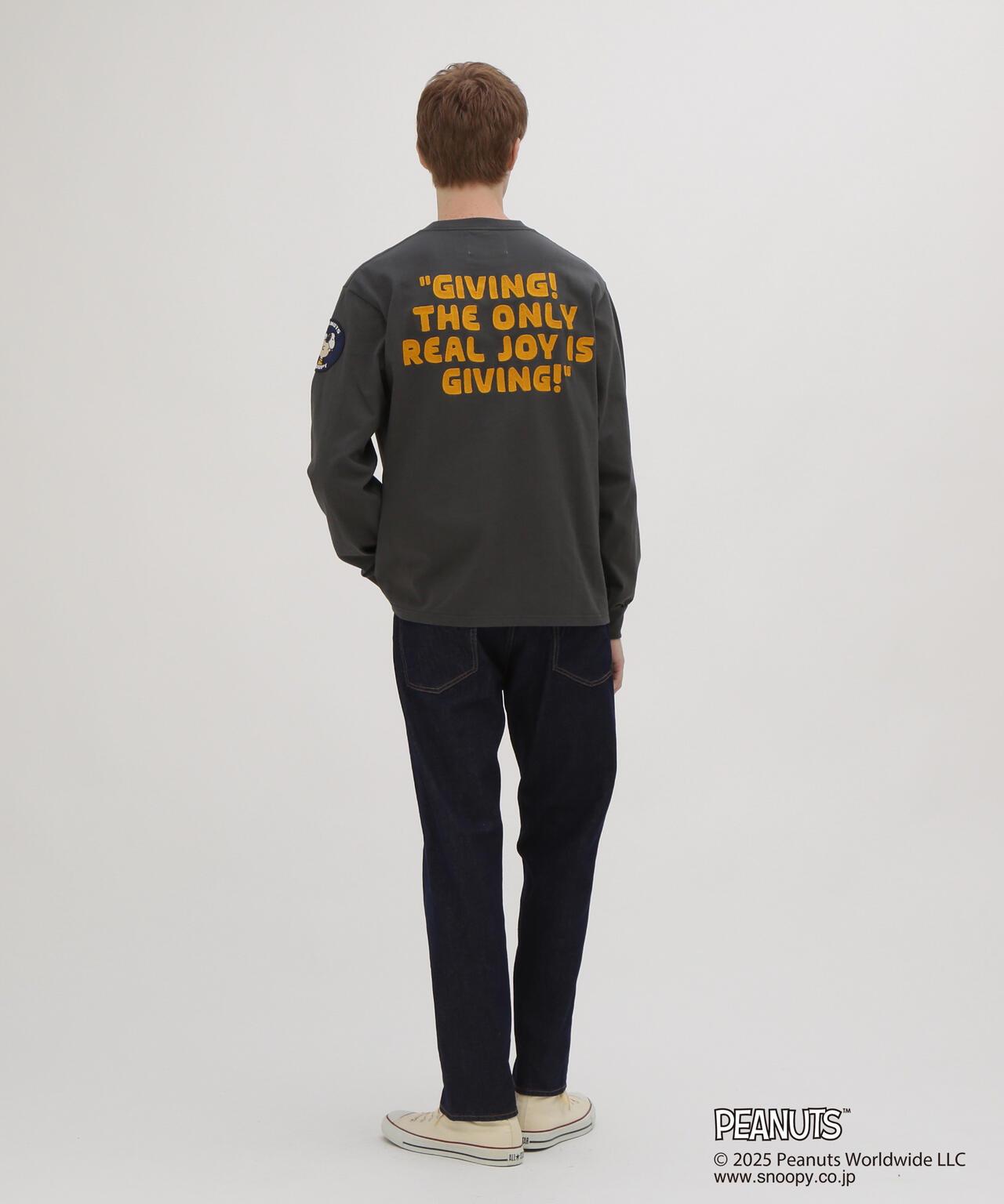 花生漫畫》(PEANUTS)是一部風靡全球的連環畫,至今仍在全球 75 個國家的 2200 家報紙上連載,使用 21 種語言。漫畫中可愛的人物史努比和他的朋友們通過復古藝術印花和刺繡表現出來,並以原創設計融入到 AVIREX 系列的流行產品中。這件長袖 T 恤融合了史努比可愛的世界觀,正面印有 AVIREX 軍用補丁式徽標貼片,左袖印有史努比和查理-布朗,並繡有 "GIVING!GIVING!" 字樣繡在背面。