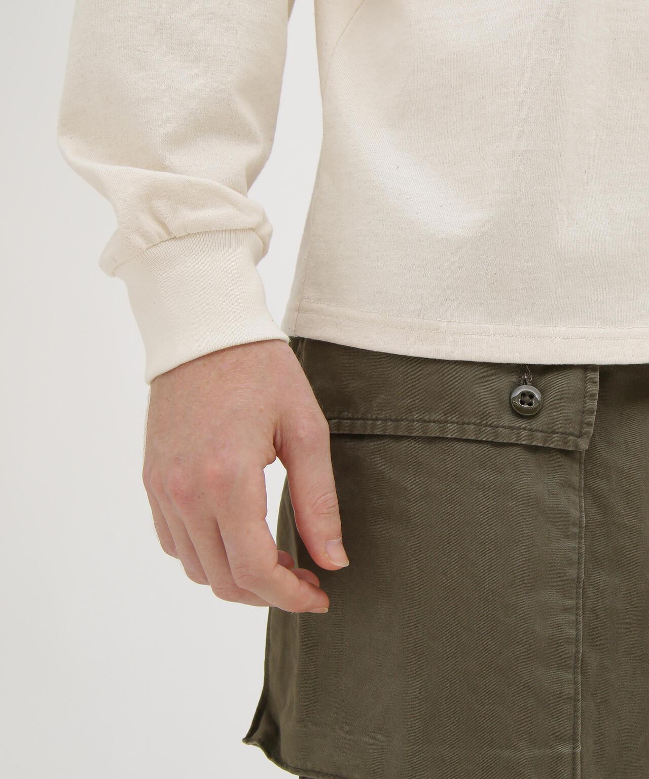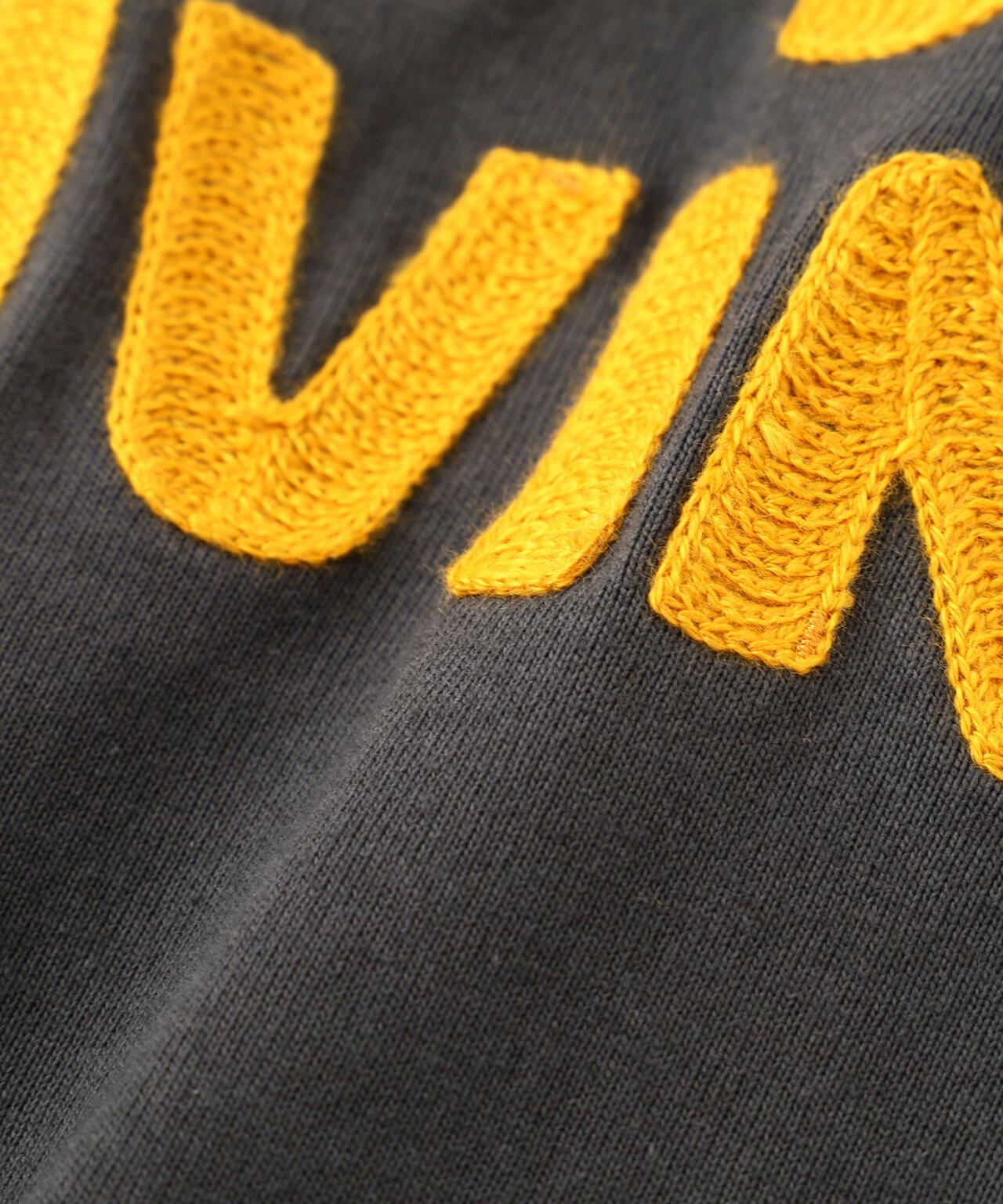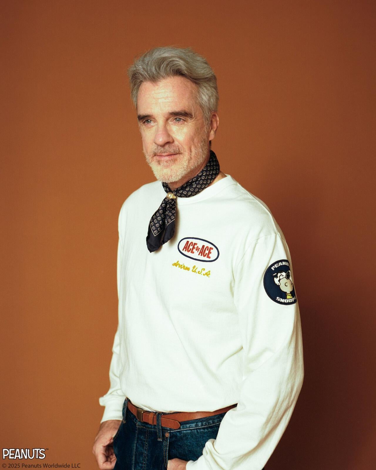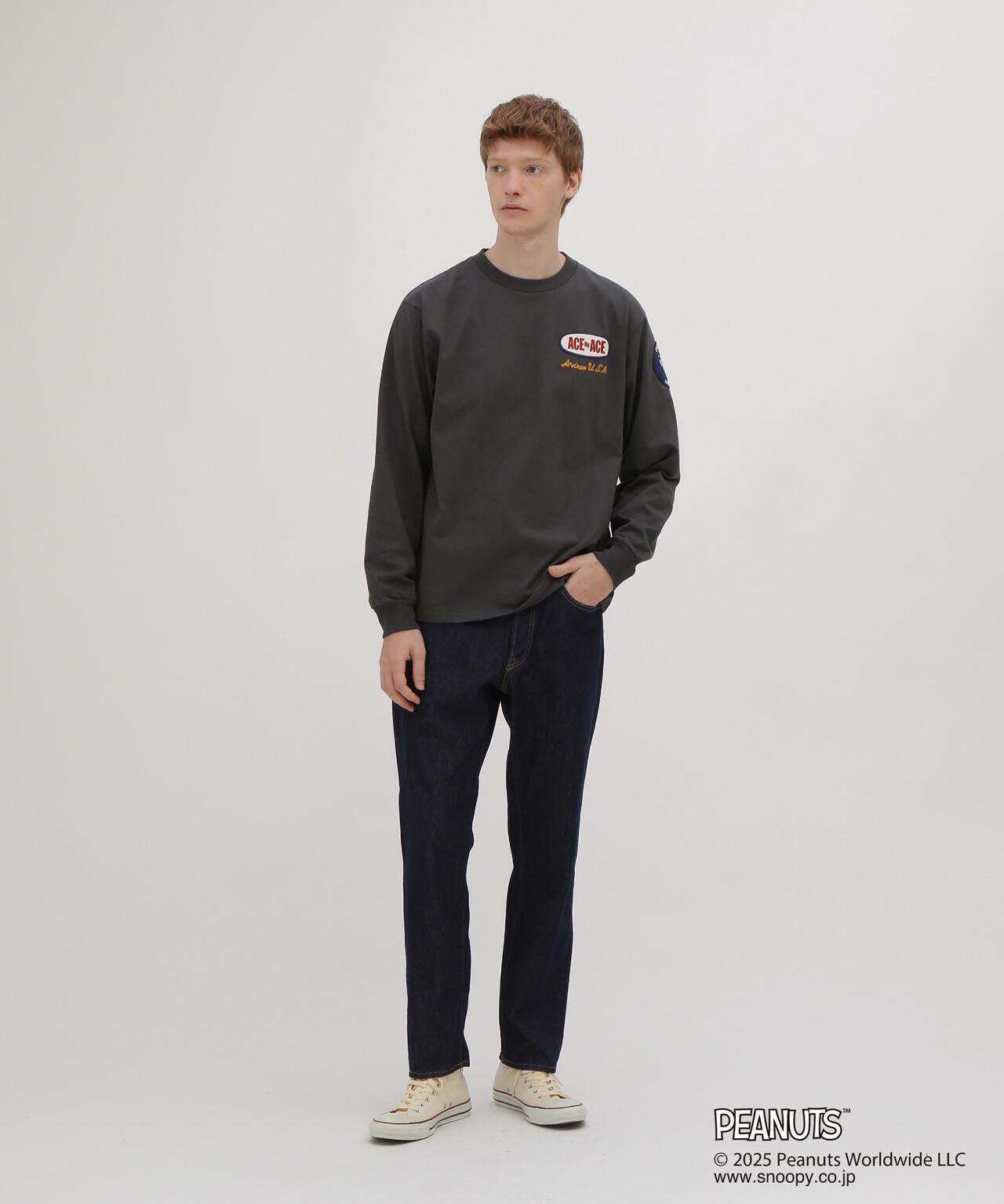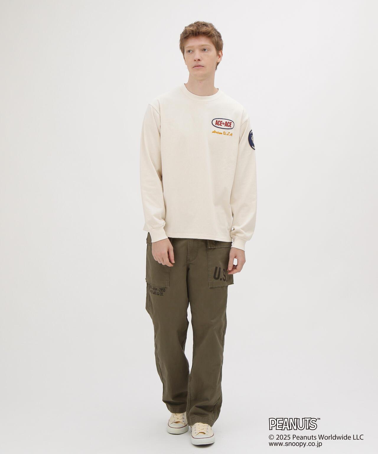 花生漫畫》(PEANUTS)是一部風靡全球的連環畫,至今仍在全球 75 個國家的 2200 家報紙上連載,使用 21 種語言。漫畫中可愛的人物史努比和他的朋友們通過復古藝術印花和刺繡表現出來,並以原創設計融入到 AVIREX 系列的流行產品中。這件長袖 T 恤融合了史努比可愛的世界觀,正面印有 AVIREX 軍用補丁式徽標貼片,左袖印有史努比和查理-布朗,並繡有 "GIVING!GIVING!" 字樣繡在背面。