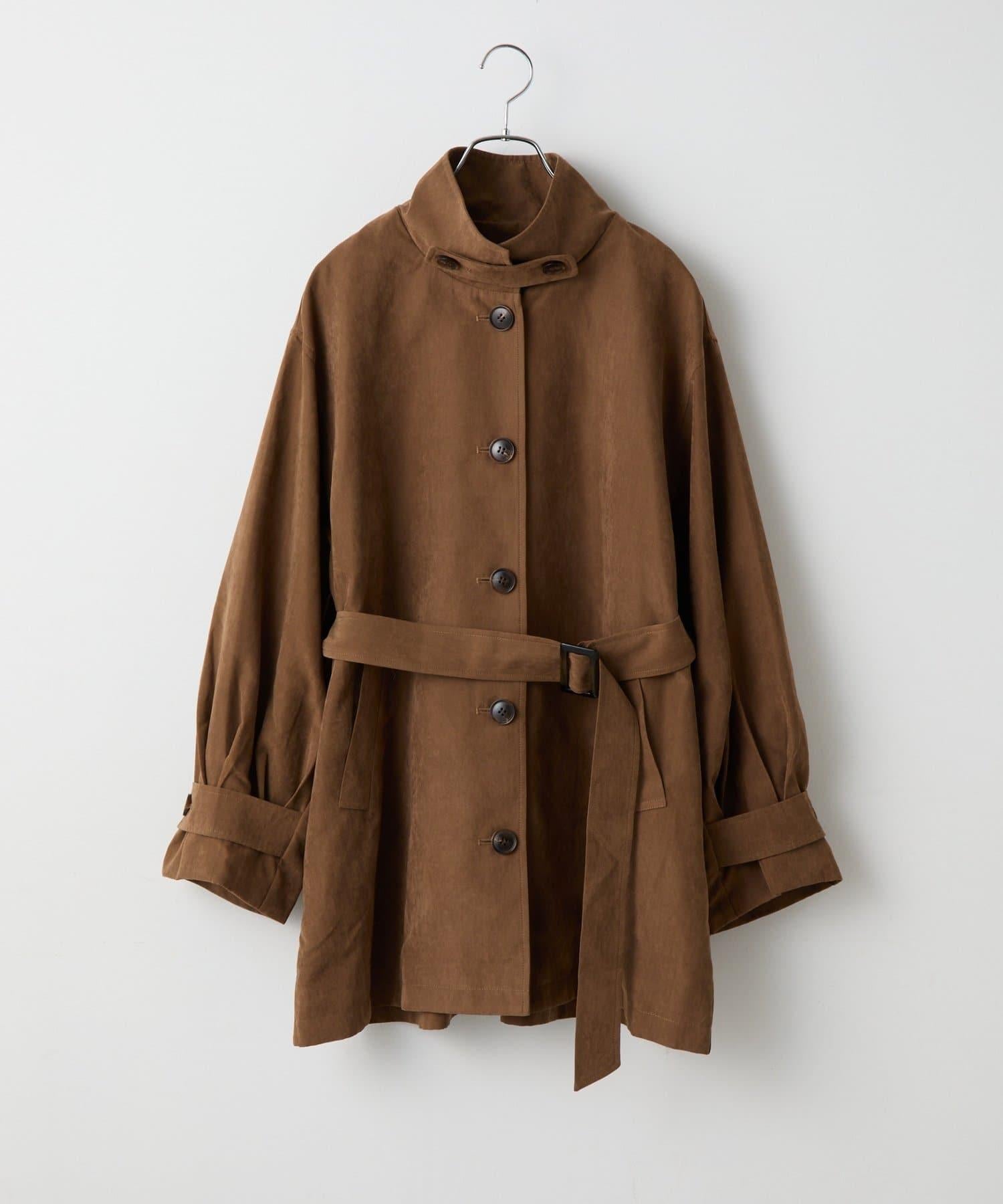 這款中款風衣採用略帶拉毛的桃皮材質製成,具有優雅的光澤和柔軟的觸感。