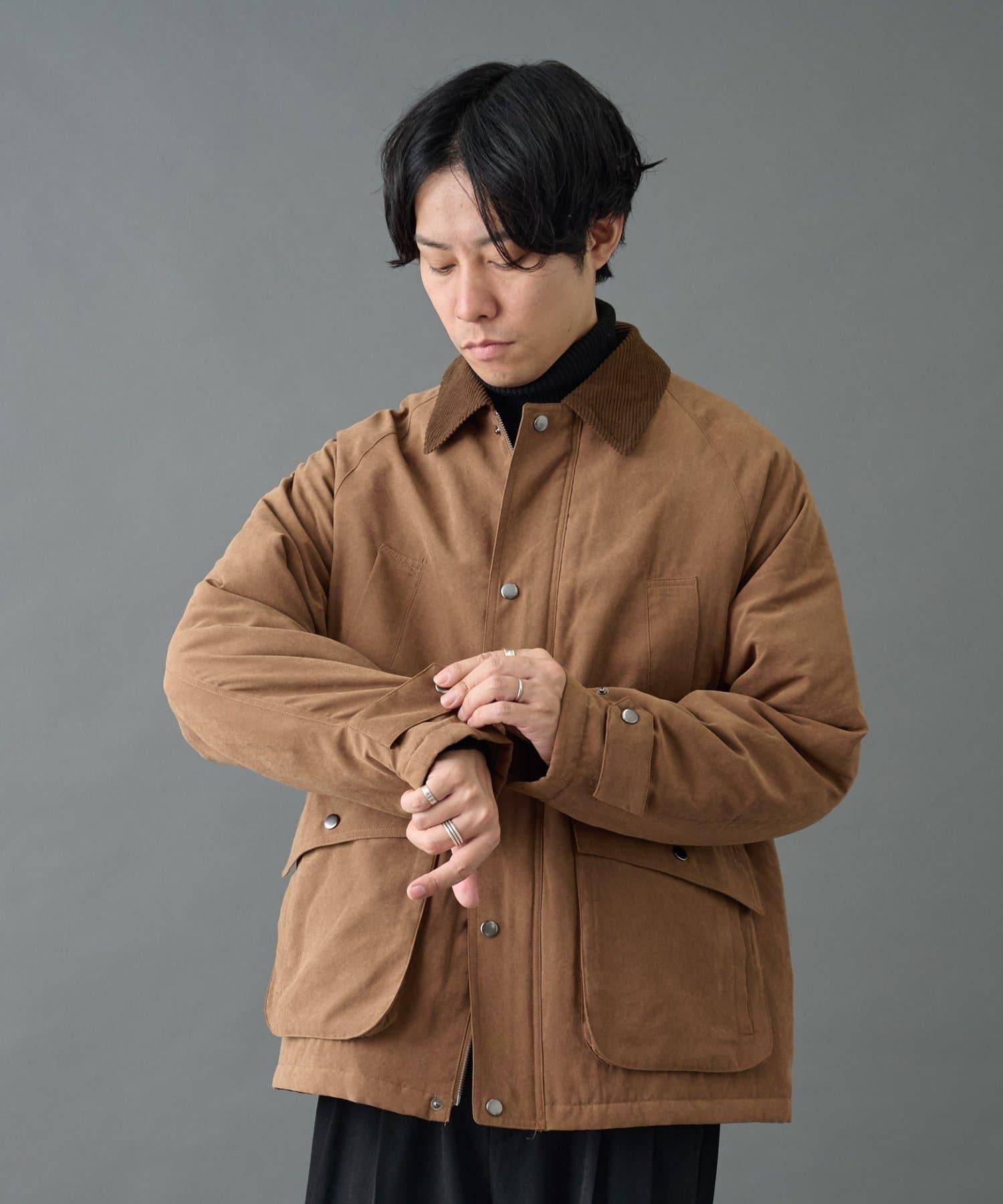 這款狩獵夾克的頸部飾有燈芯絨開關。