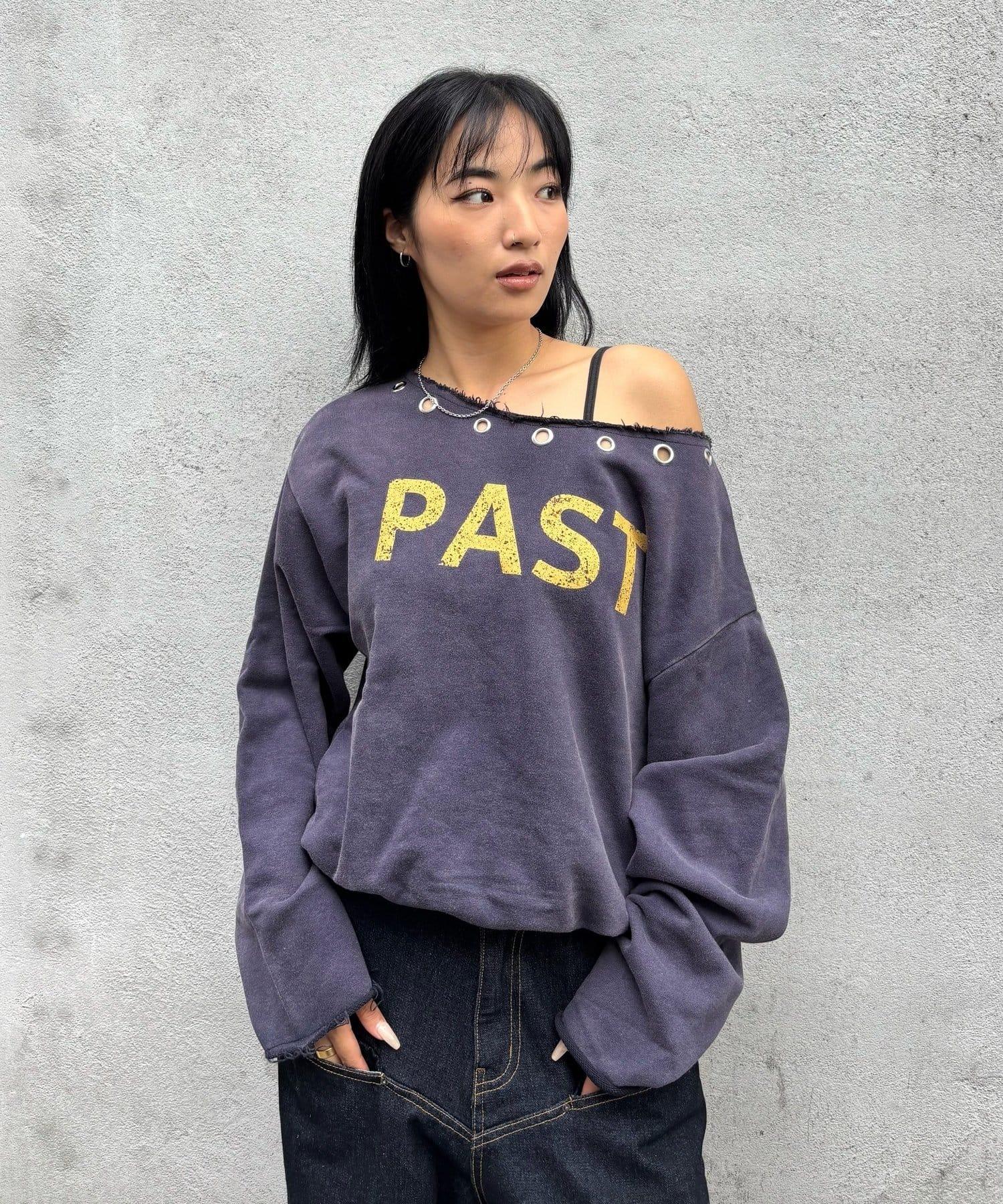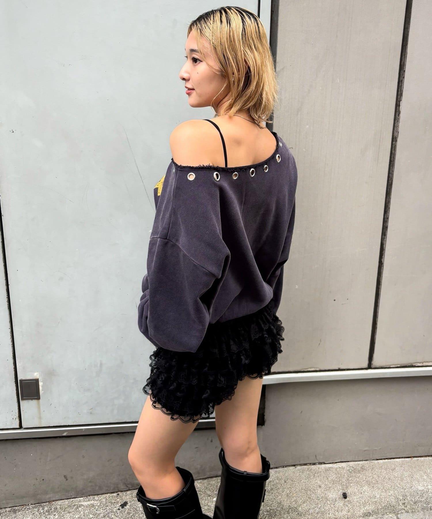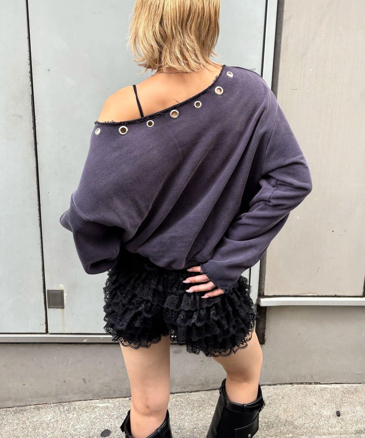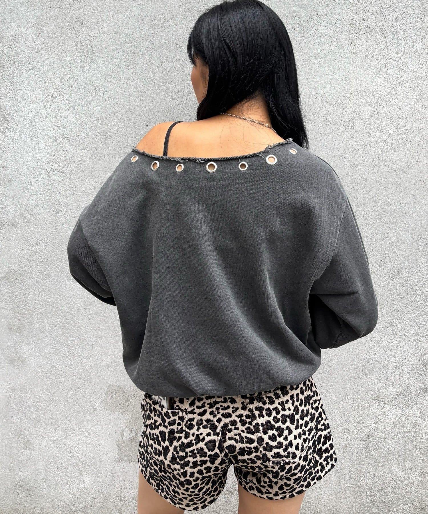 【AW】金屬孔裝飾一字肩標誌衛衣