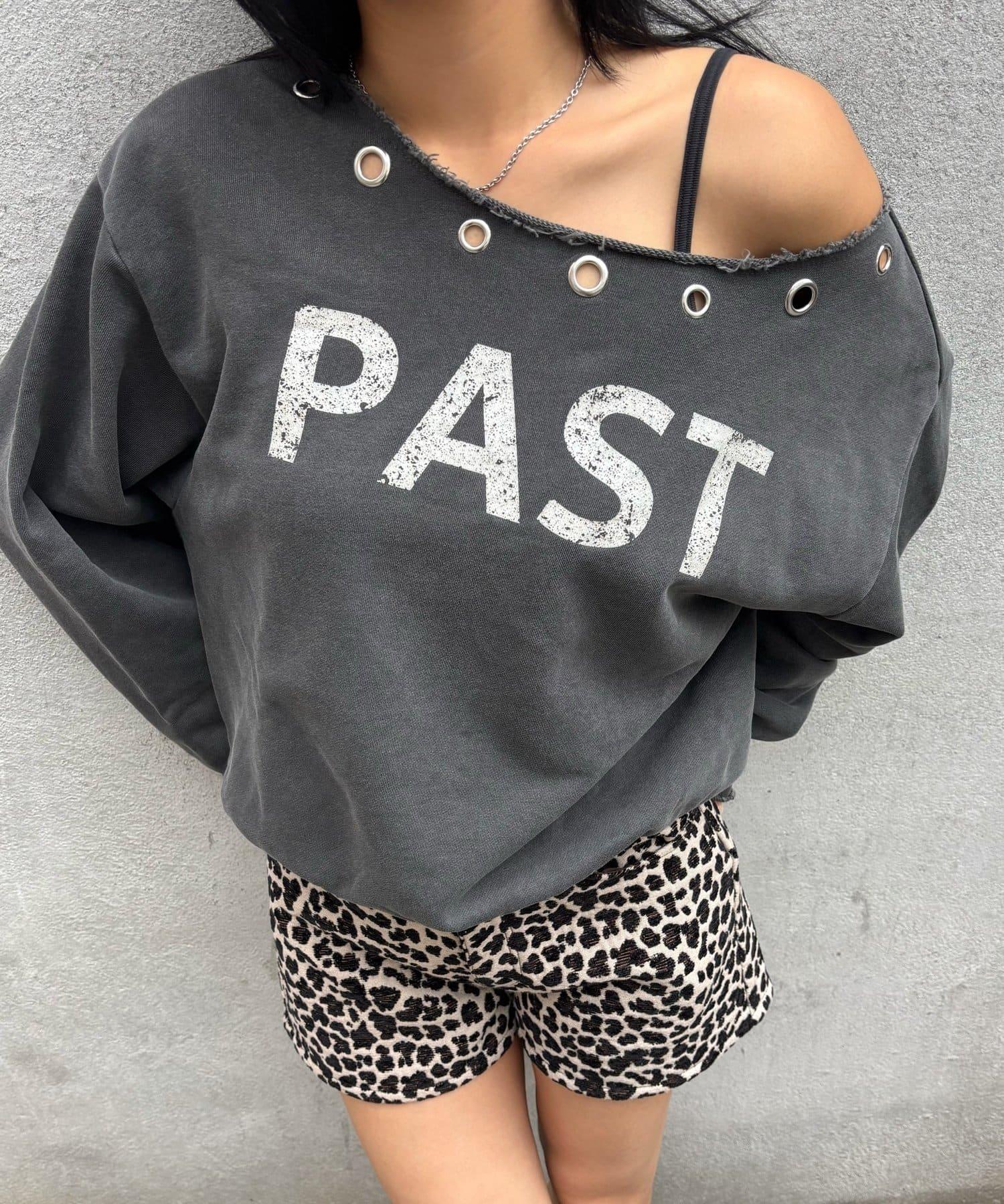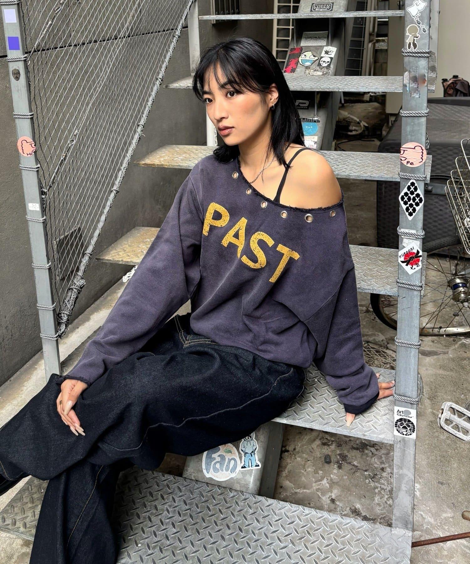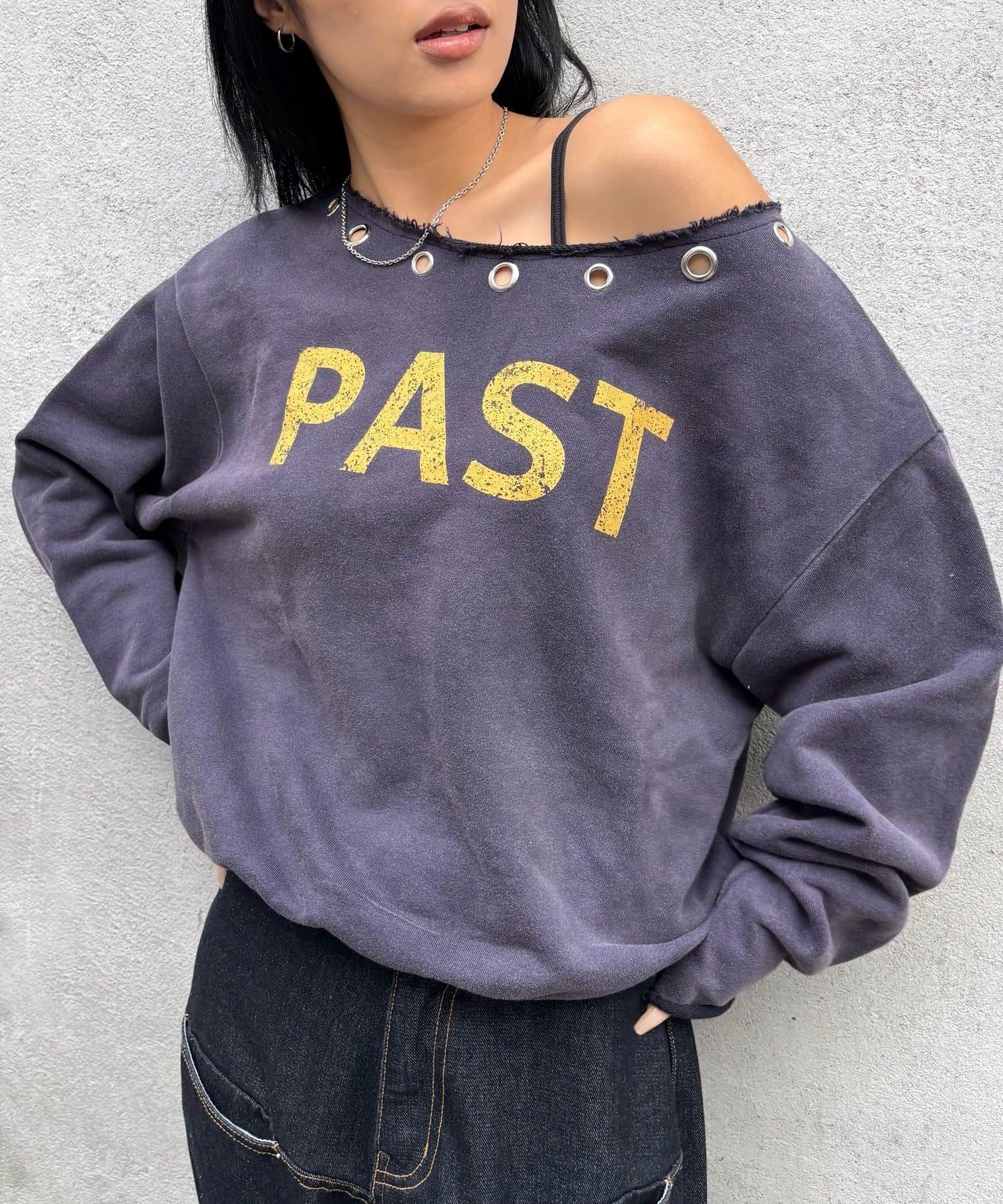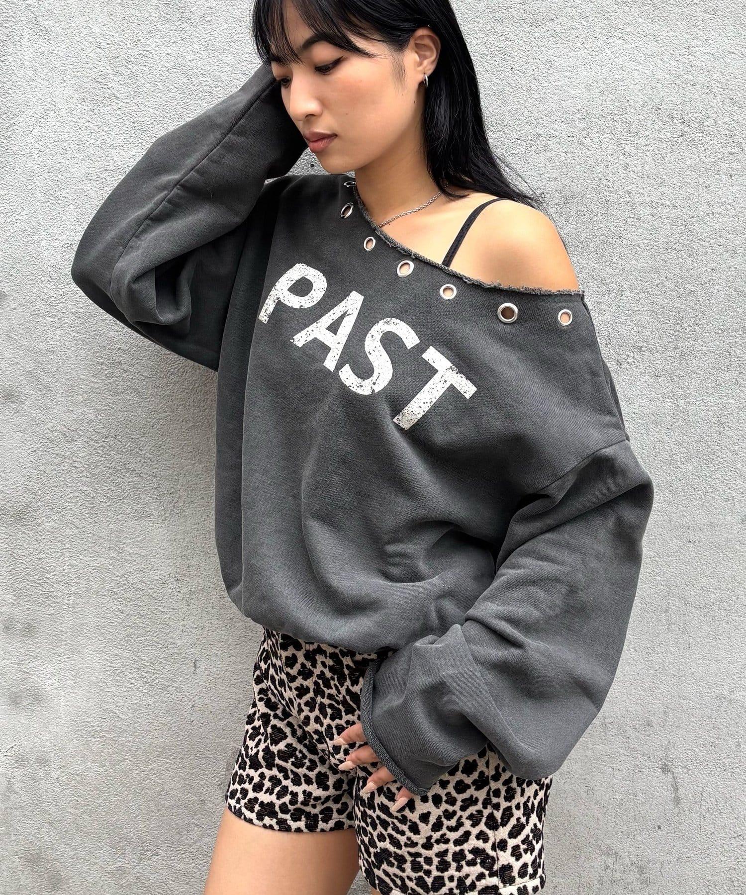 【AW】金屬孔裝飾一字肩標誌衛衣