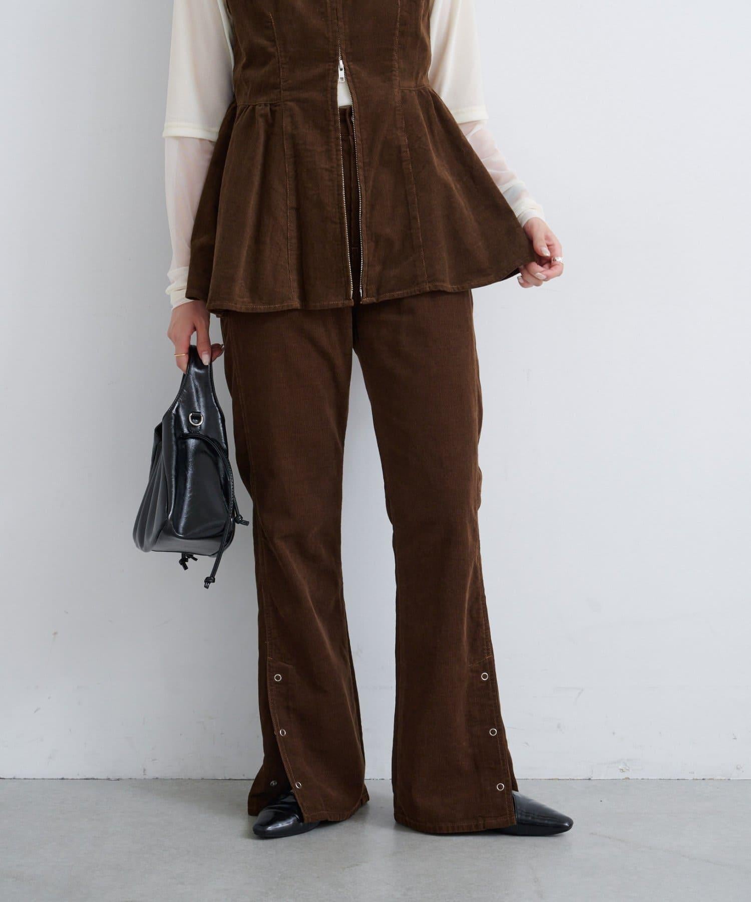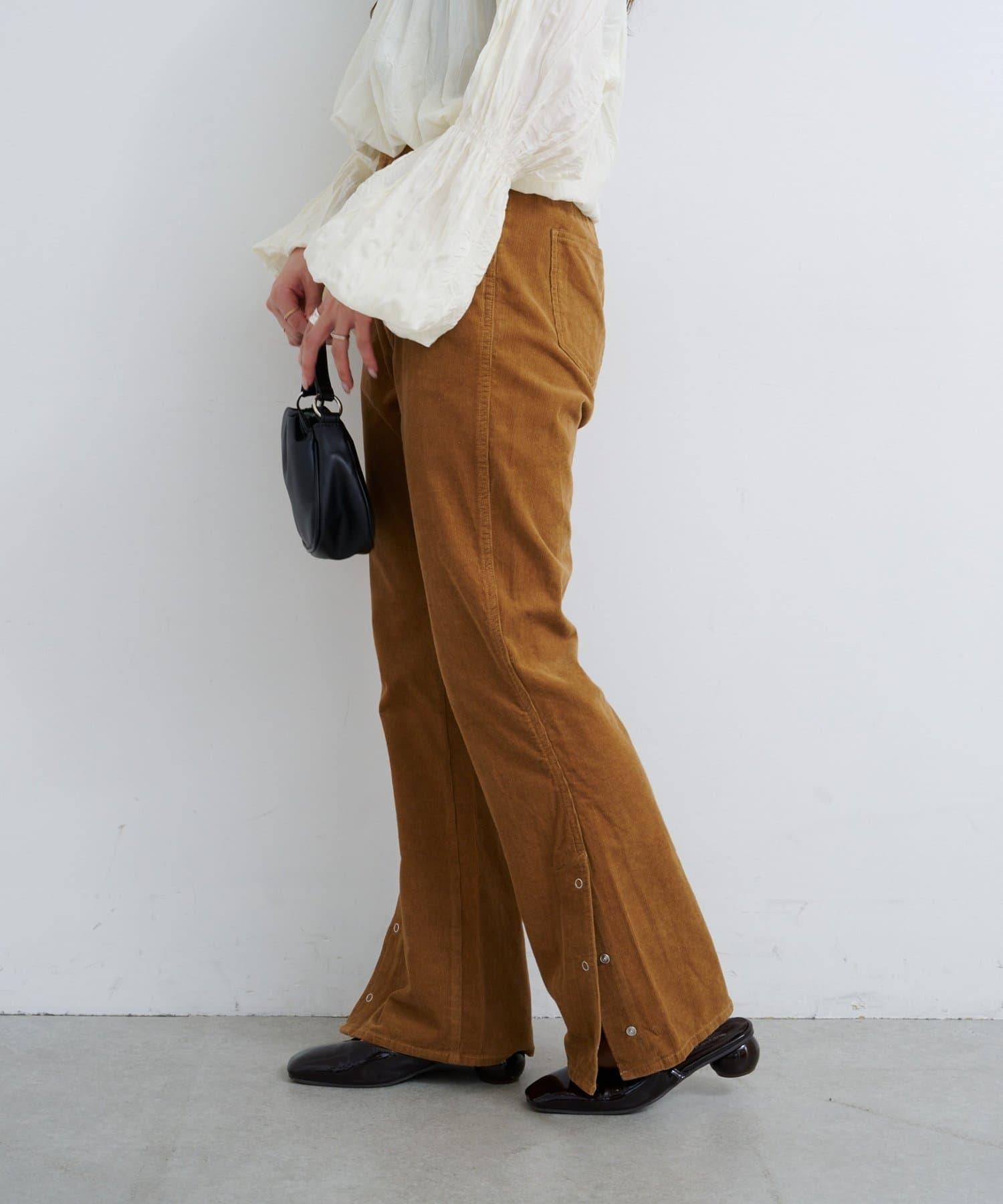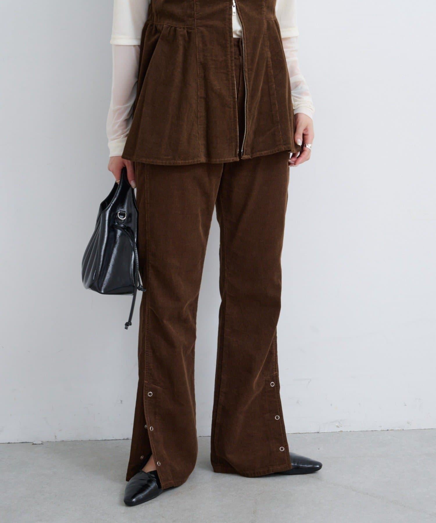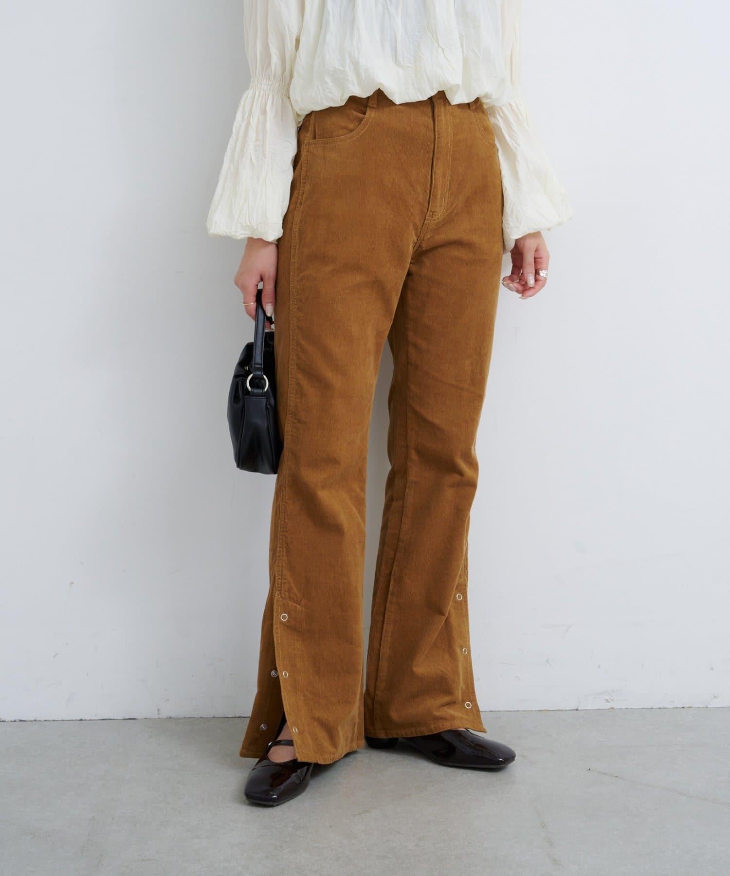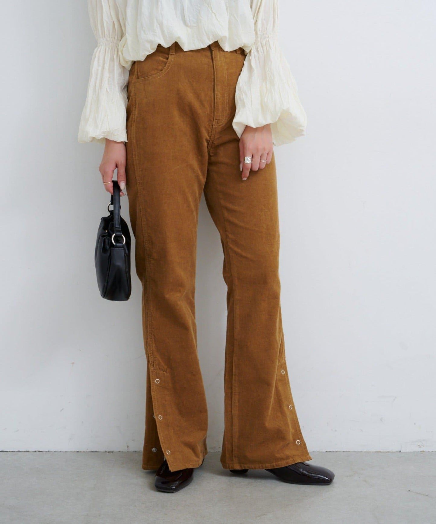當季流行的燈芯絨長褲,開衩寬鬆,與眾不同。