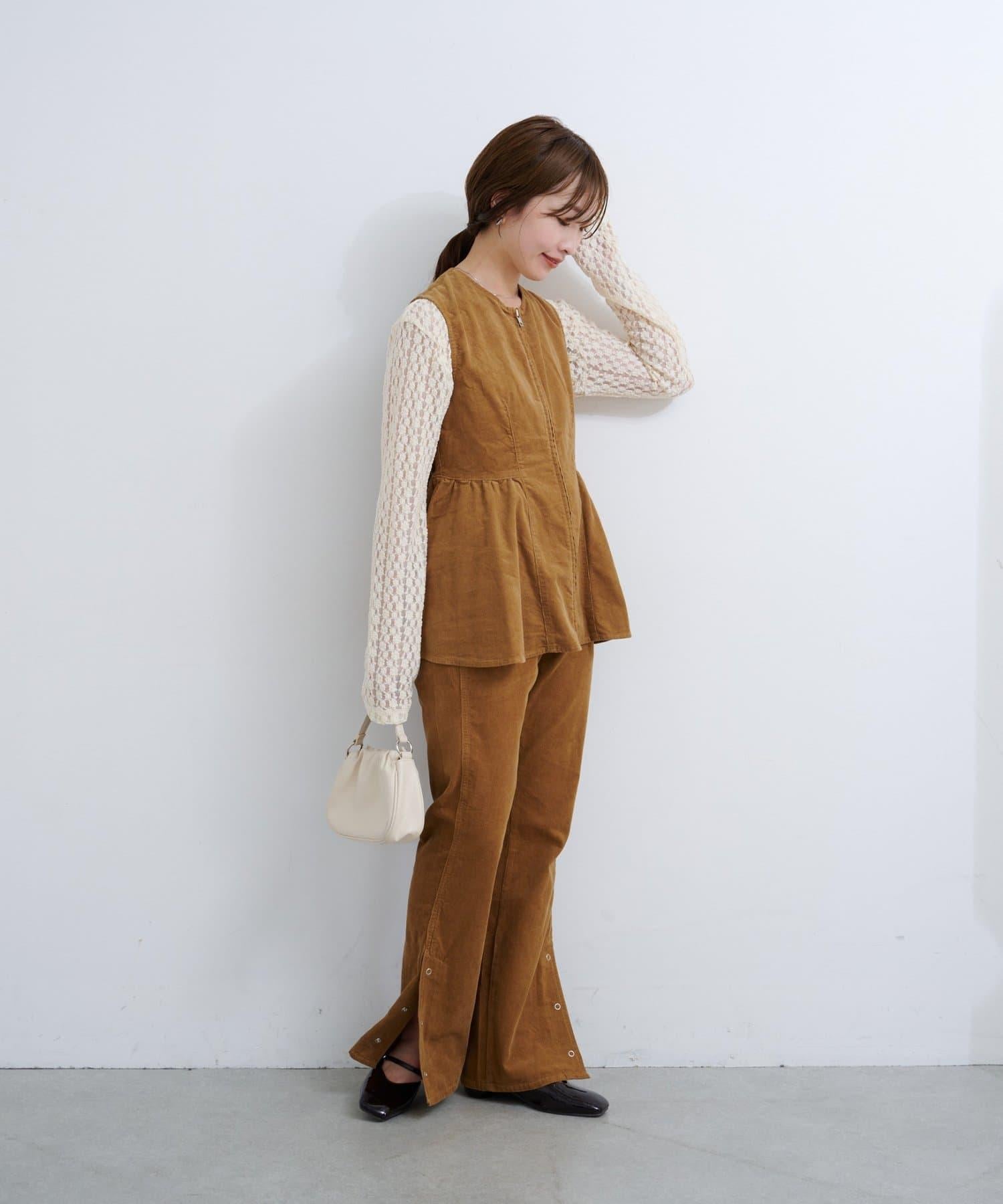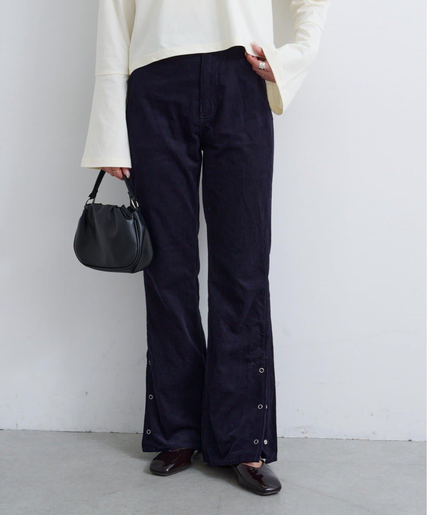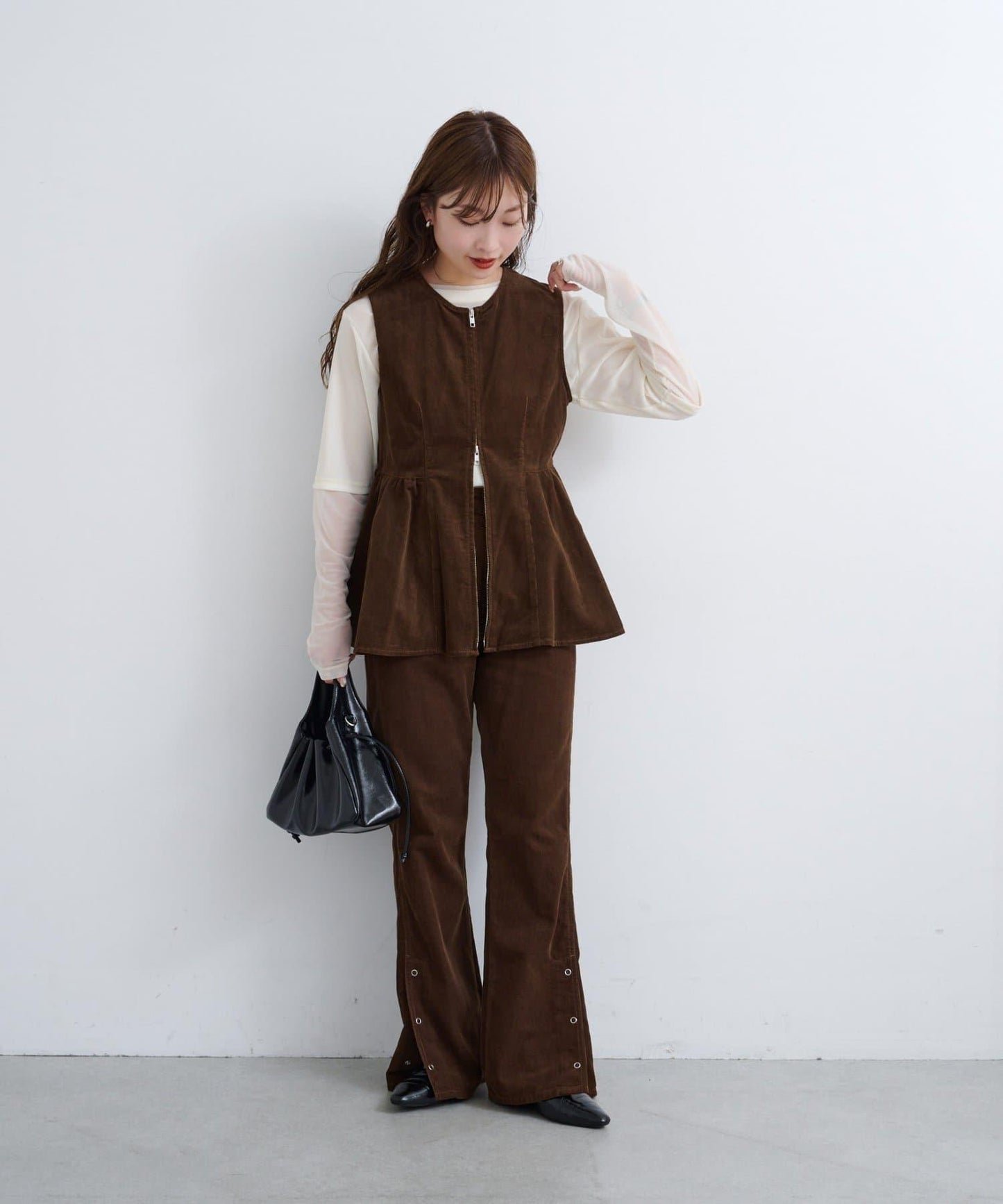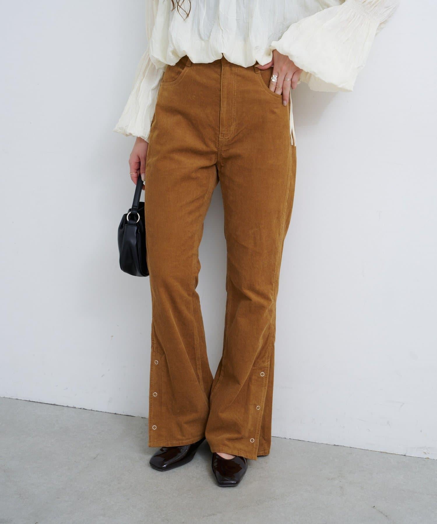 當季流行的燈芯絨長褲,開衩寬鬆,與眾不同。