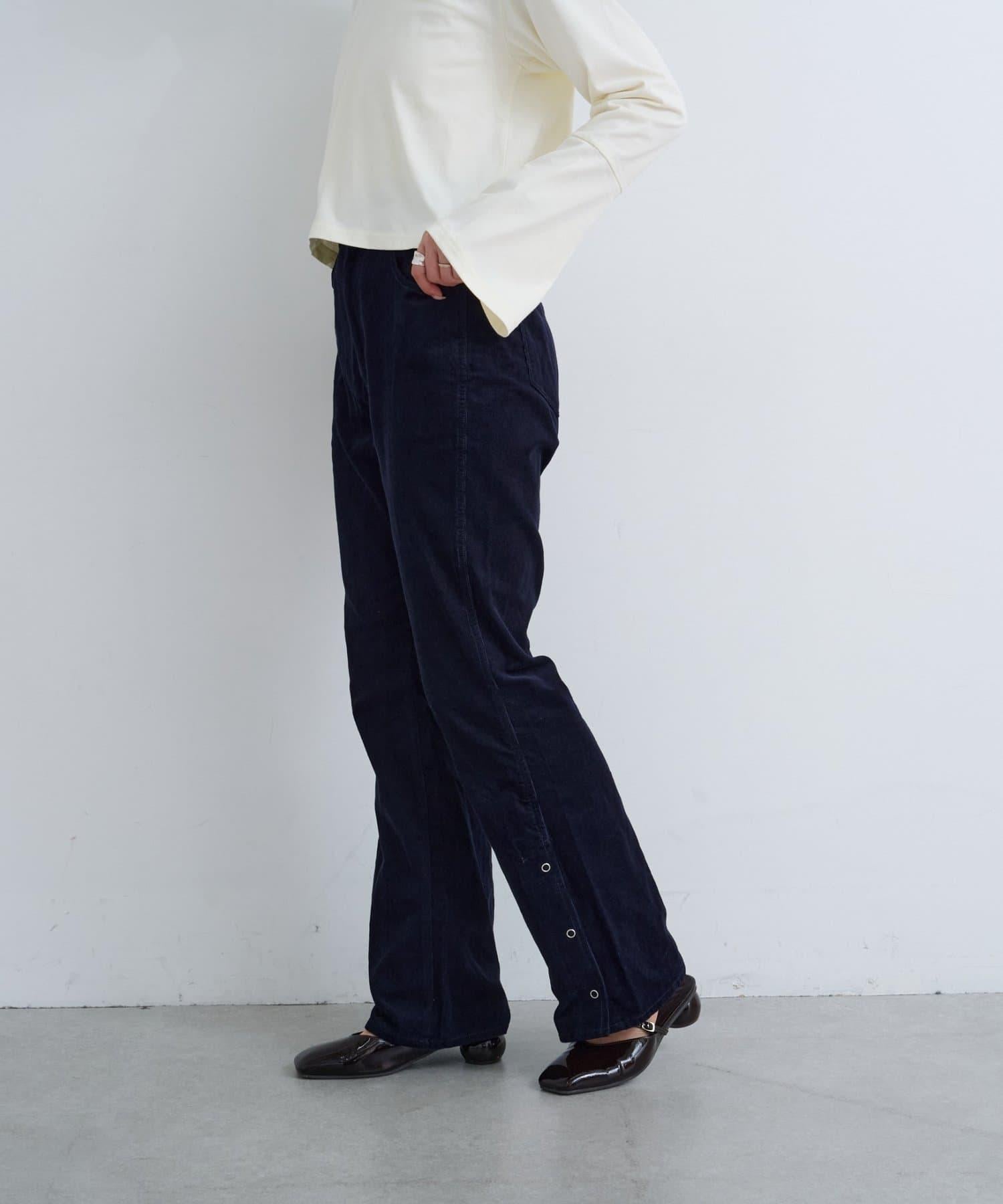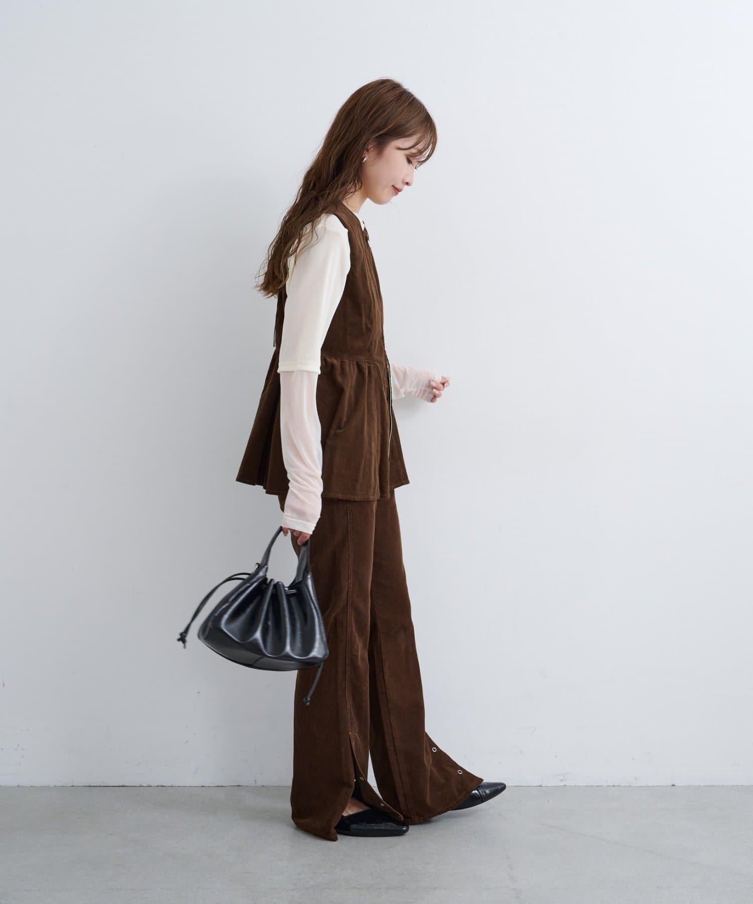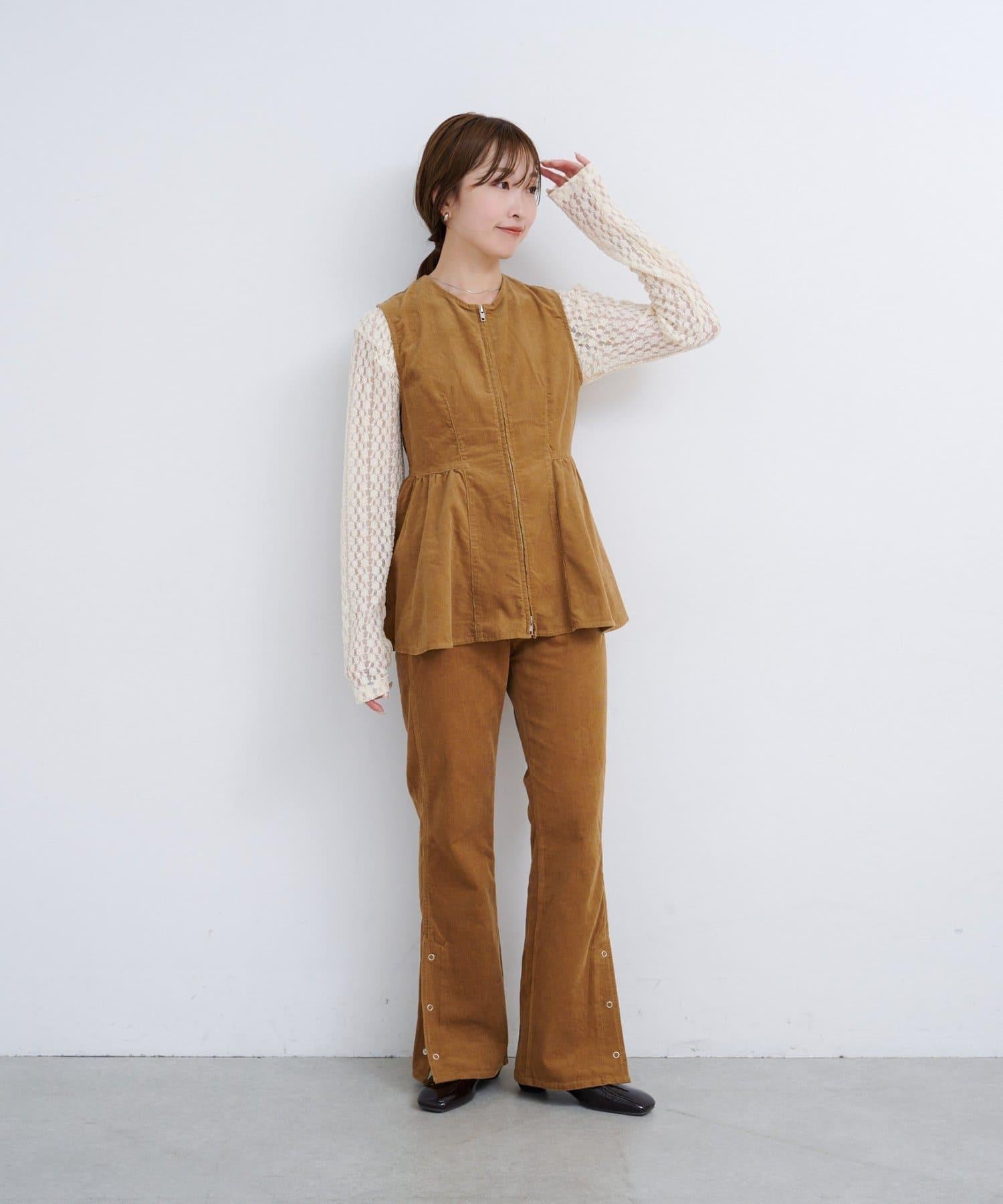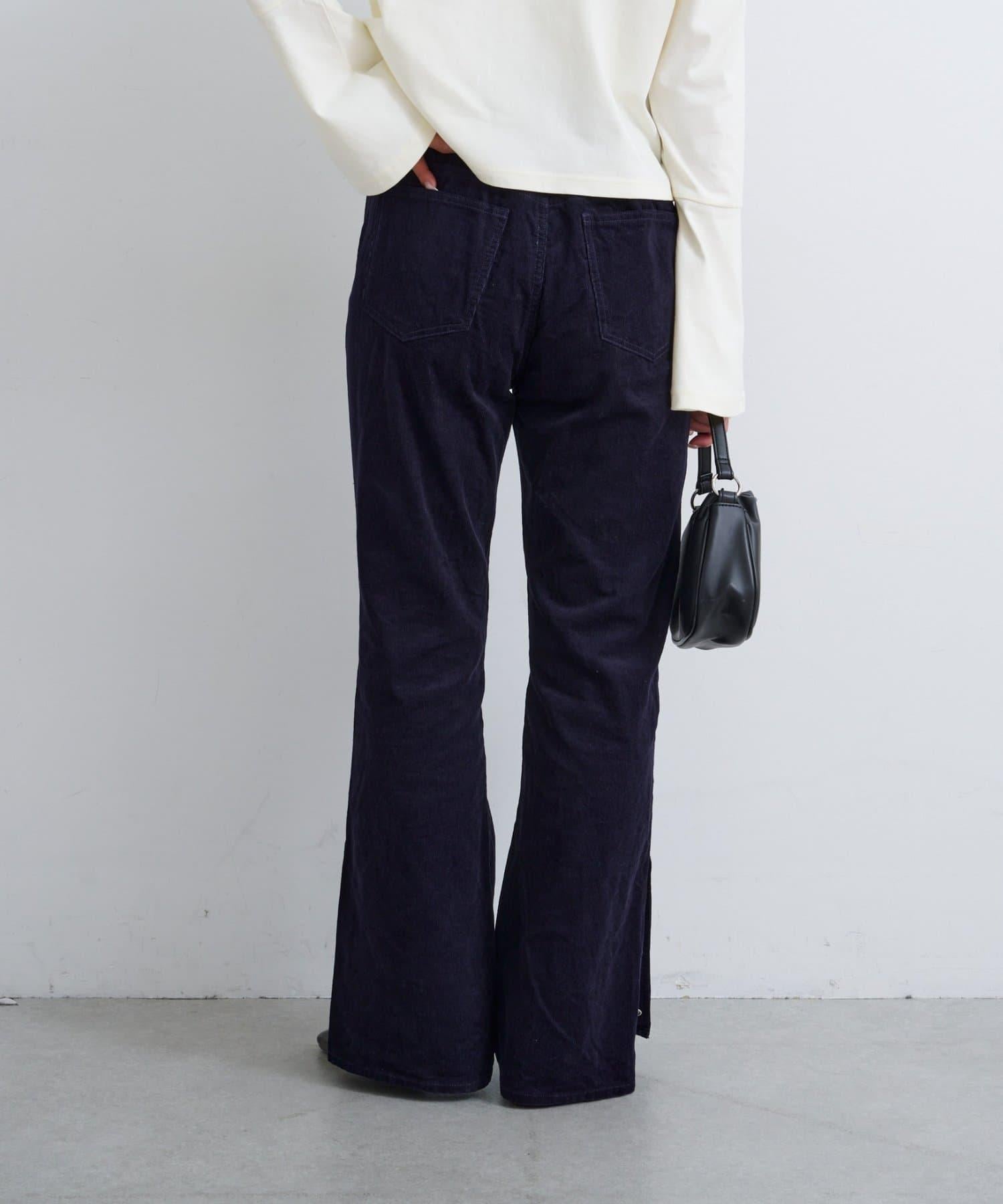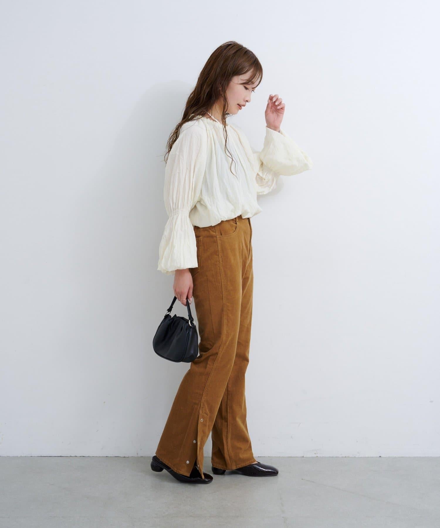 當季流行的燈芯絨長褲,開衩寬鬆,與眾不同。