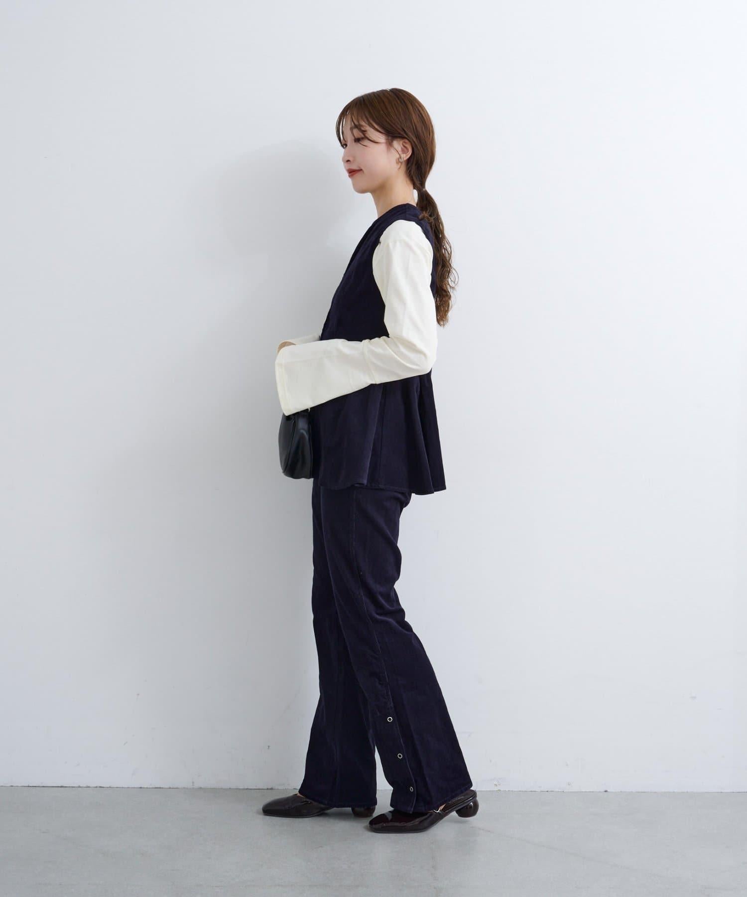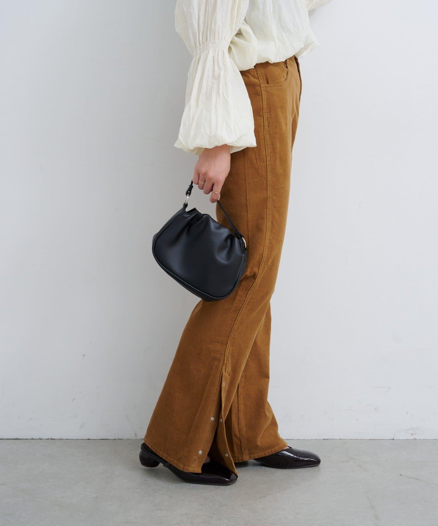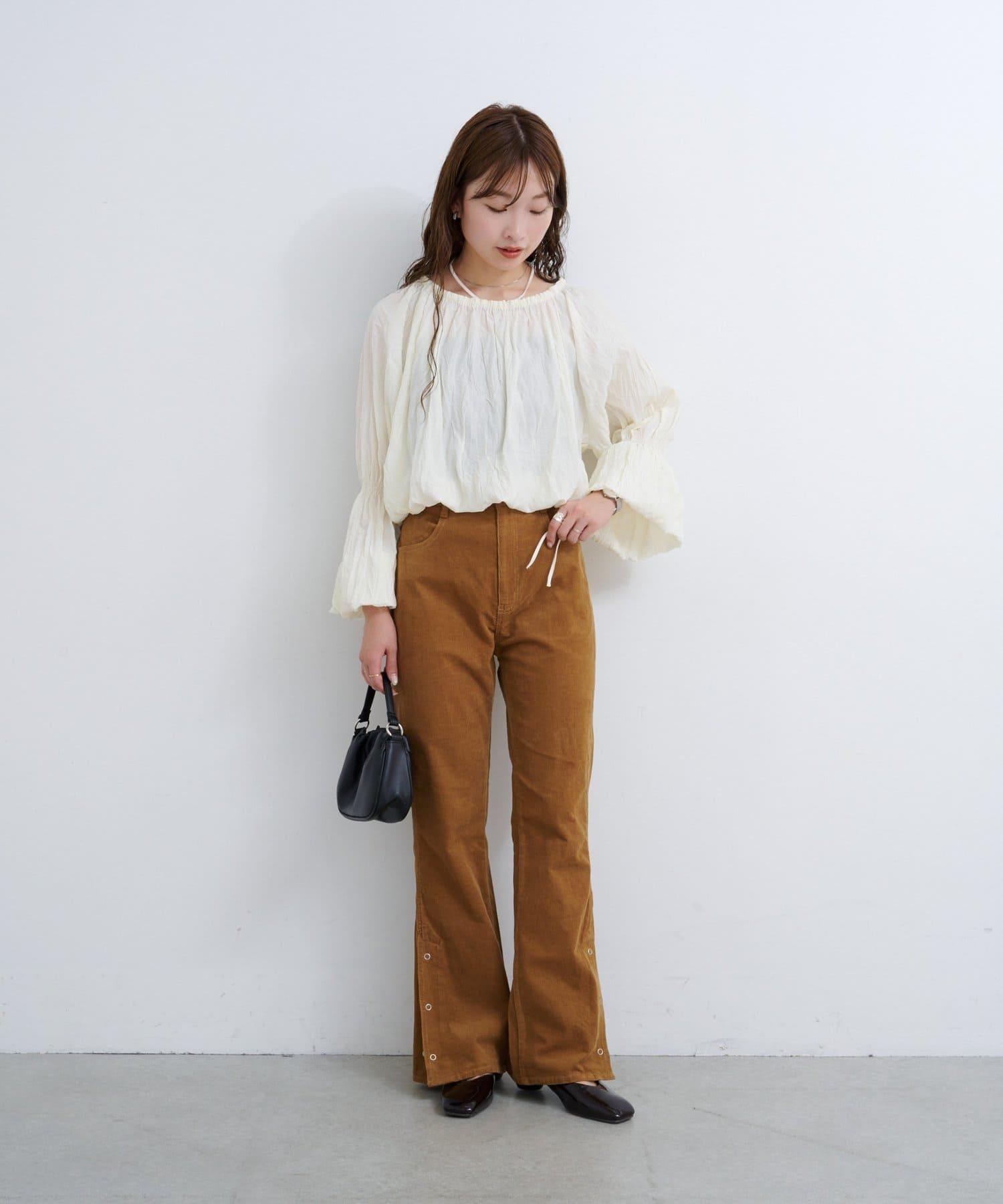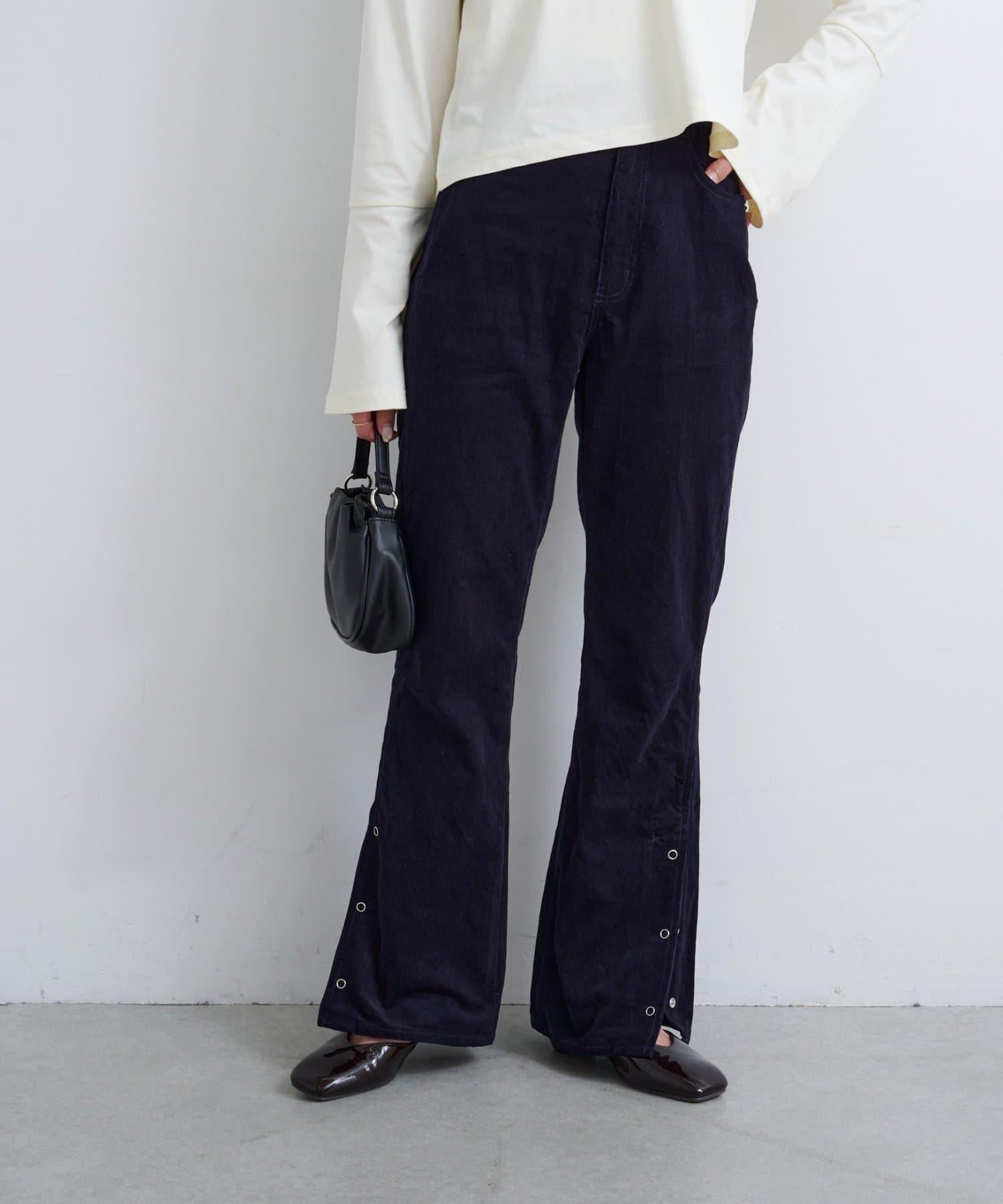 當季流行的燈芯絨長褲,開衩寬鬆,與眾不同。