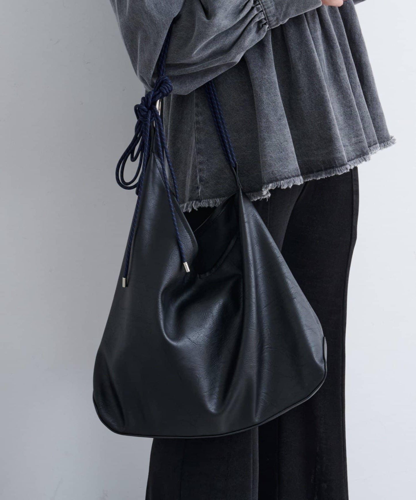 圓潤的輪廓賦予其柔和的質感,繩索式手柄使其易於背在肩上,為您的造型增添一絲精緻感。