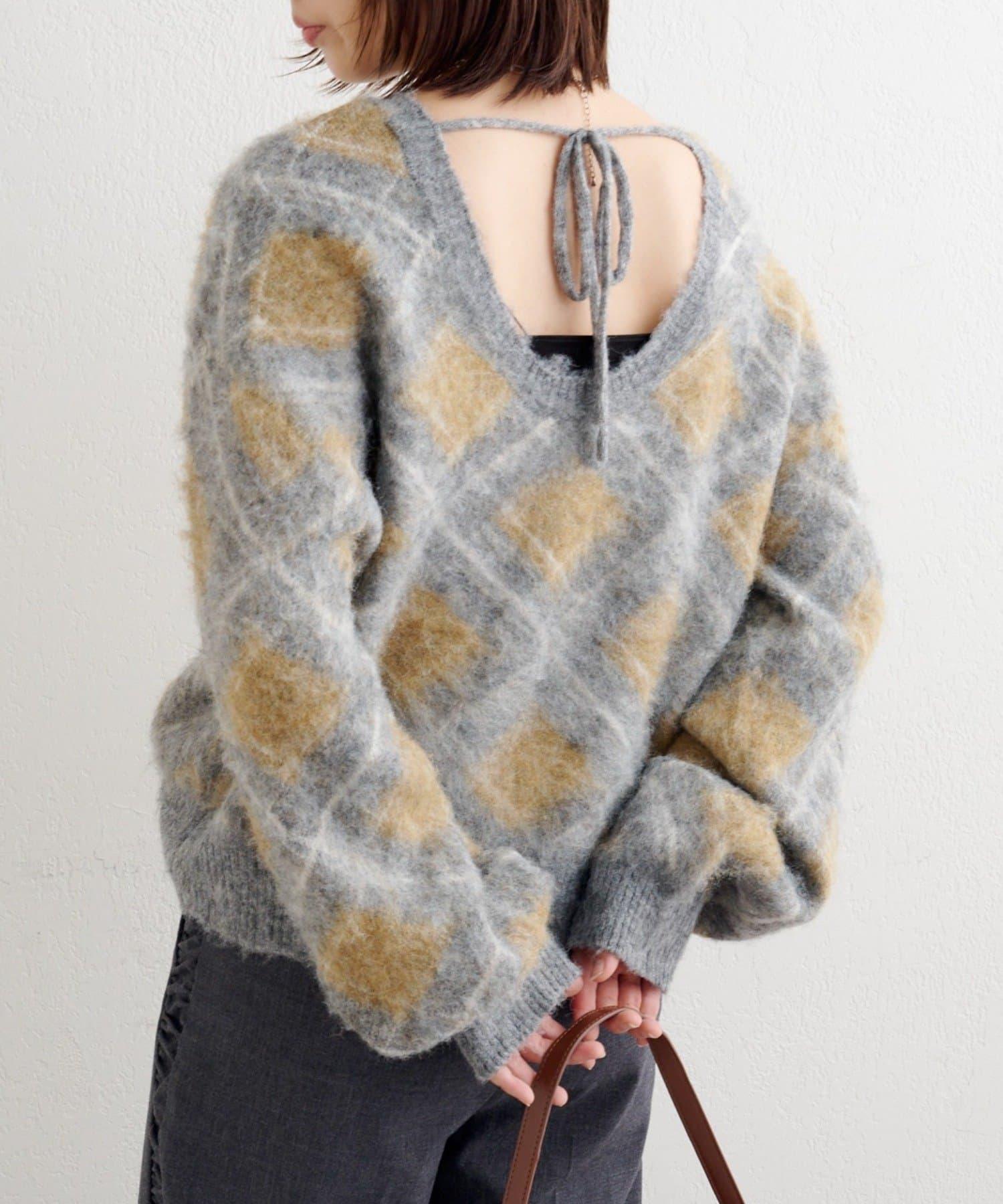 適合冬季穿著的菱形針織衫,具有蓬鬆、輕盈的磨毛質感和可愛的背部緞帶。