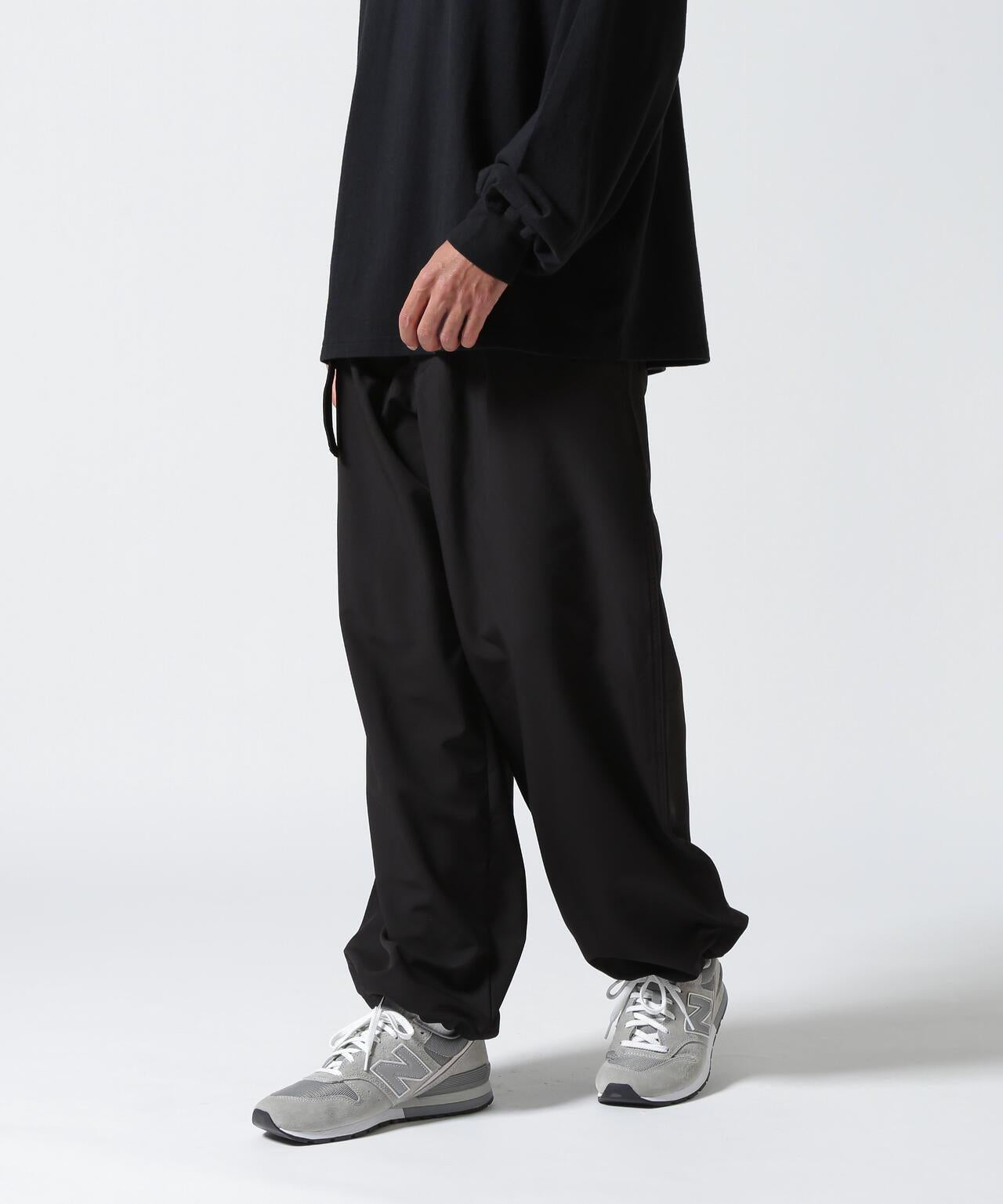 B omnivore STRETCH POLYESTER BELT LOOSE PANTS 彈力滌綸腰帶寬鬆長褲 寬直筒款式,附有相同面料的腰帶。褲型優美,臀部適度整齊,大腿區域寬闊。下襬處有抽繩。B omnivore] [B omnivore] omnivore = 可與各種時尚風格混搭而不囿於雜食系的服裝。