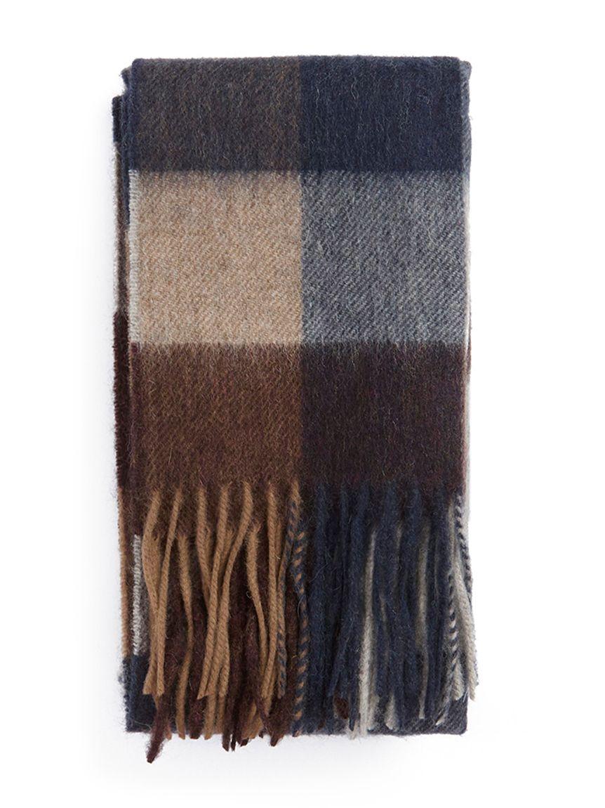 圍巾上飾有大塊格紋,與羊毛大衣搭配,風格迷人。