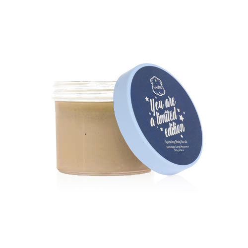 來自限量版 "👍美好的祝願 "系列的身體磨砂膏,閃爍著微妙的銀光。