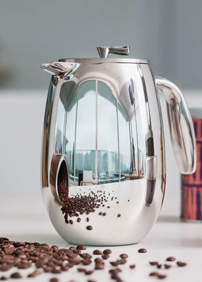 哥倫比亞法壓咖啡機採用不鏽鋼鏡面處理,外形光滑,設計獨特。機身由雙層不鏽鋼製成,以保持熱量,而過濾部分由單層製成,便於清洗。
