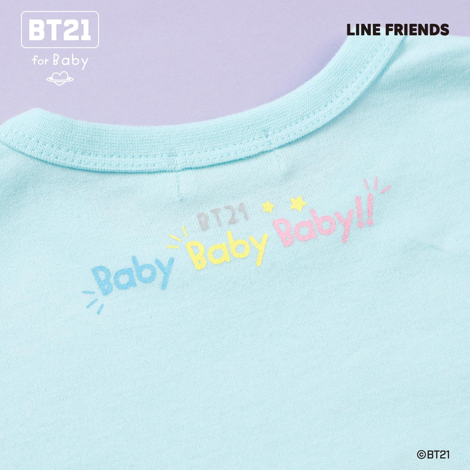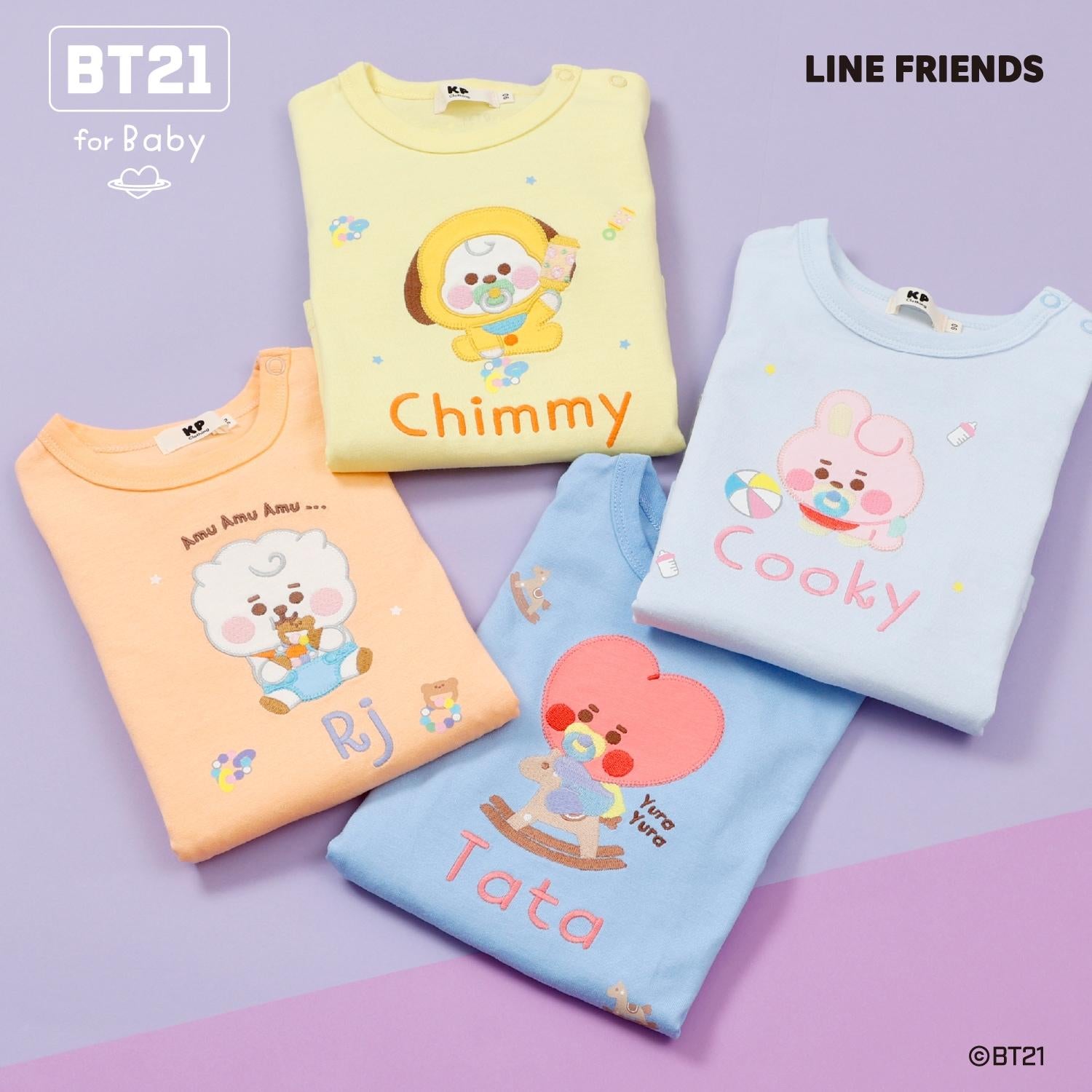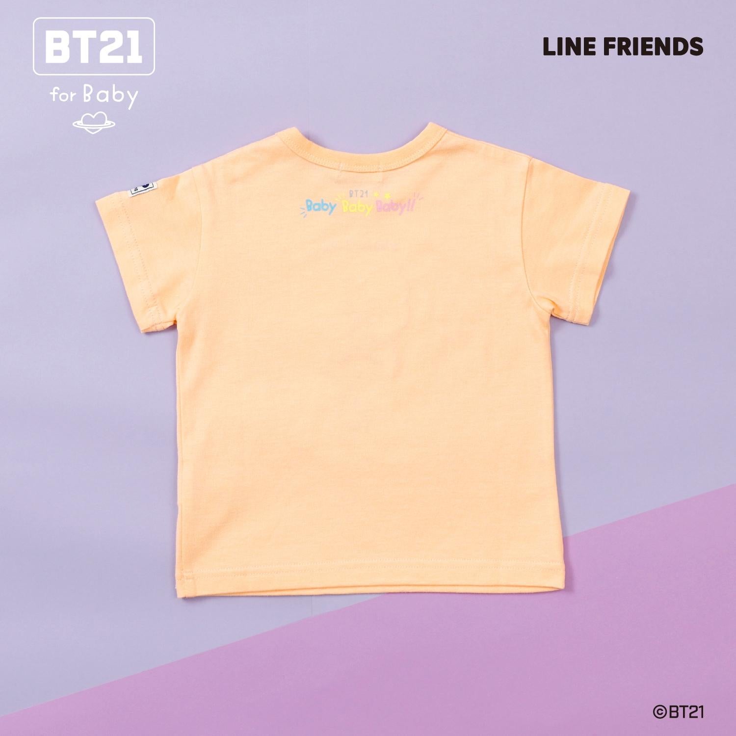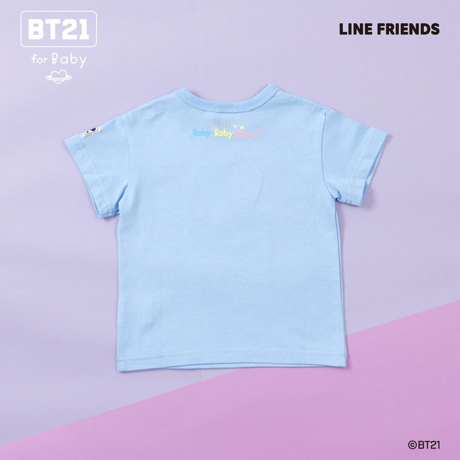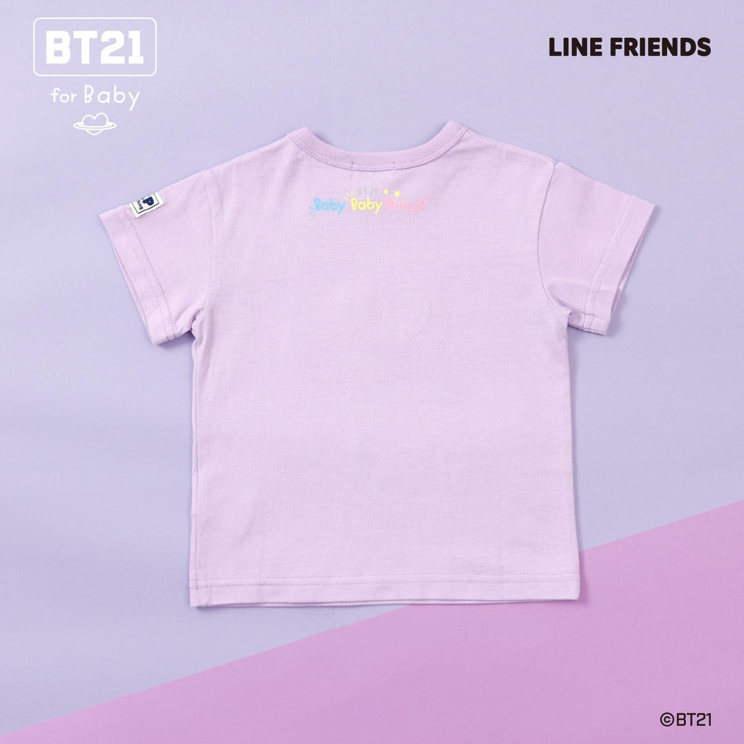 短袖 T 恤上繡有精緻的貼花,上面繡有宇宙之星 BT21 的卡通人物 - KOYA、RJ、SHOOKY、MANG、CHIMMY、TATA 和 COOKY - 每個卡通人物都有不同的顏色!
