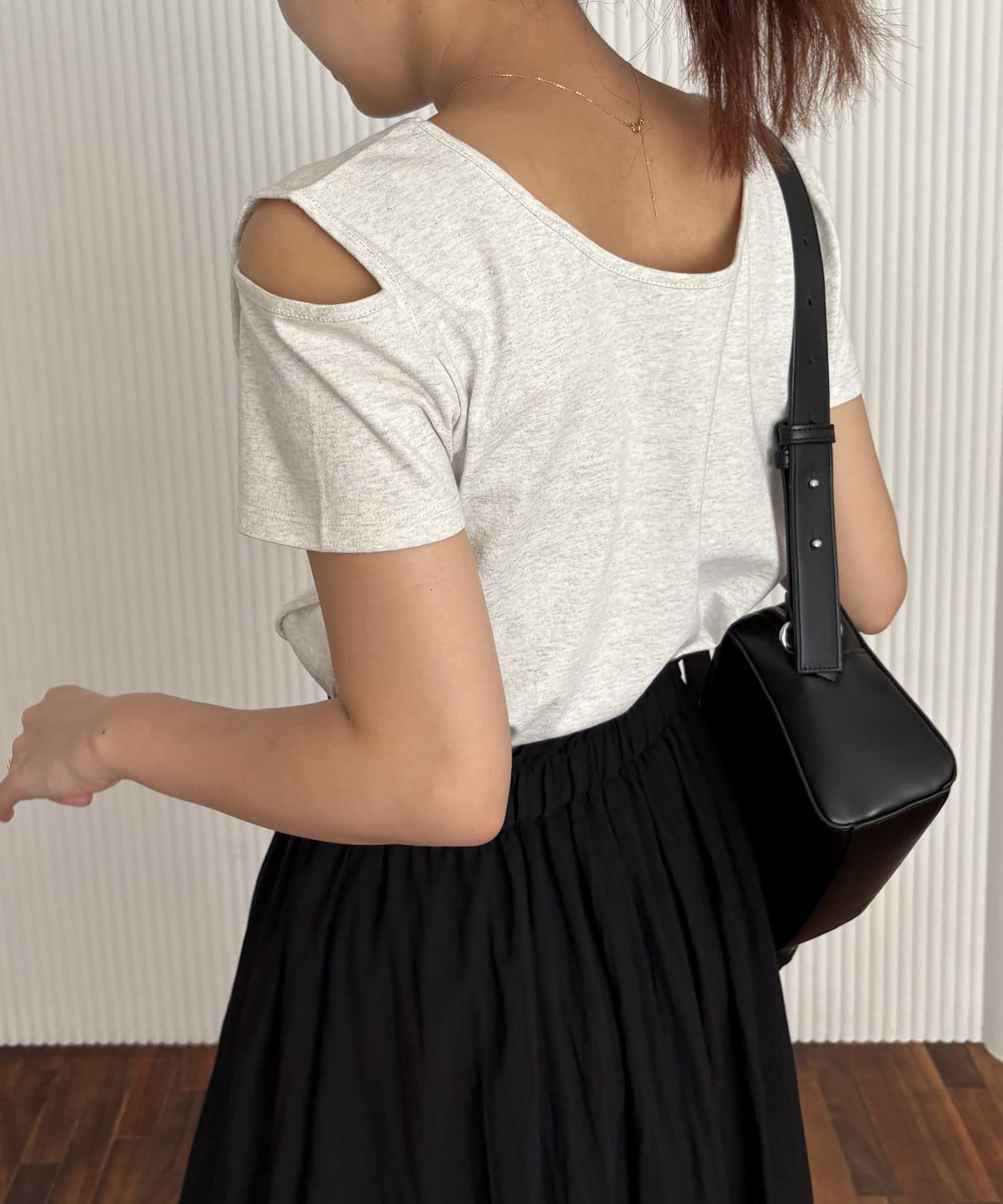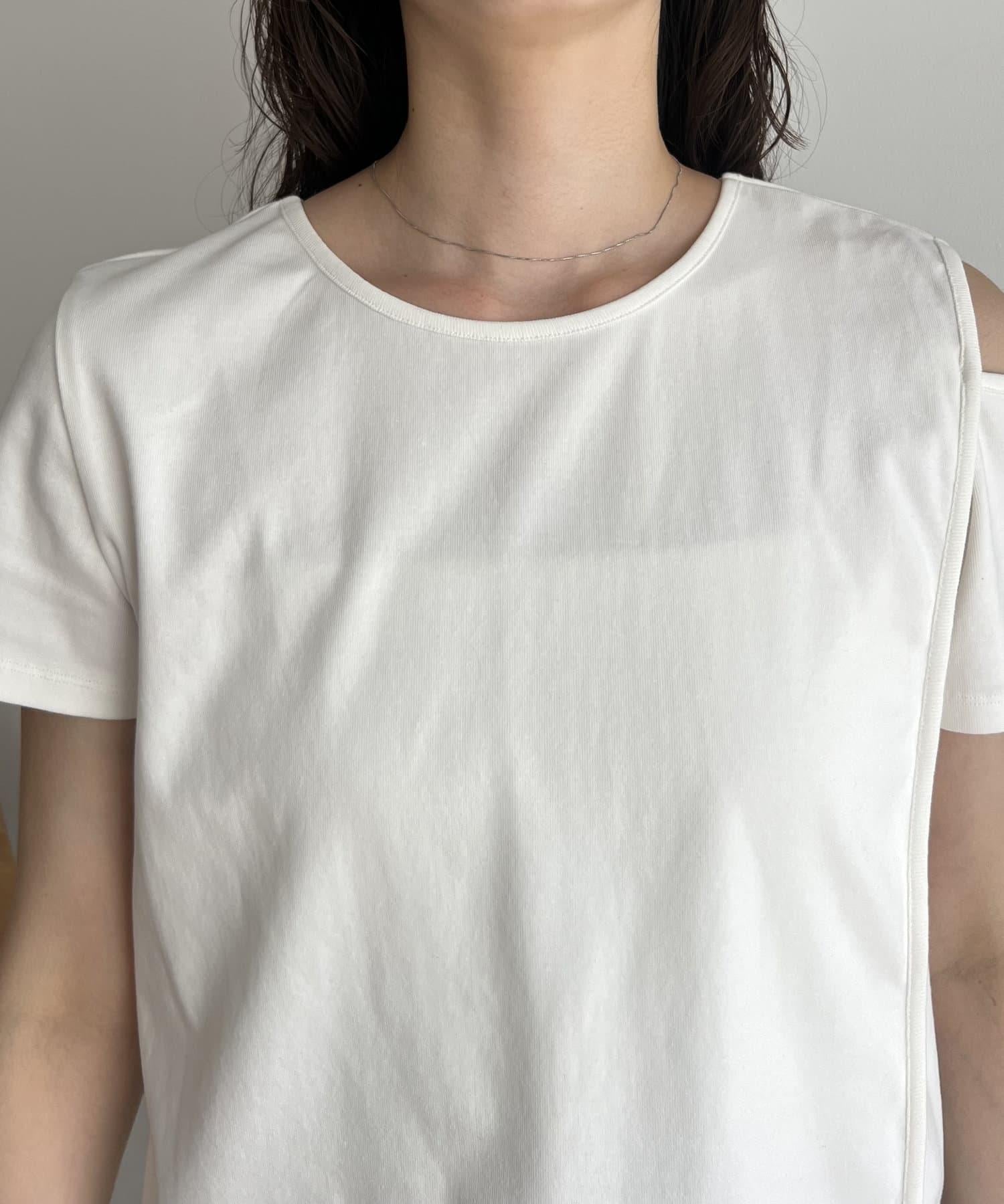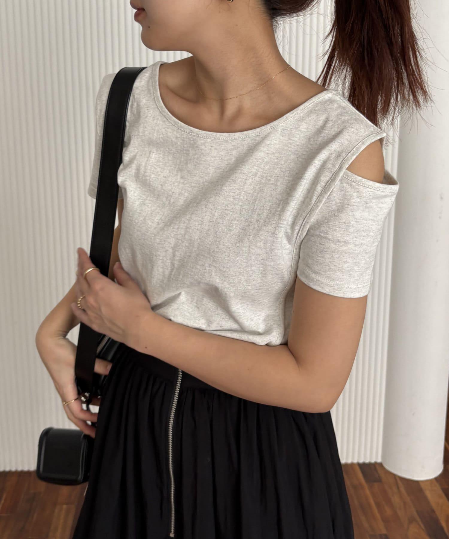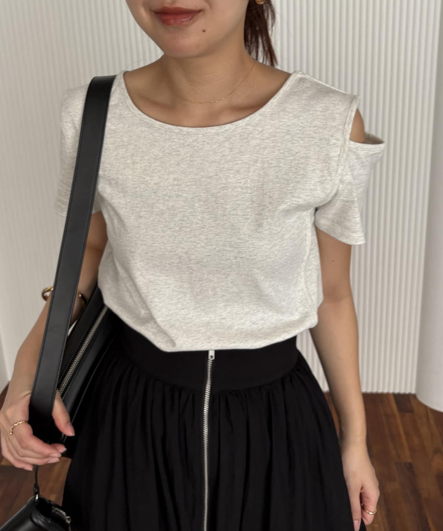 本商品是一套肩部開衩的不對稱設計 T 恤和一件半身裙。