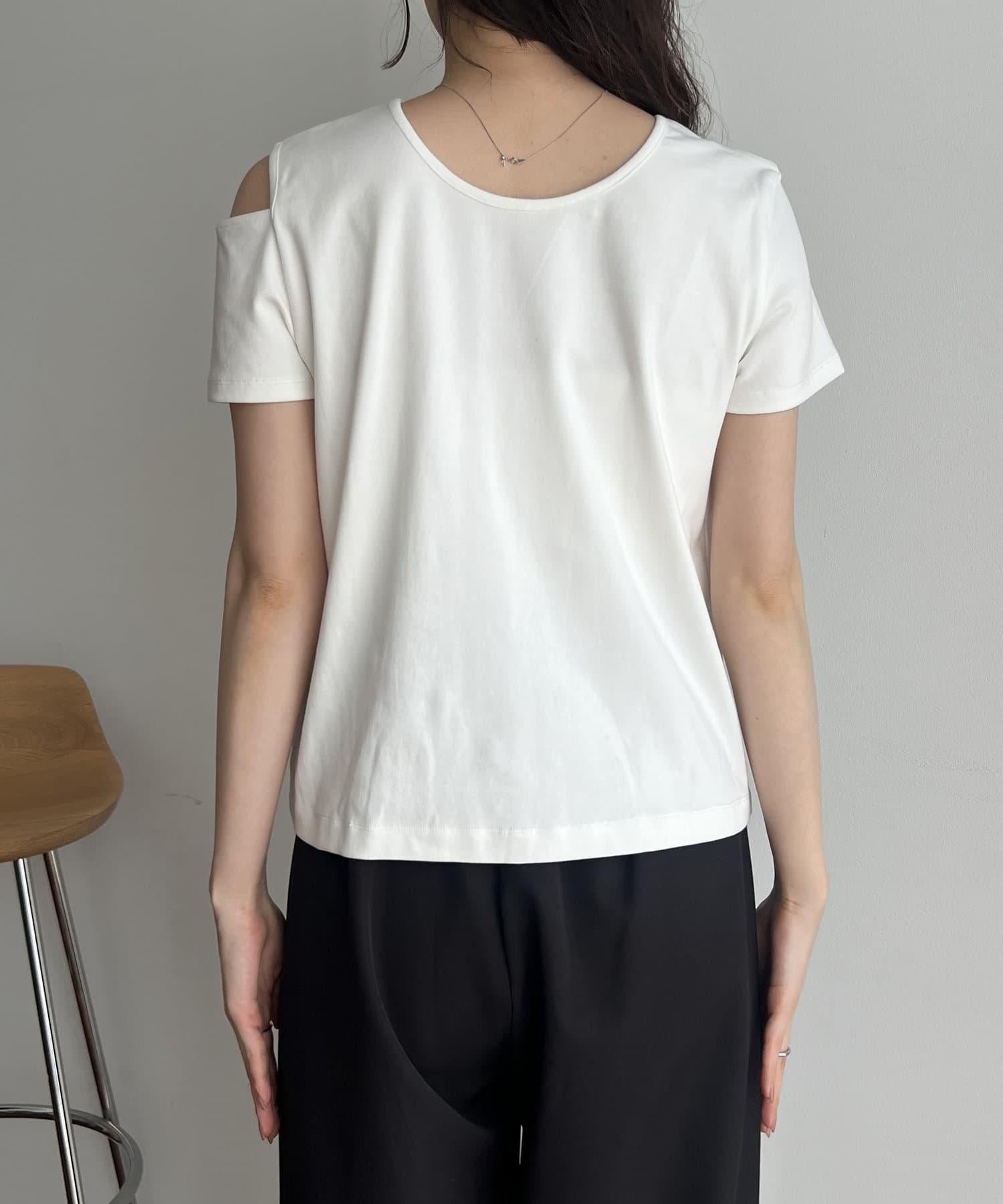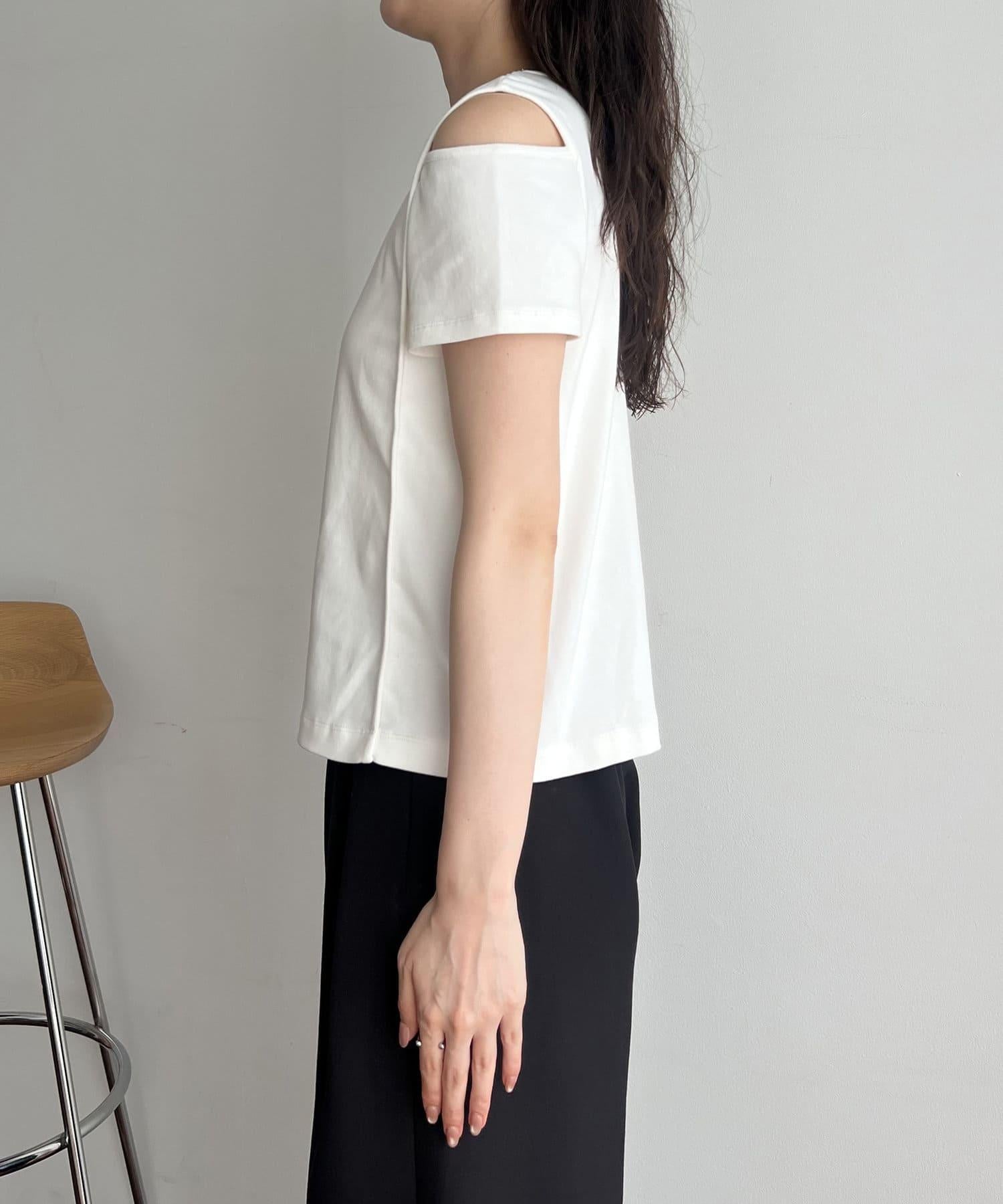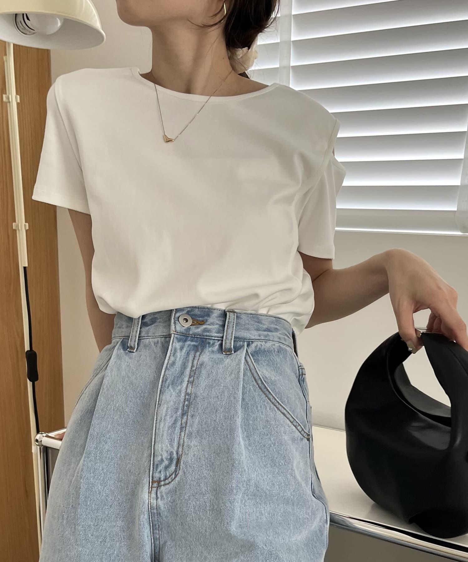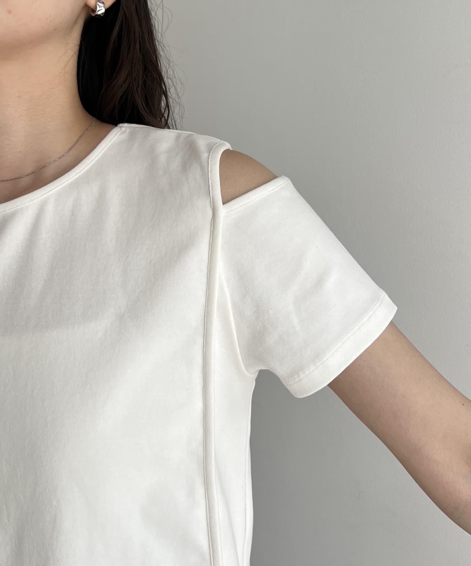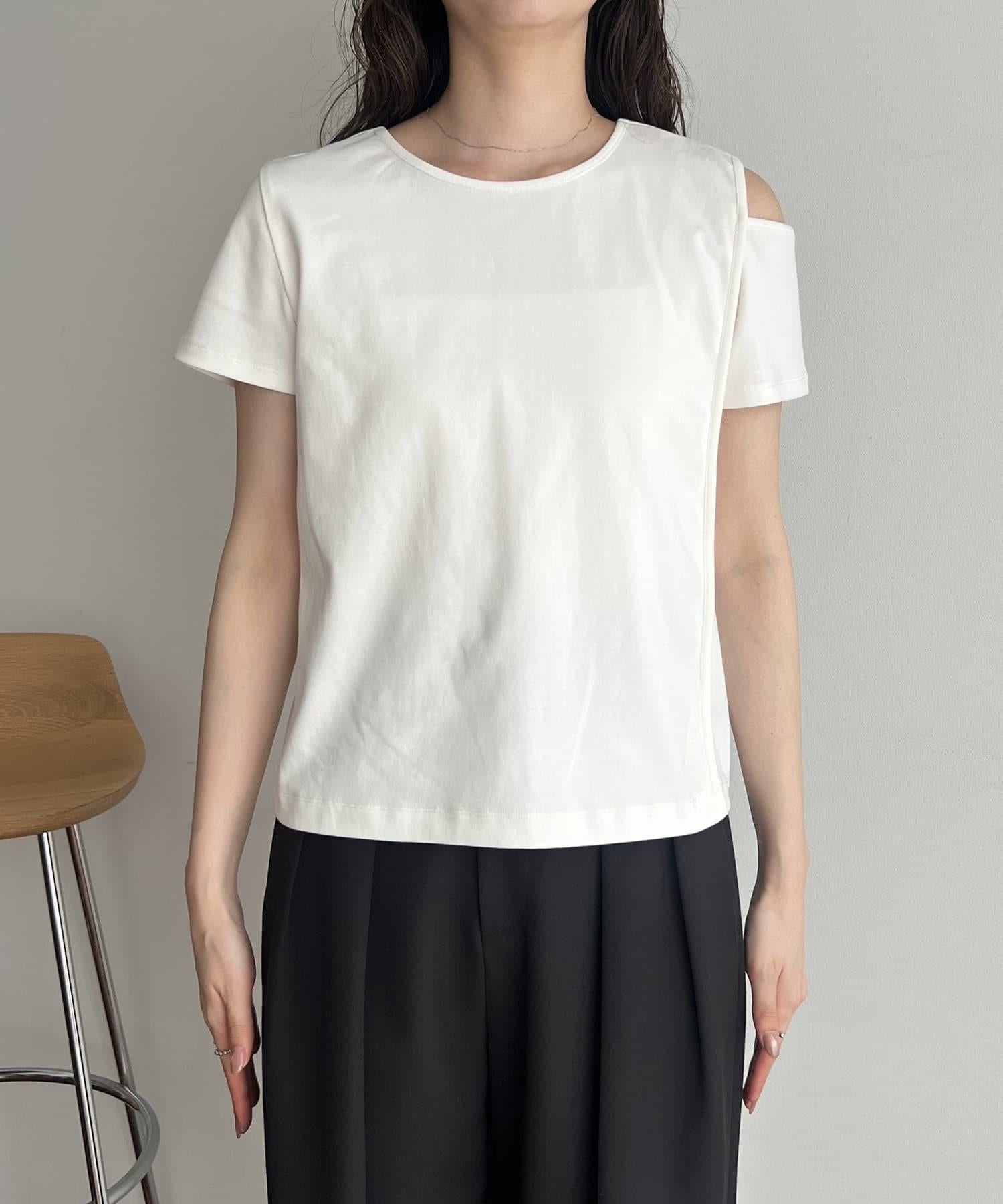本商品是一套肩部開衩的不對稱設計 T 恤和一件半身裙。