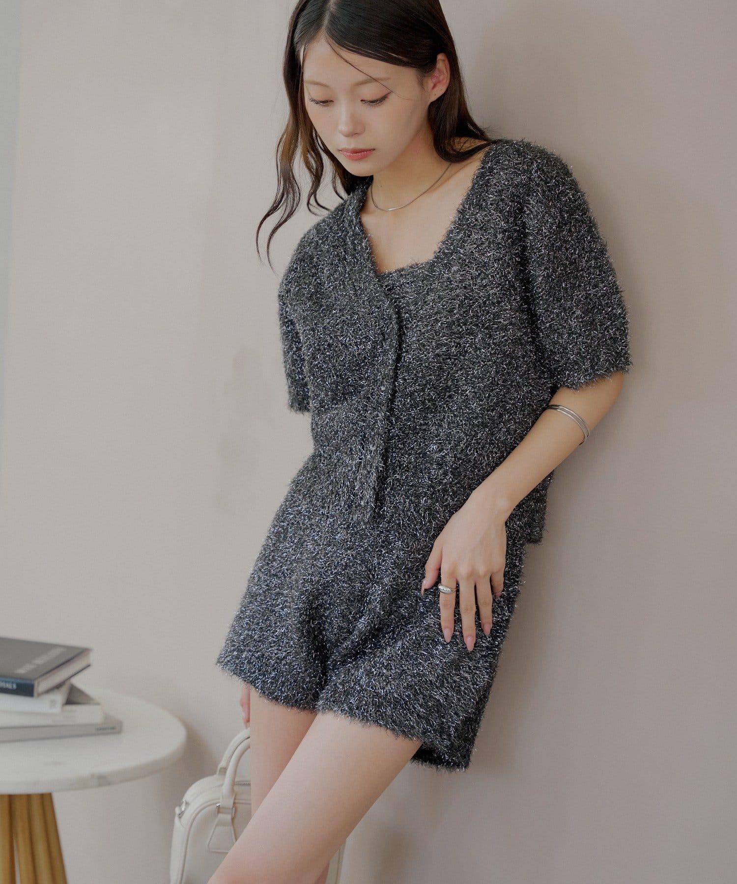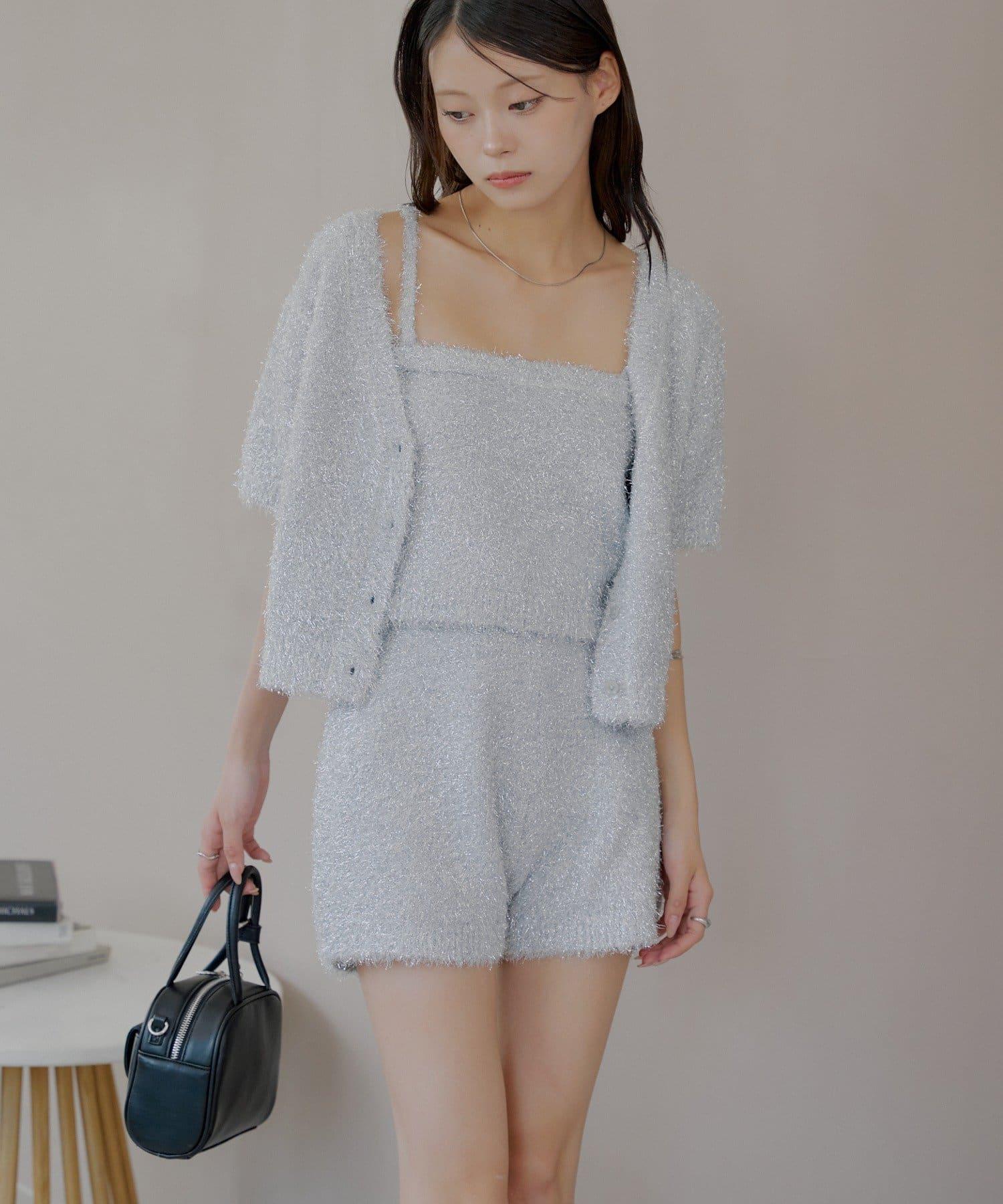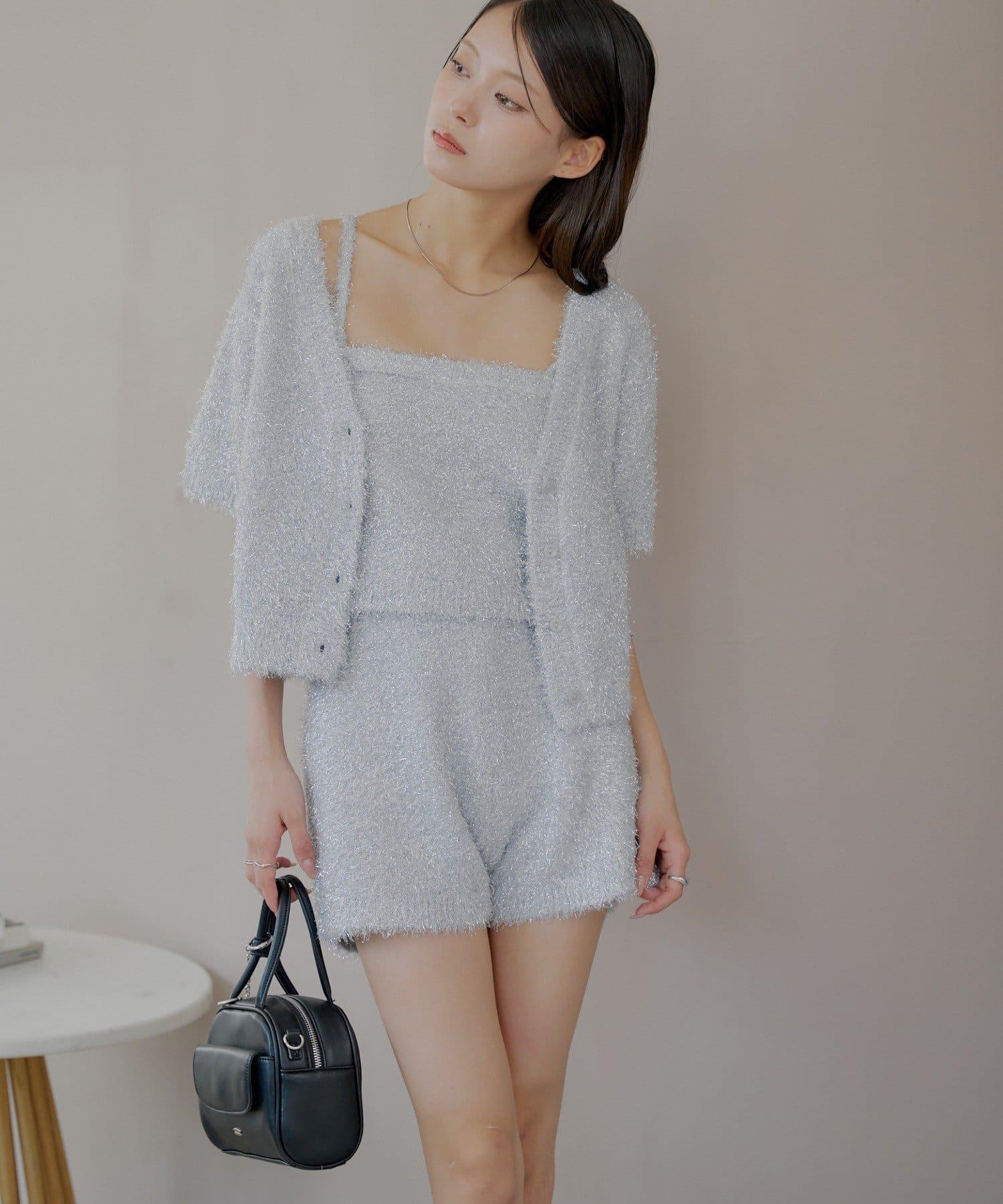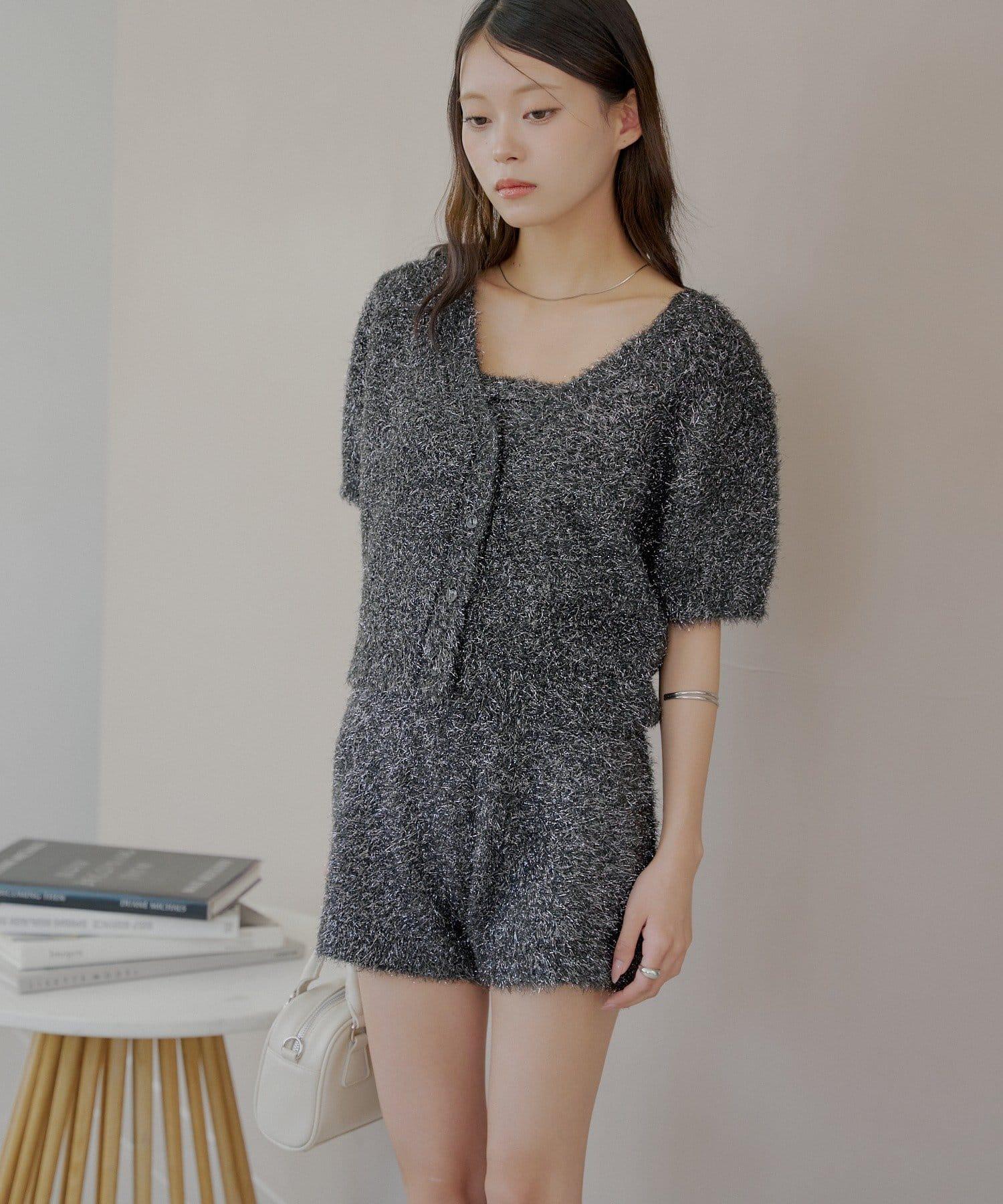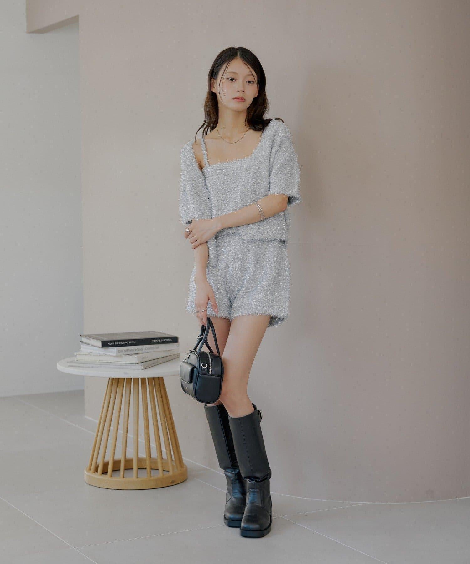 Lame 蓬鬆針織開衫+裸露吊帶衫套裝