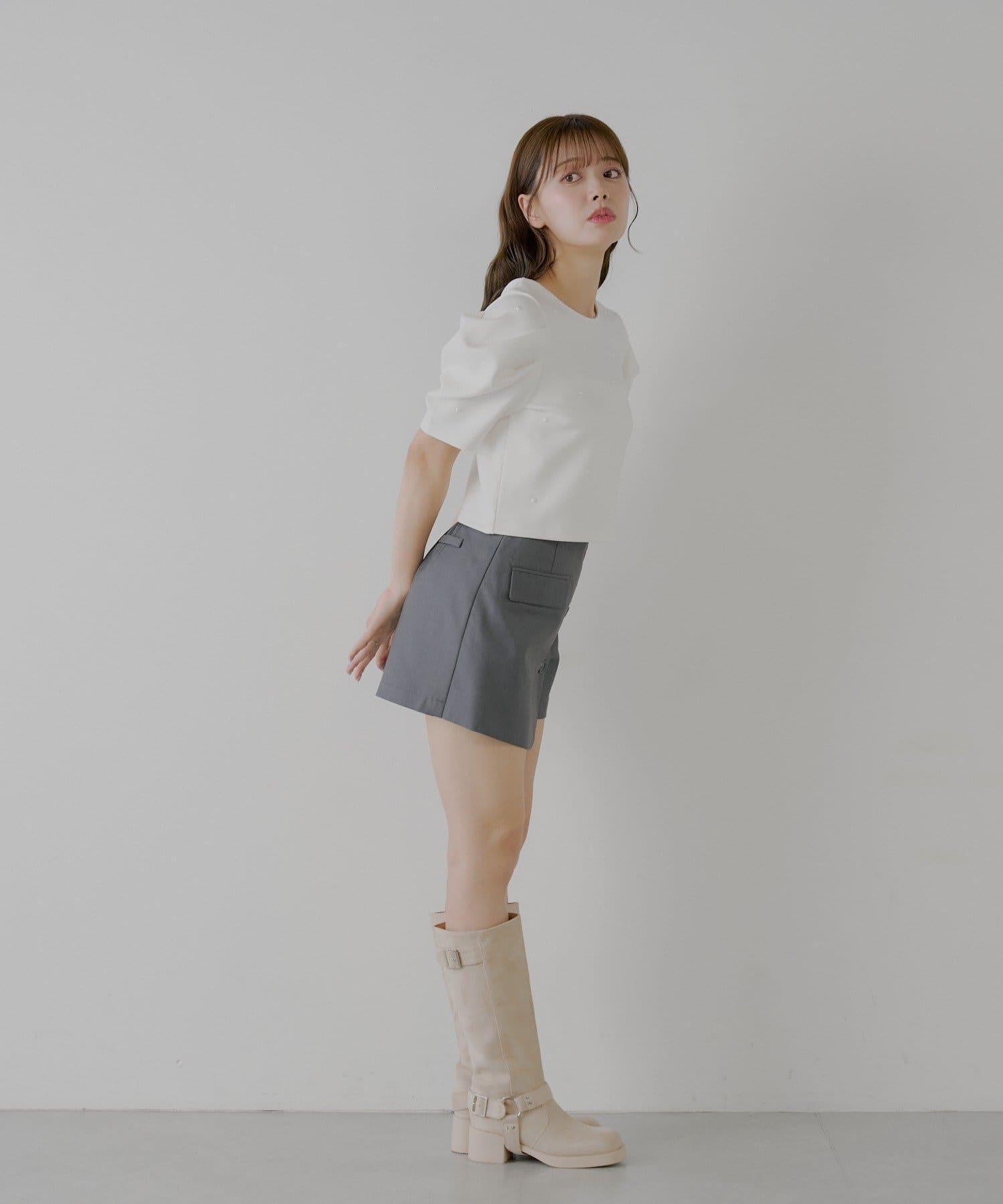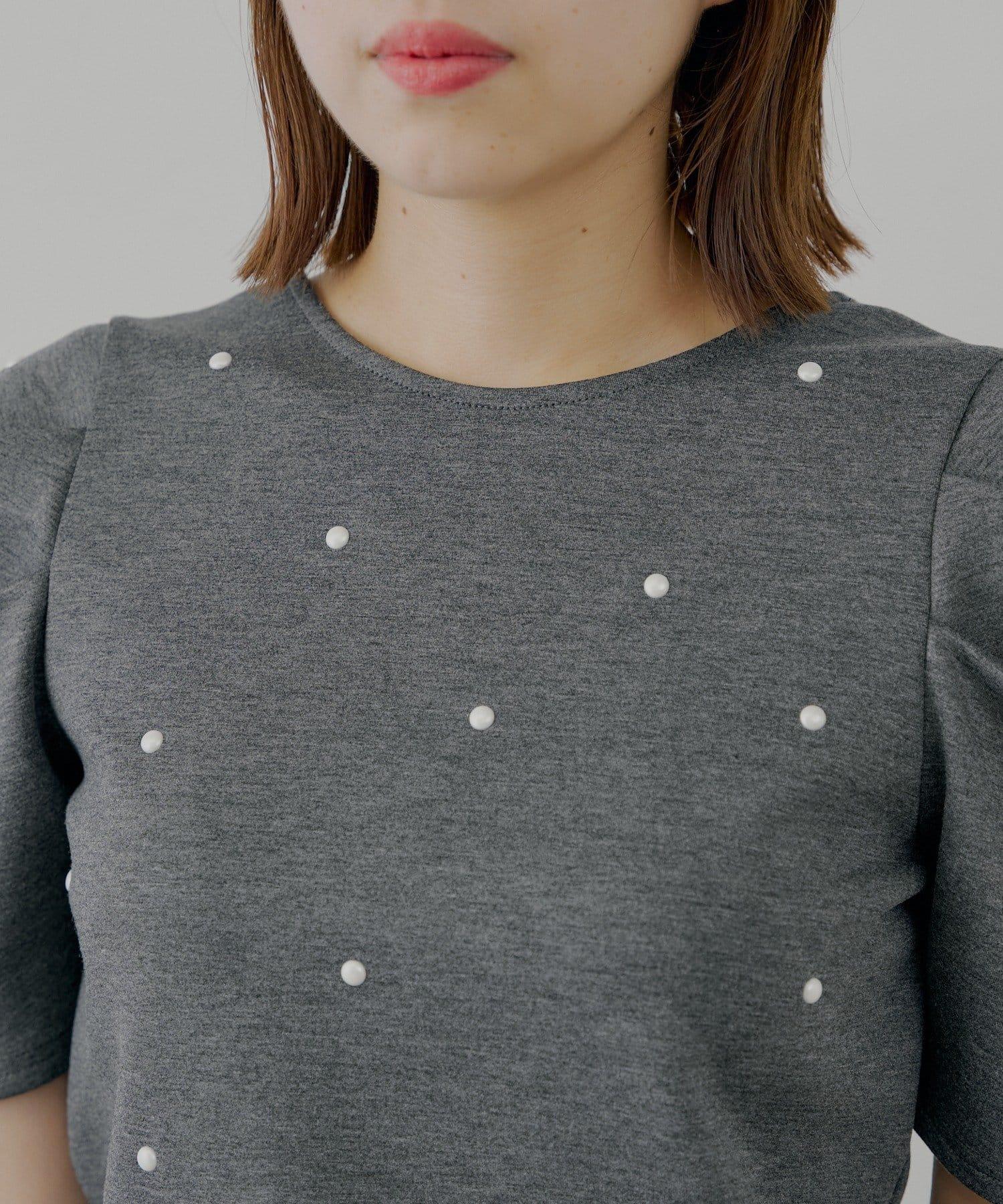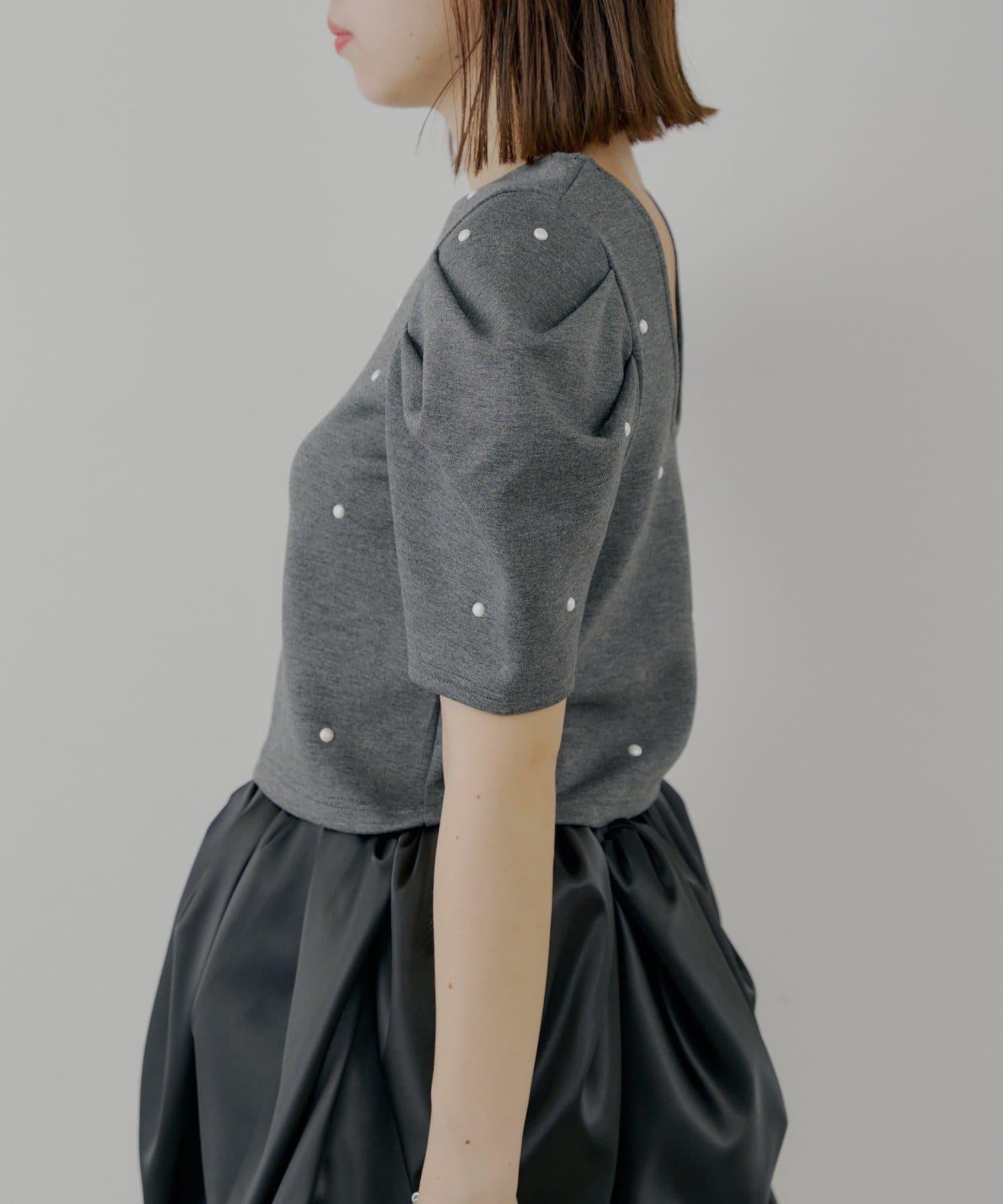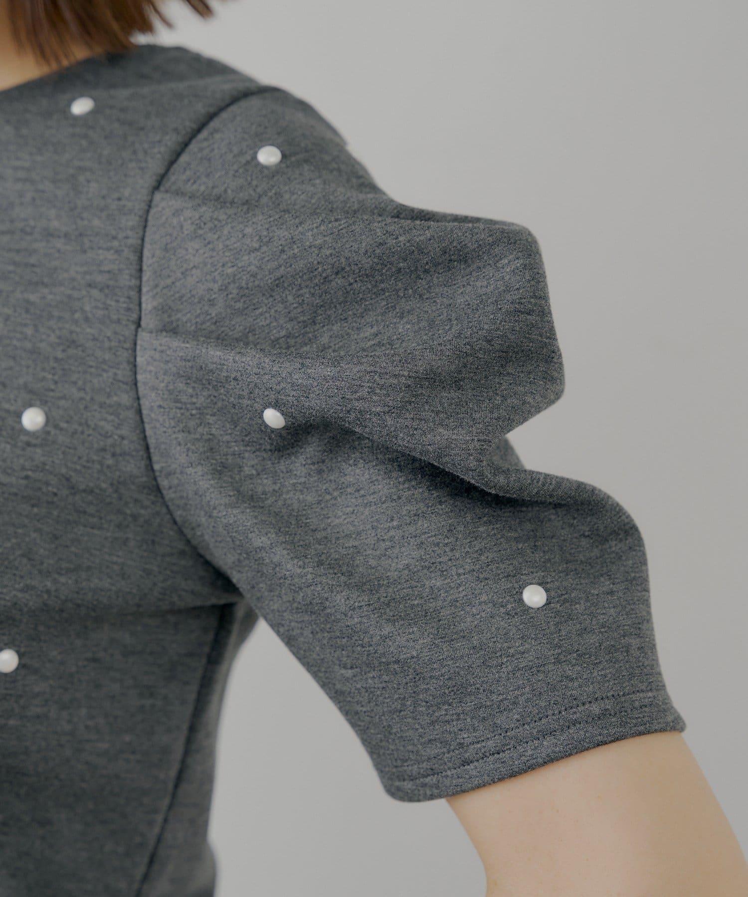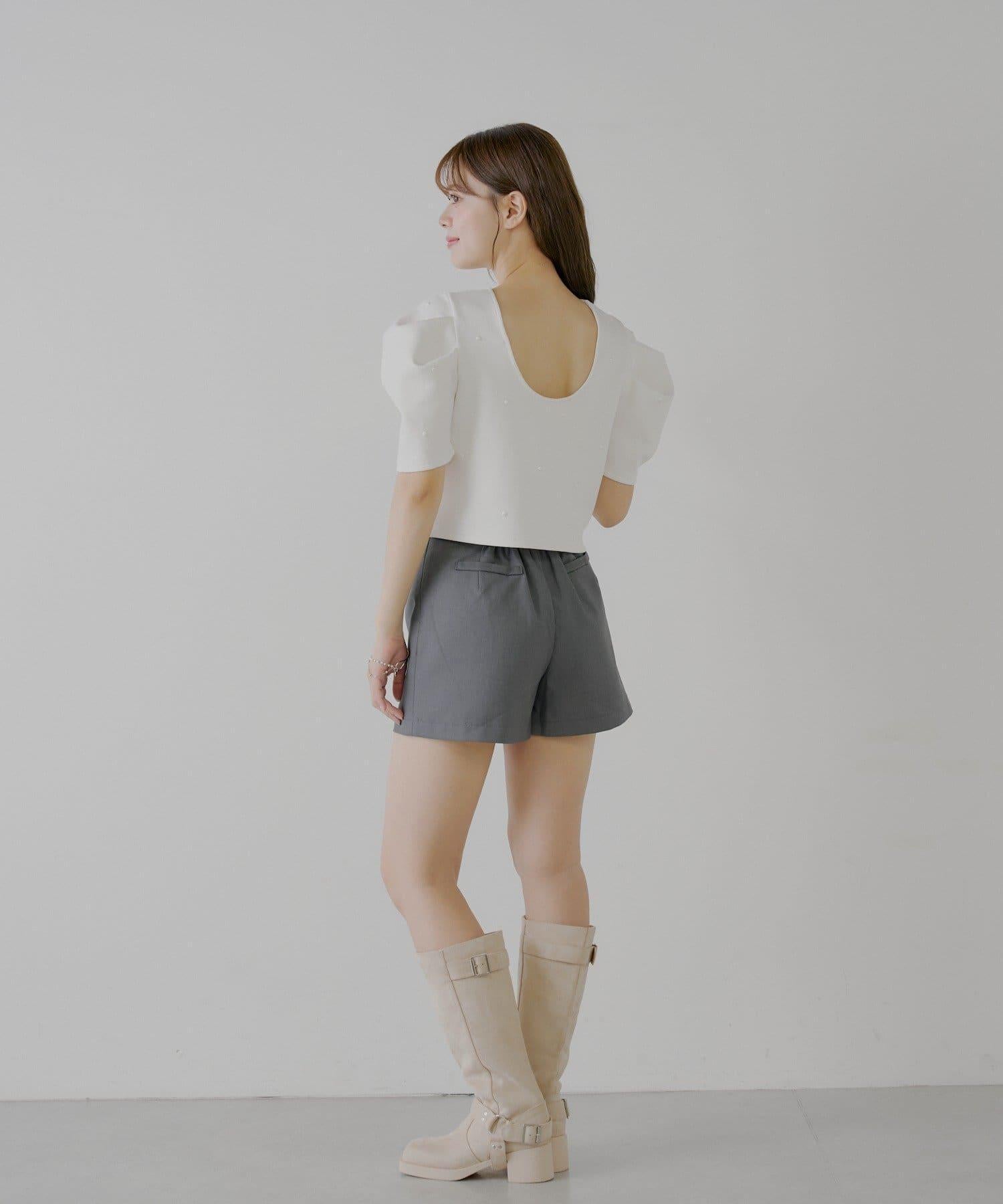 【Chico】後背開口珍珠裝飾墊肩T恤
