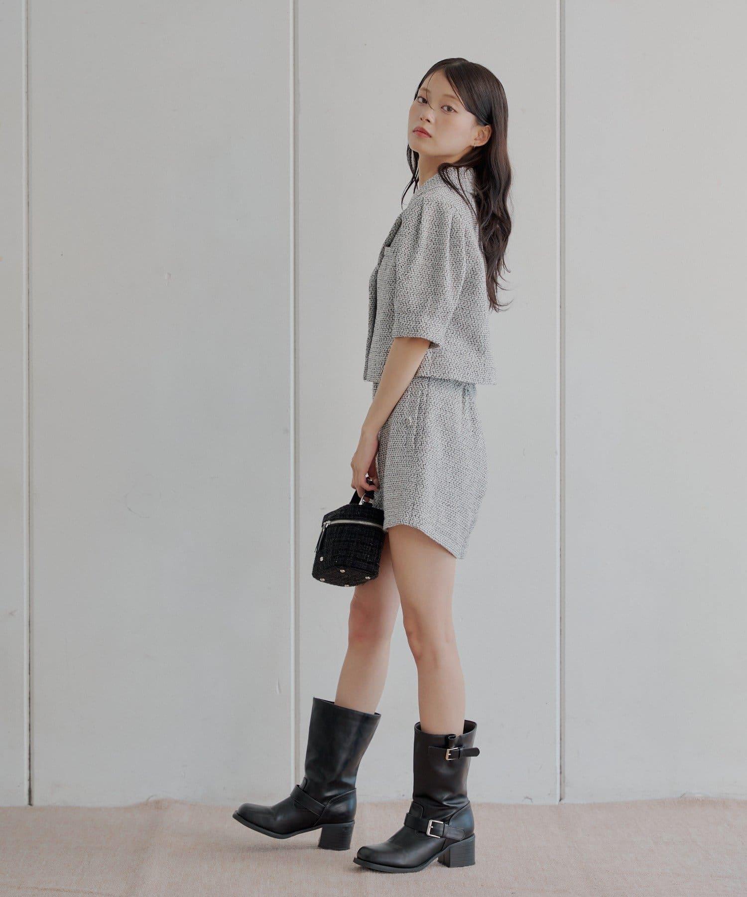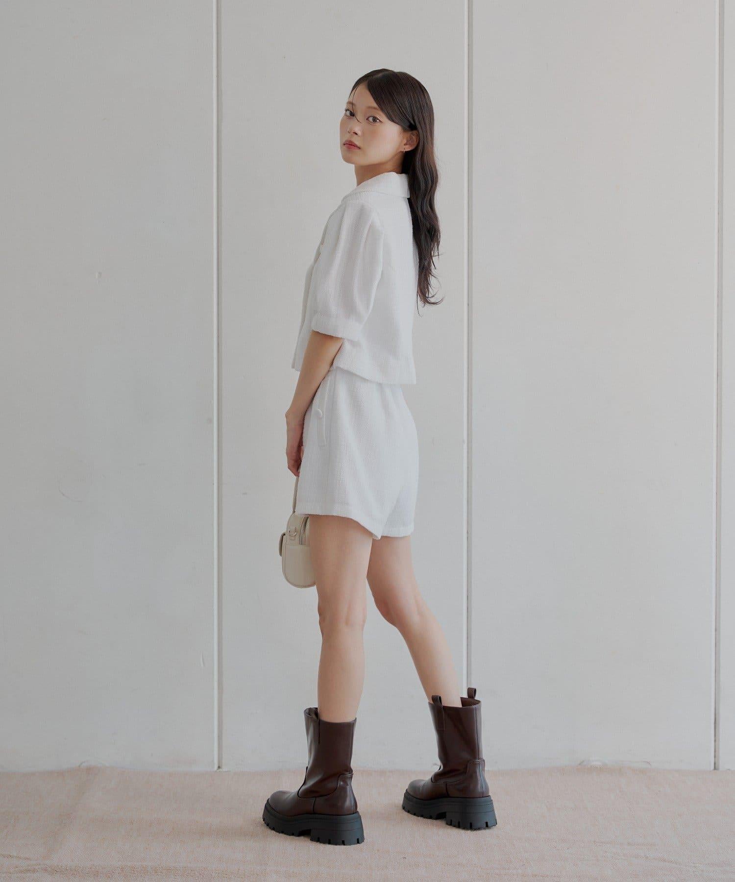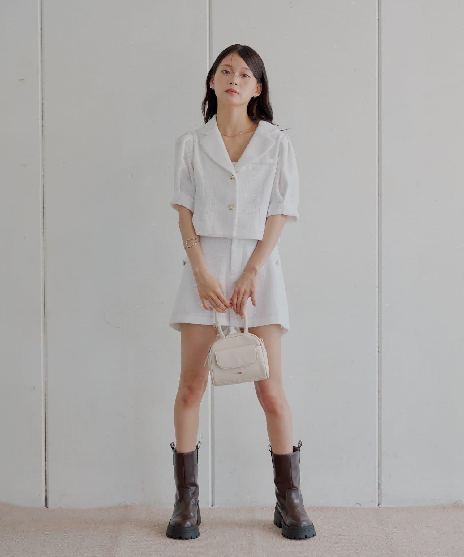 搭配同樣材質的斜紋軟呢短褲,營造出套裝的效果。