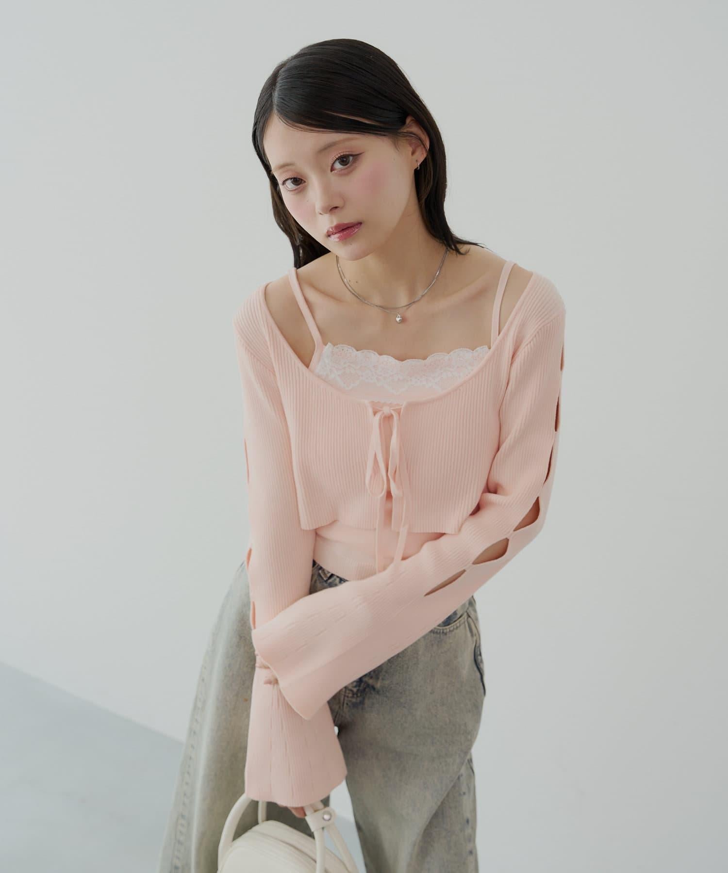 吊帶套頭開衫,恰到好處的露膚設計和精緻的蕾絲花邊。