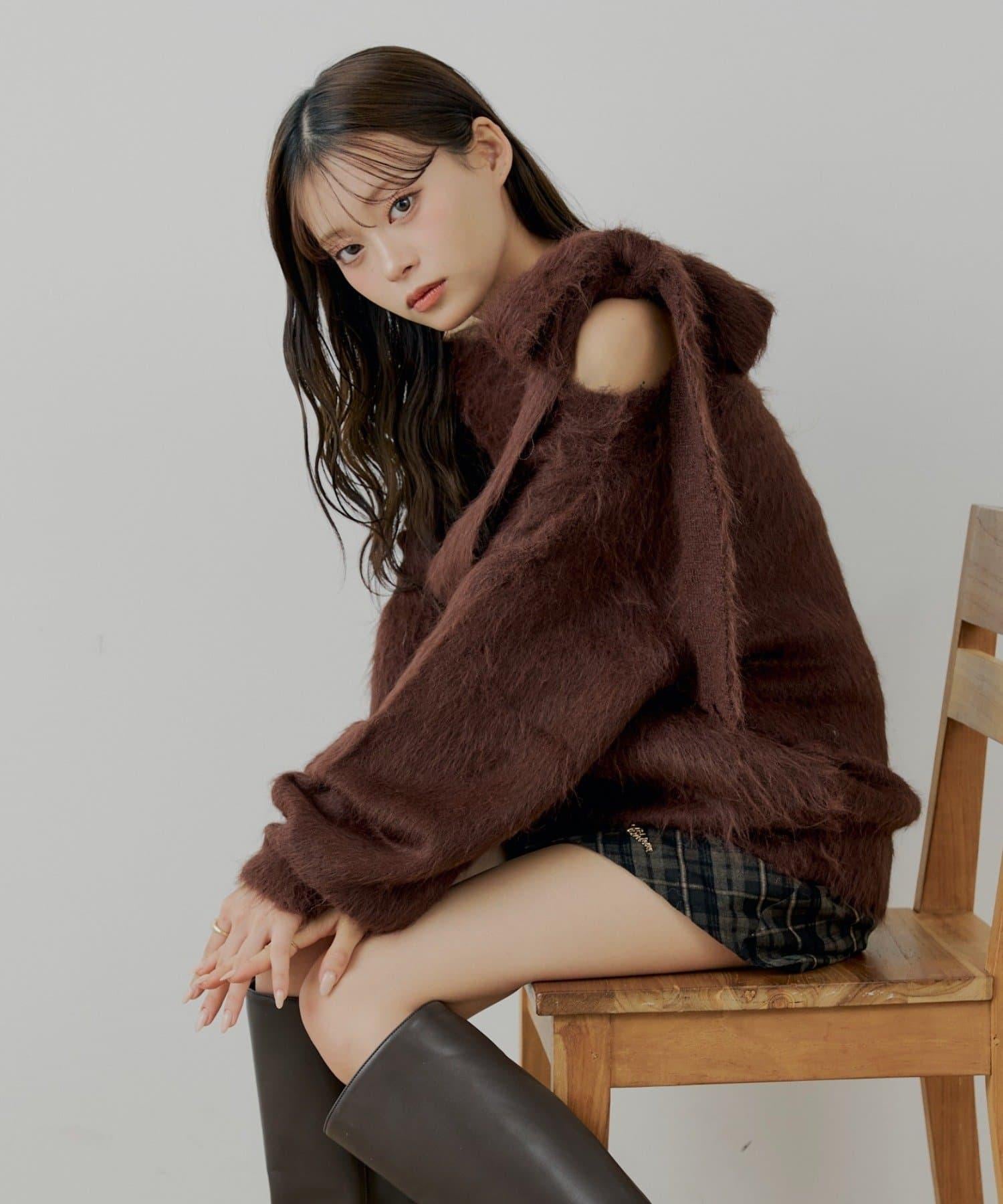 肩部緞帶開衩露肩針織衫,手感柔軟蓬鬆