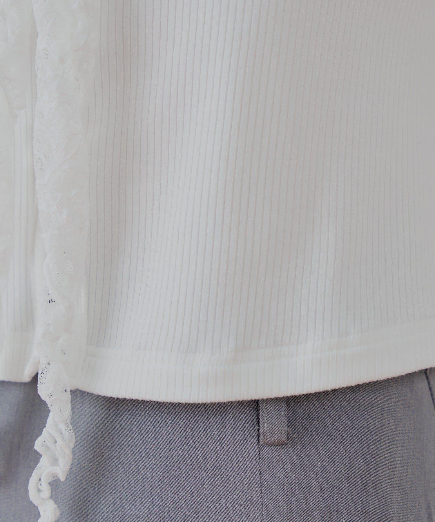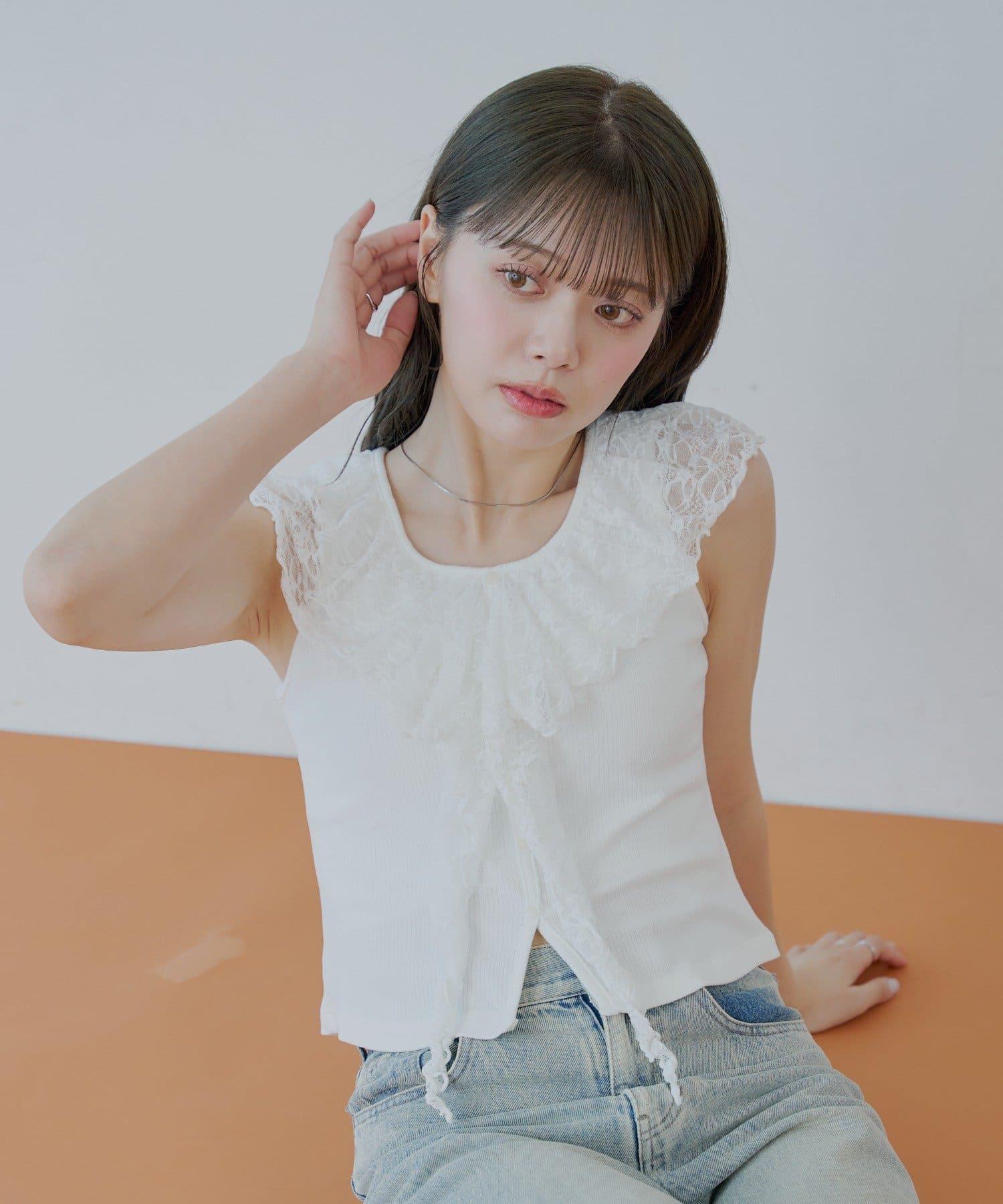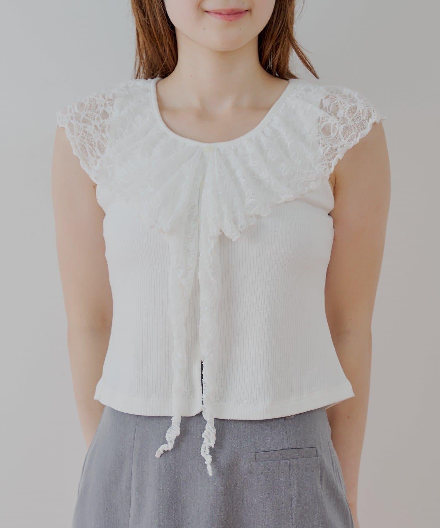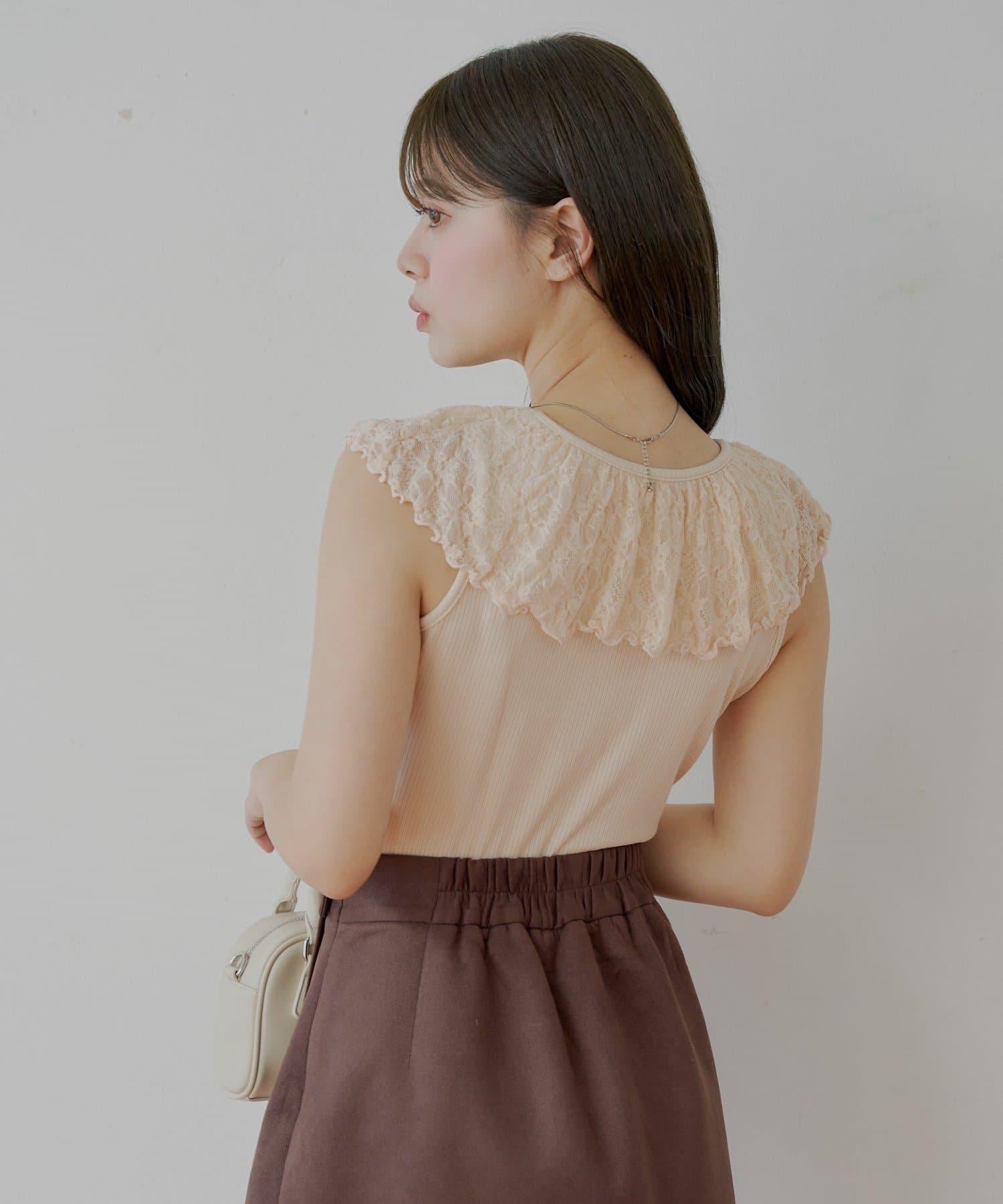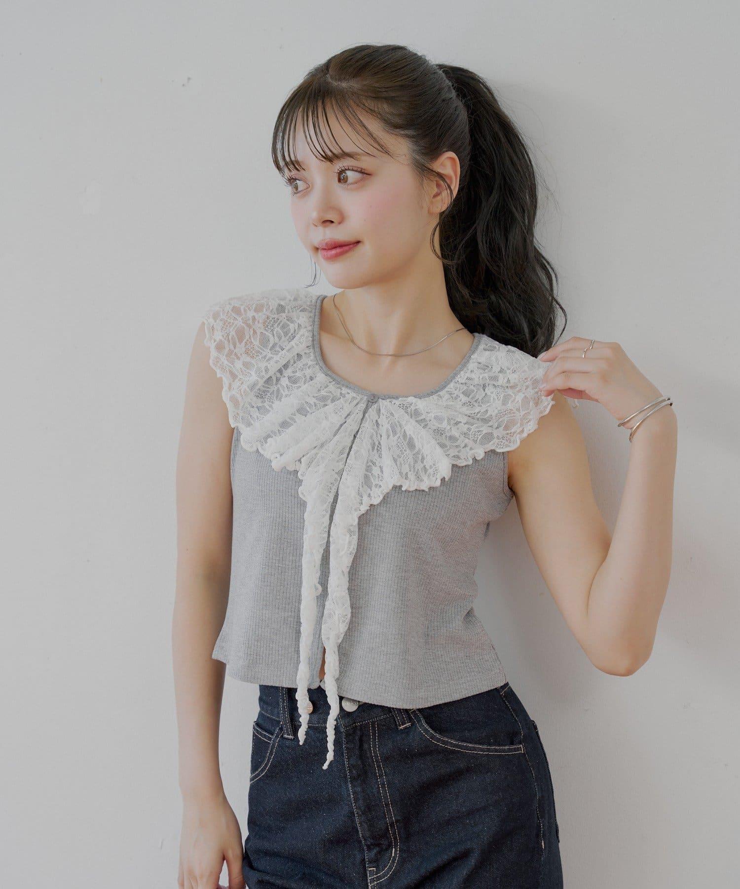 這款無袖羅紋 T 恤以優雅透明的蕾絲作為華麗裝飾。