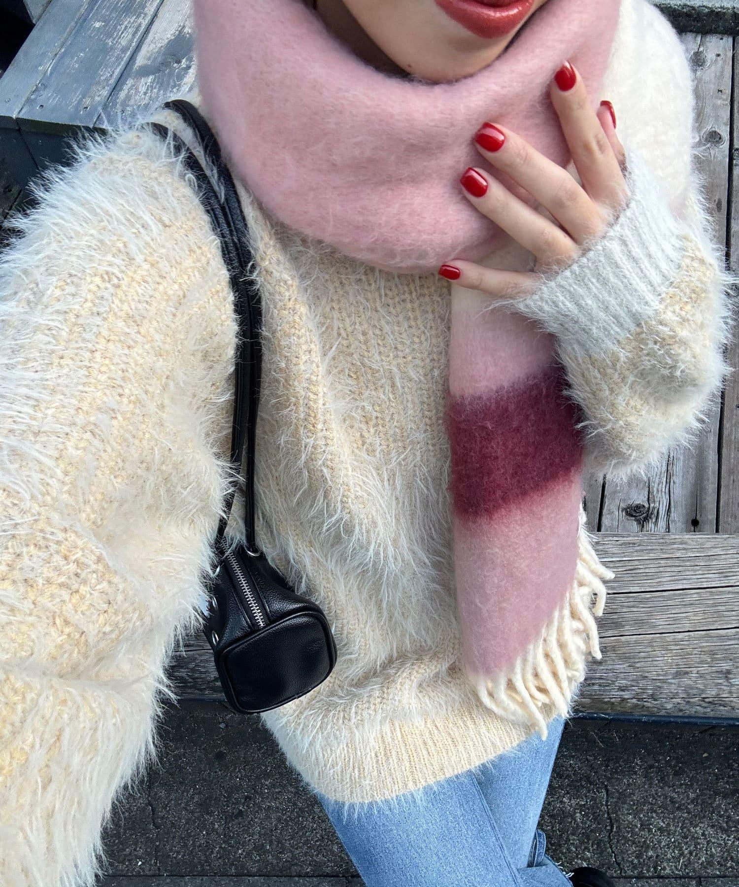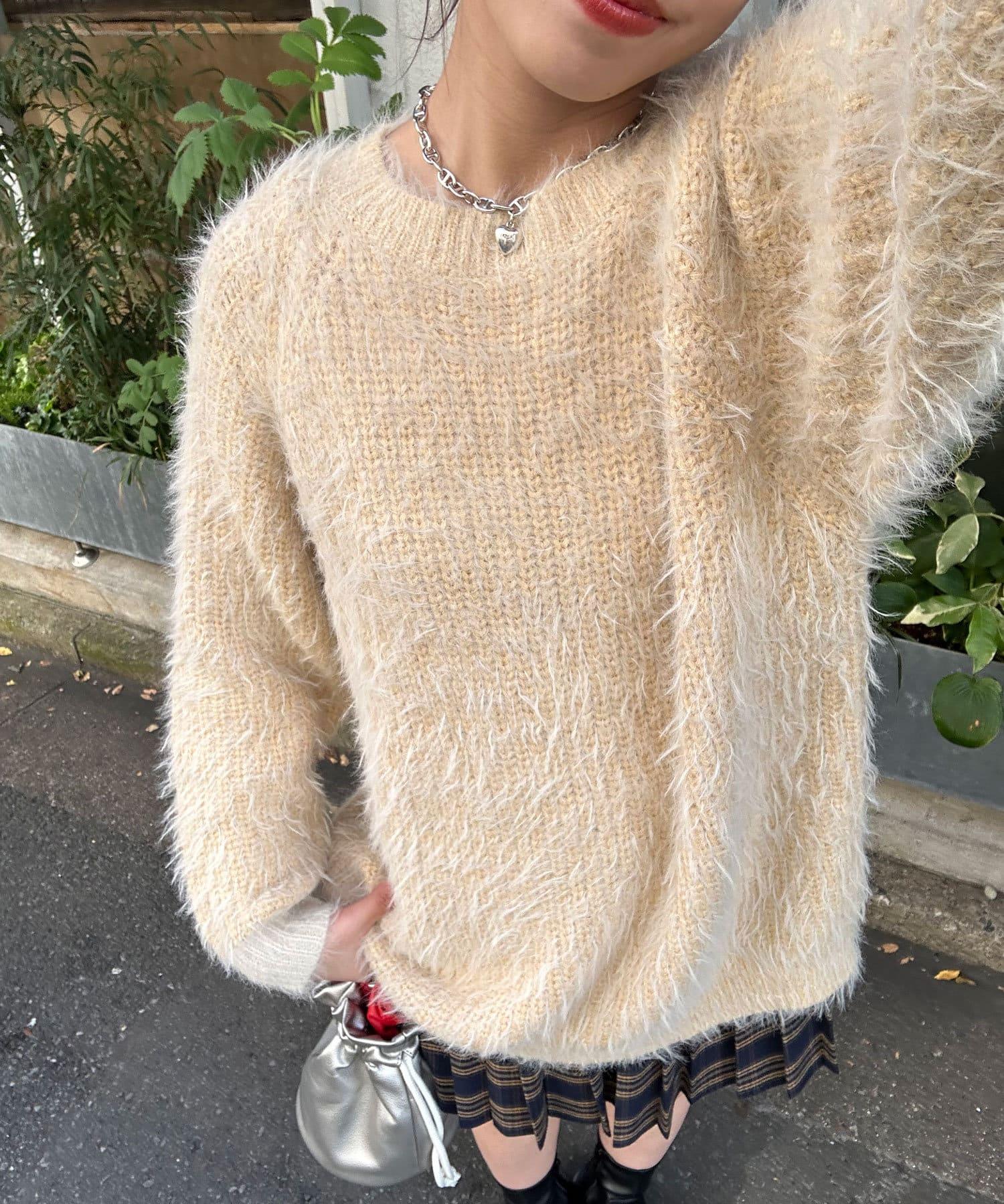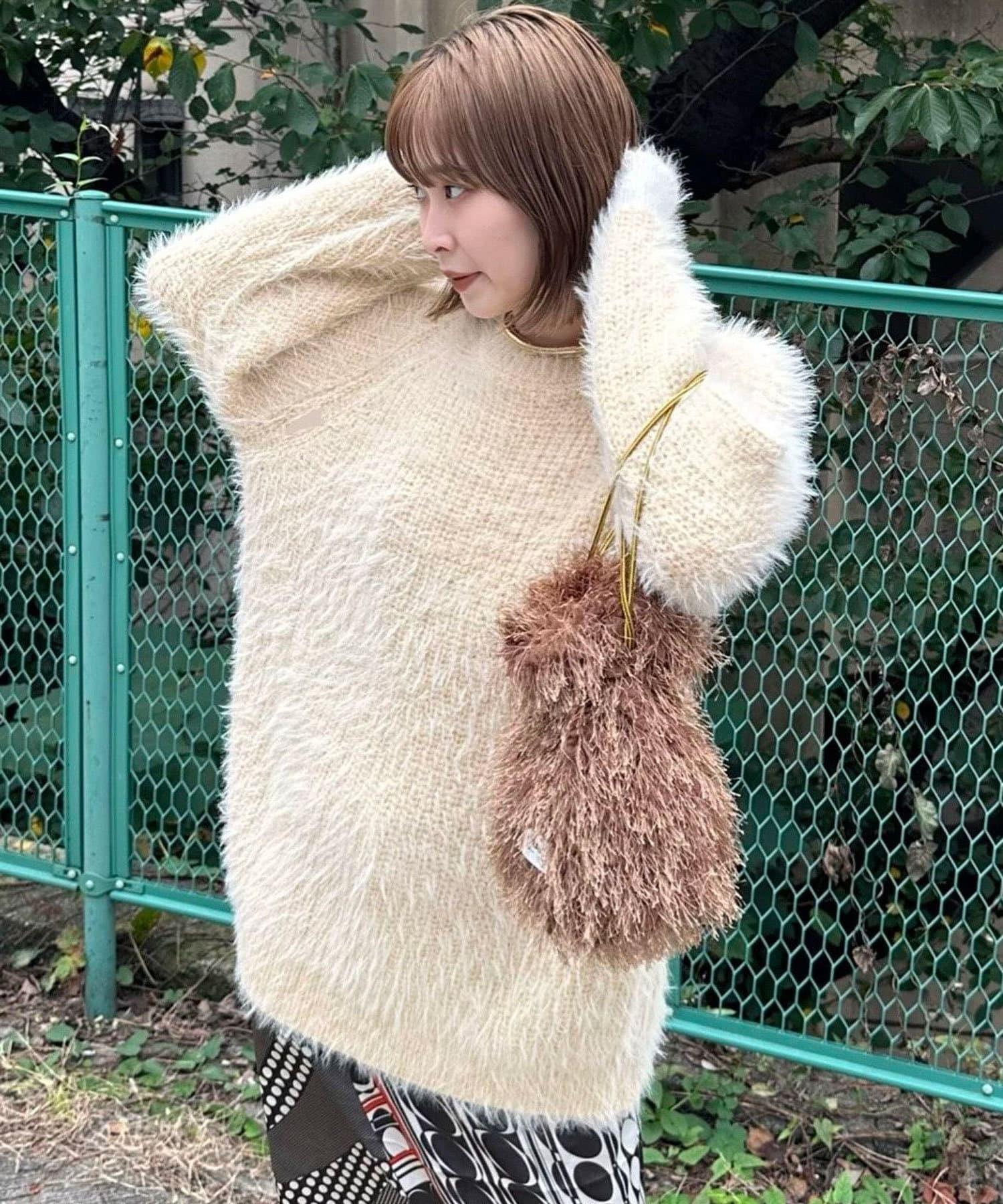 毛茸茸的材質和針織部分的色彩搭配,讓這款針織衫看起來時尚感十足。