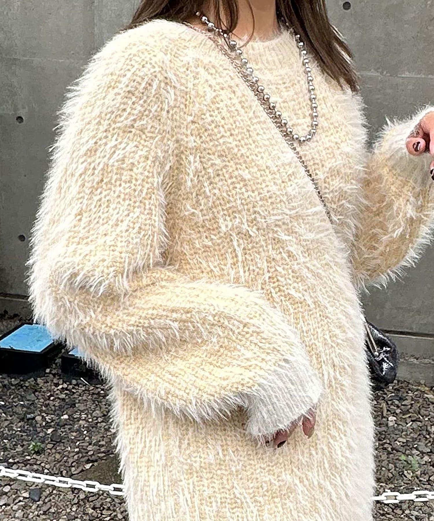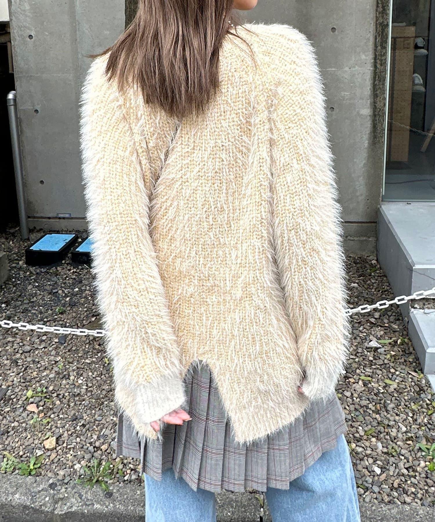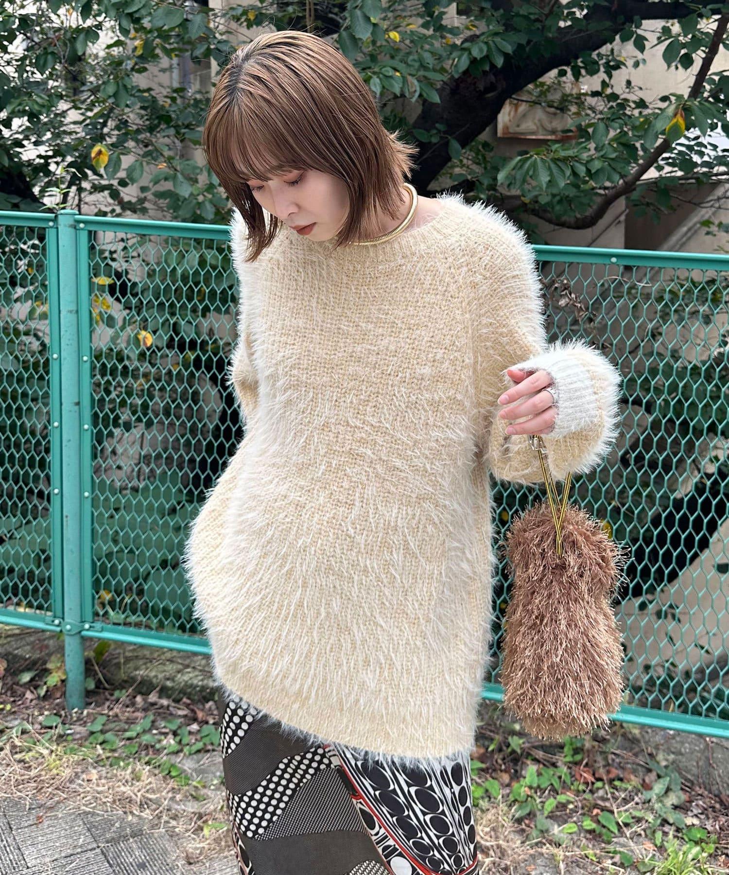 毛茸茸的材質和針織部分的色彩搭配,讓這款針織衫看起來時尚感十足。