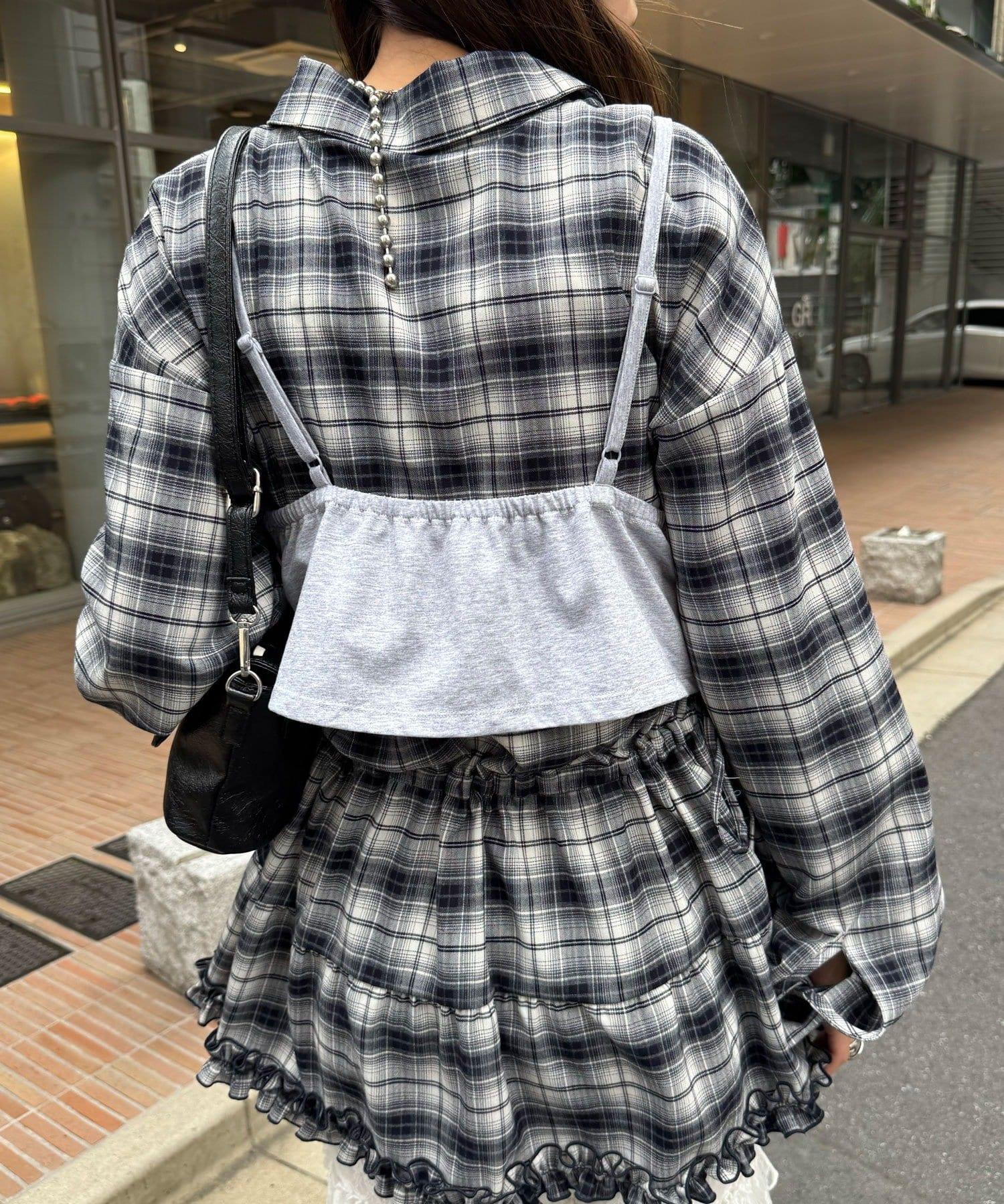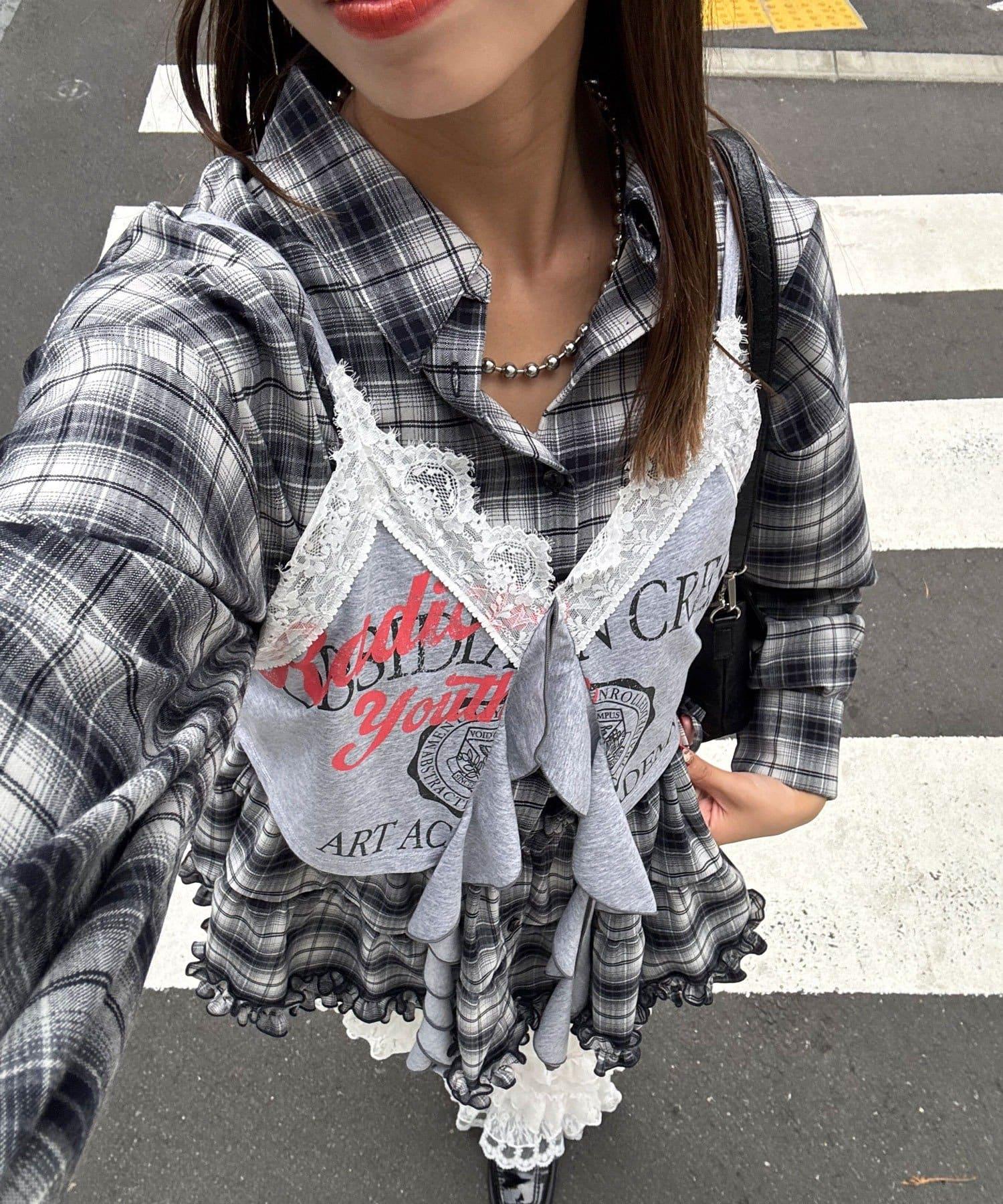 與寬鬆的格紋襯衫搭配,打造邋遢×少女甜辣的混搭風格。