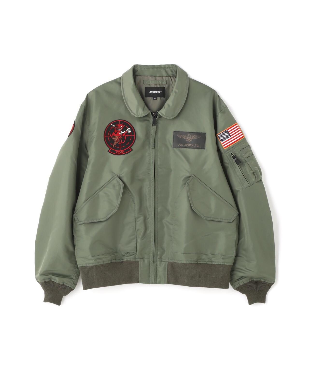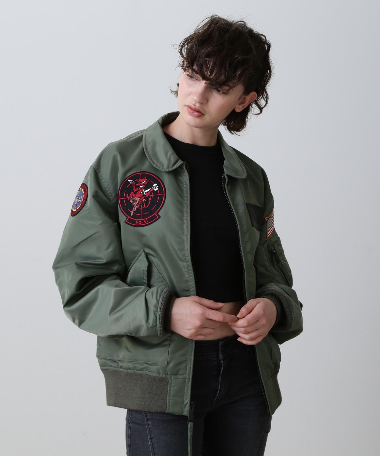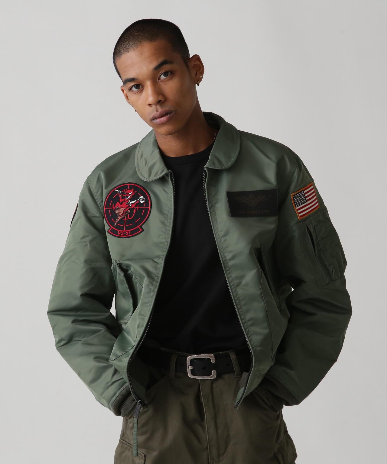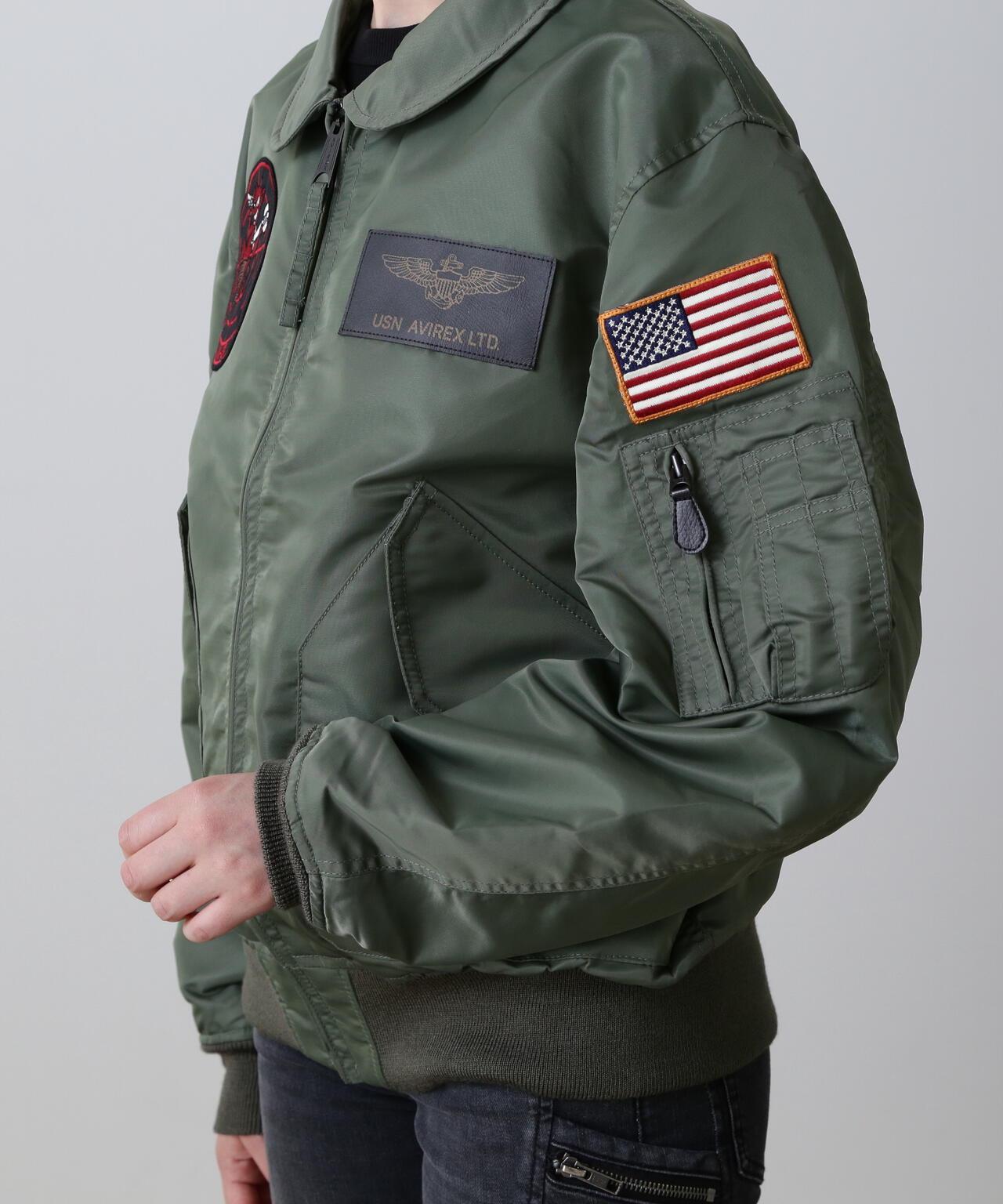 右袖上的補丁設計標誌著穿著者已從 "TOP GUN "畢業,左胸前的補丁設計是美國海軍的翼標和 AVIREX 徽標。左胸前的機翼標誌和 AVIREX 徽標的原始補丁設計,基本尺寸。