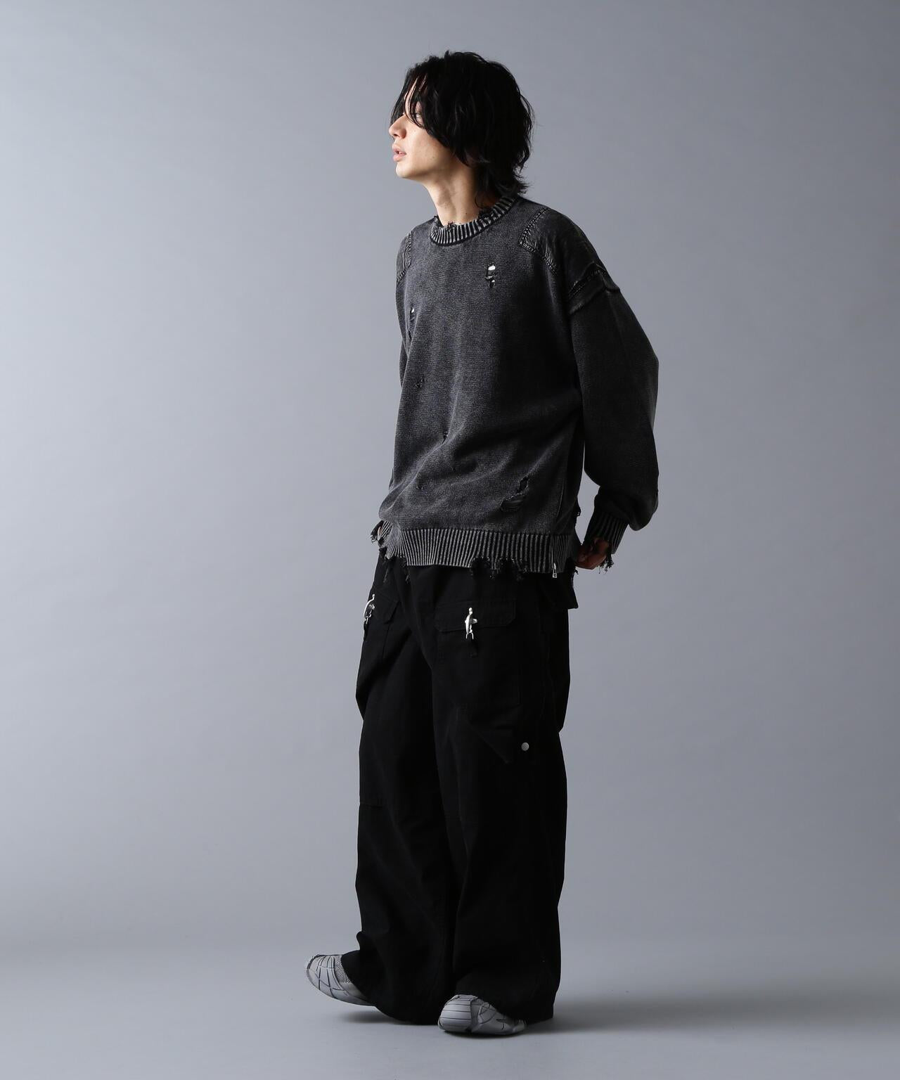 DankeSchön 將軍事與工藝相結合的破損針織衫的演變。這款以軍裝為靈感的圓領針織衫採用深色素染色和逼真的破損處理工藝,具有類似丹可舒的使用感和立體的細節處理,十分搶眼。袖子和肩部採用不同材質的拼接式切換,增添了不單調的亮點。破舊的外觀和👍設計的平衡營造出一種既粗獷又 "典型 "的精緻氛圍。▶ 造型小貼士 ・可與貨褲或軍褲搭配,營造整體感;也可與皮褲或休閒褲搭配,打造混搭風格的街頭造型。與皮革或休閒褲搭配,打造混搭風格的街頭造型。