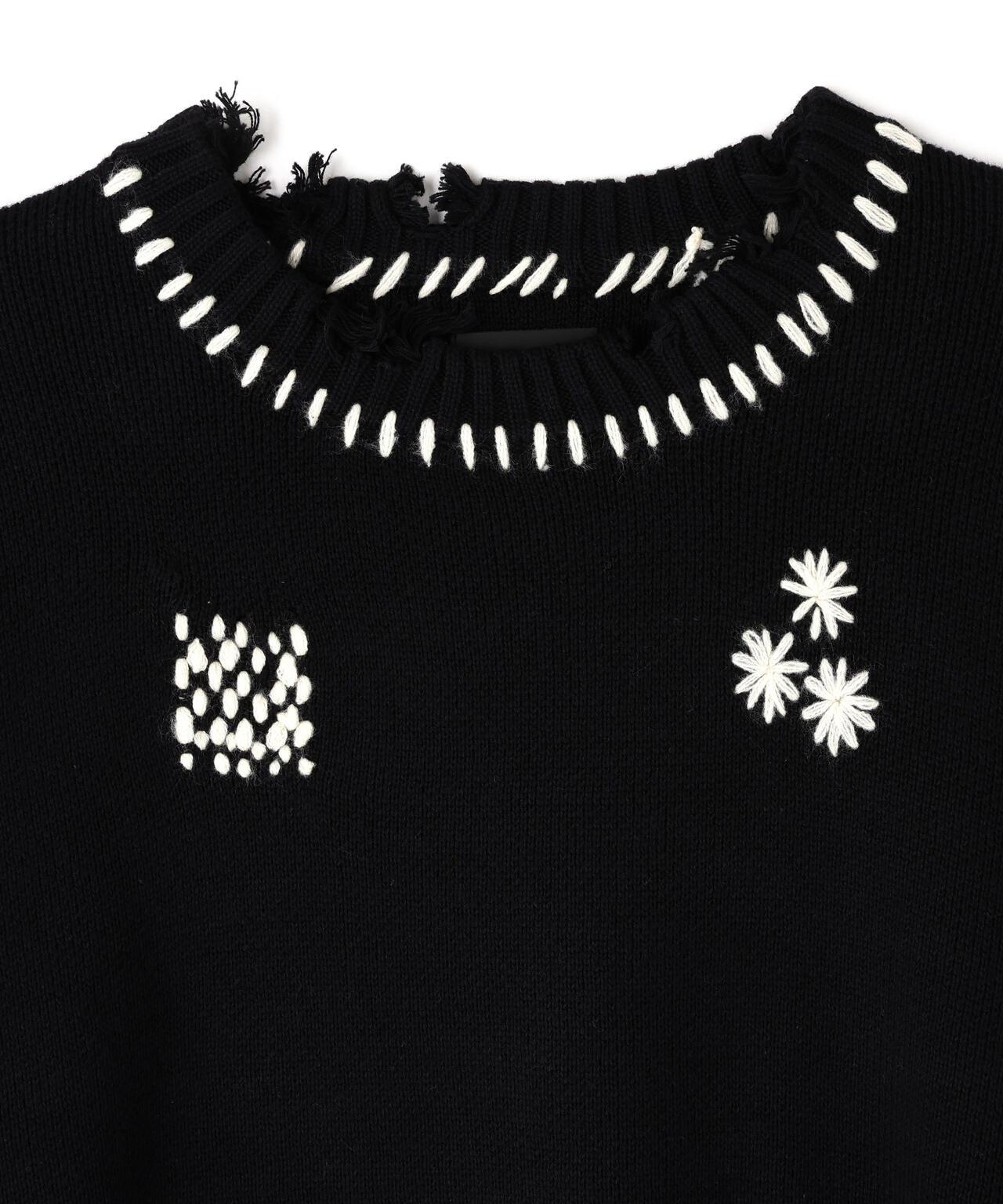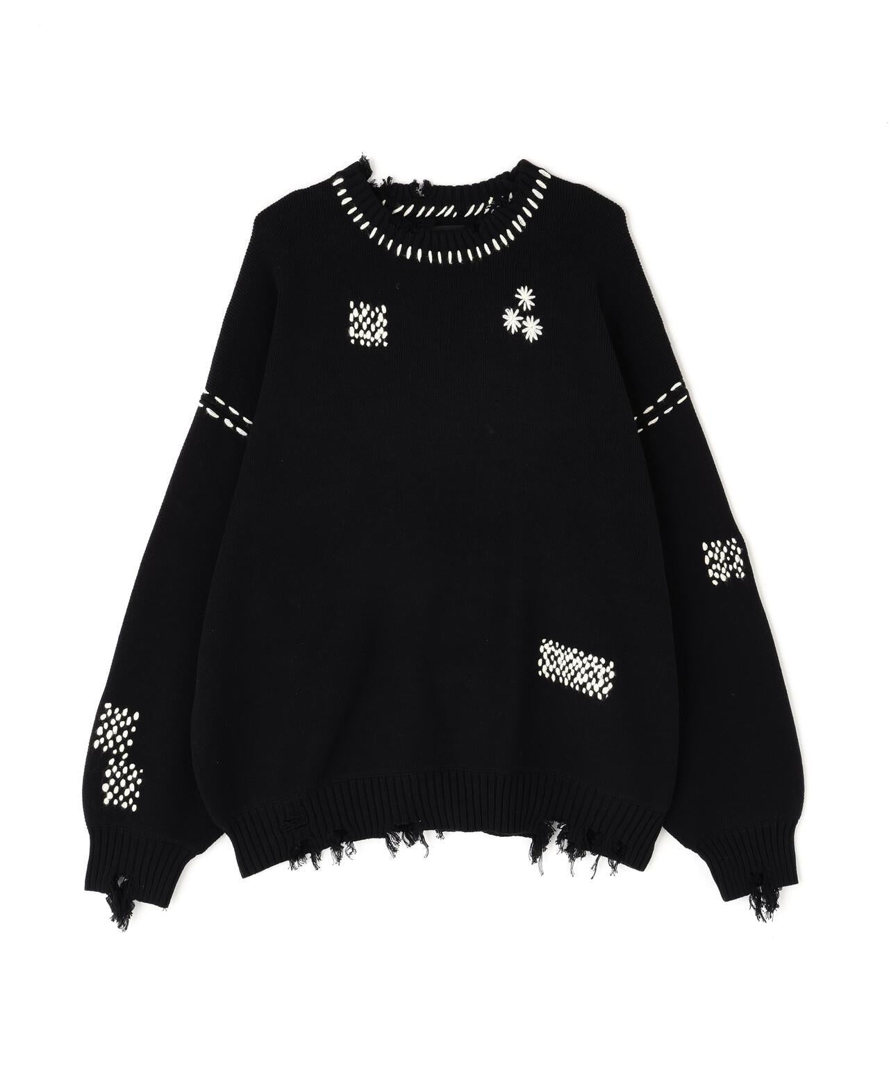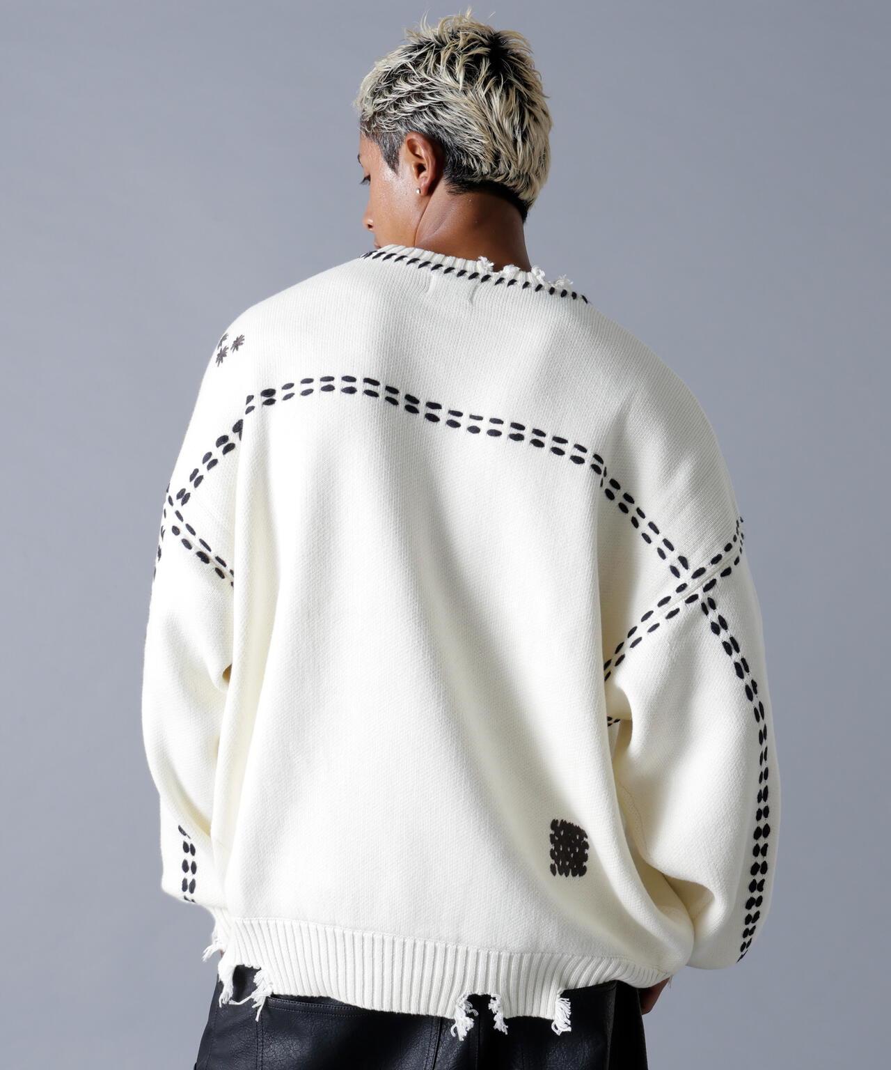 DankeSchon 手工縫製的刺繡、損傷處理和通身的剪裁設計使這款圓領針織衫十分搶眼。袖口和下襬的破損處由工匠精心處理,再現了真正的復古和工藝感。寬鬆的剪裁、較長的長度和良好的衣身空間,男女皆宜。中針距針織面料由腈綸混紡製成,刺感較弱,具有良好的厚度和柔軟度。這種面料穿著舒適,不受季節影響。有黑色和白色兩種顏色可供選擇,適合各種場合和街頭穿著。可搭配各種下裝,從直筒到寬鬆廓形的牛仔長褲、揹帶褲和短褲,不受品味和季節的限制。
