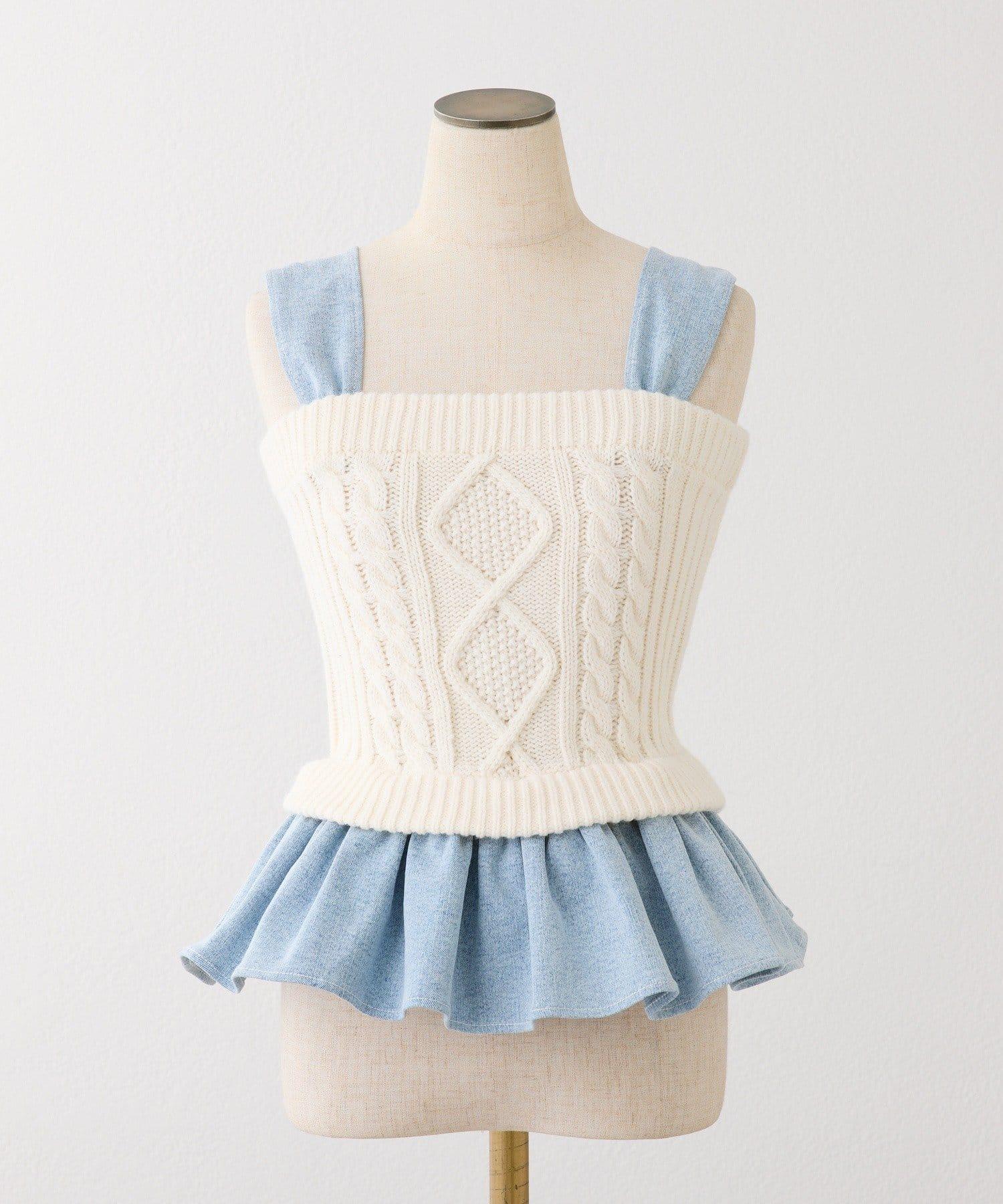 這款可愛的半身裙混合了不同的材質,主體採用了電纜針織,肩部緞帶和下襬流蘇則採用了牛仔布料。