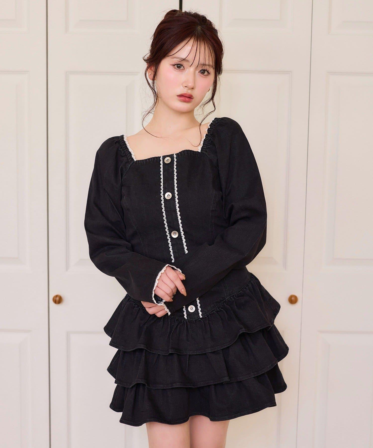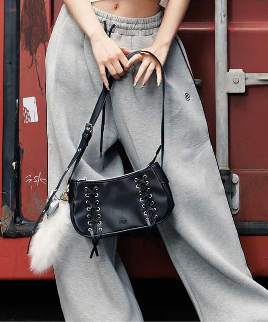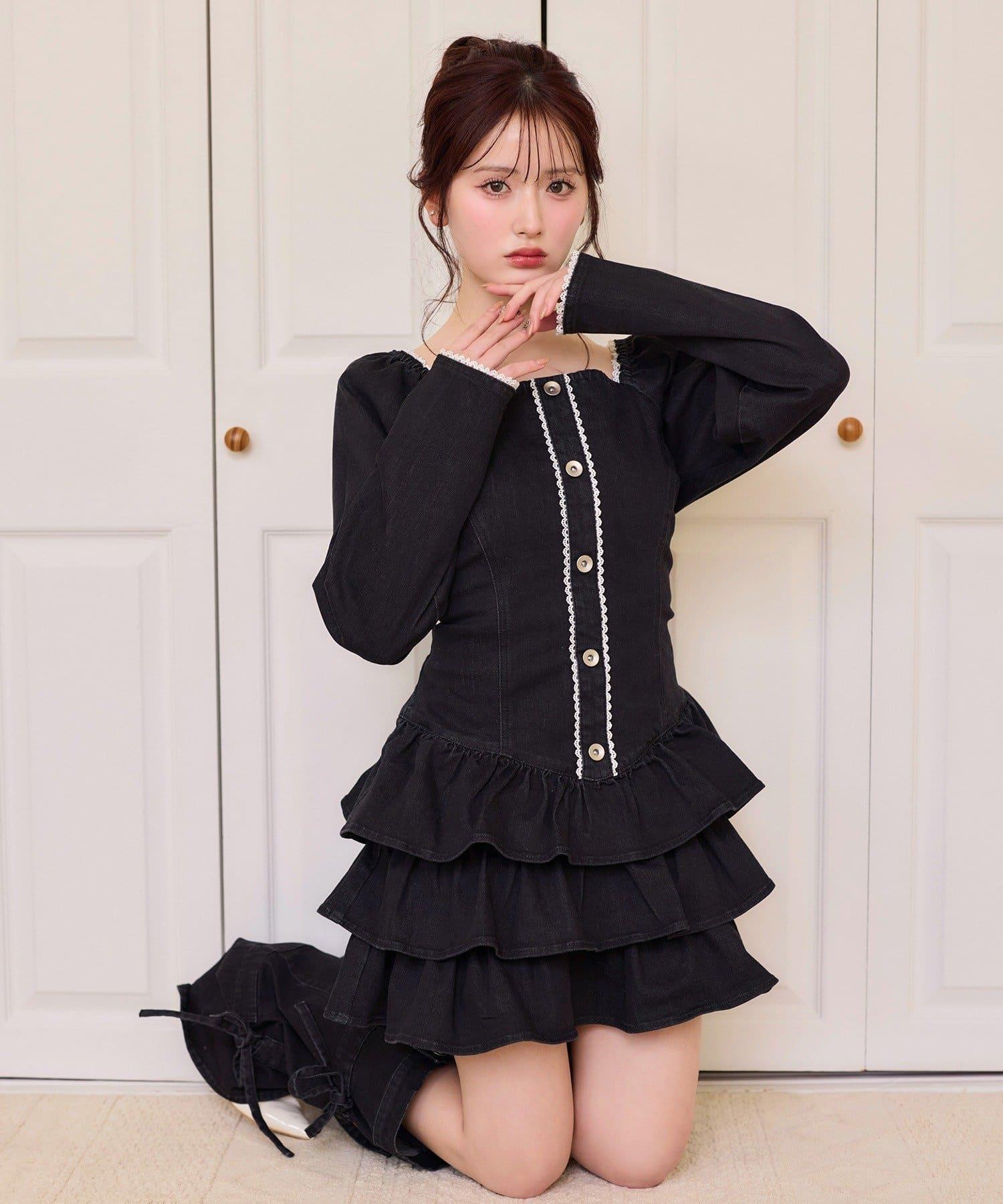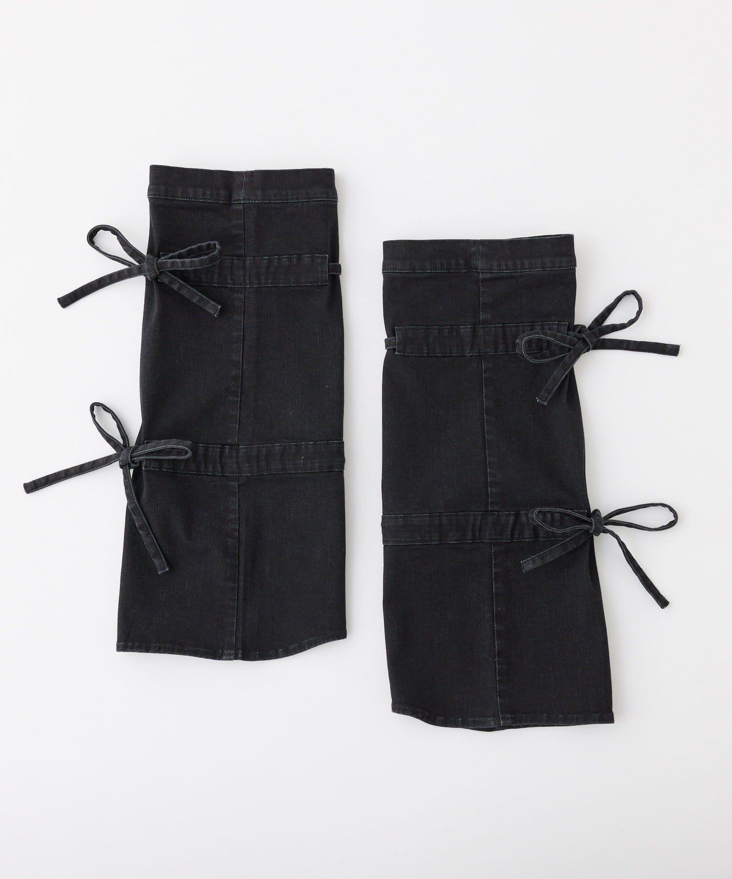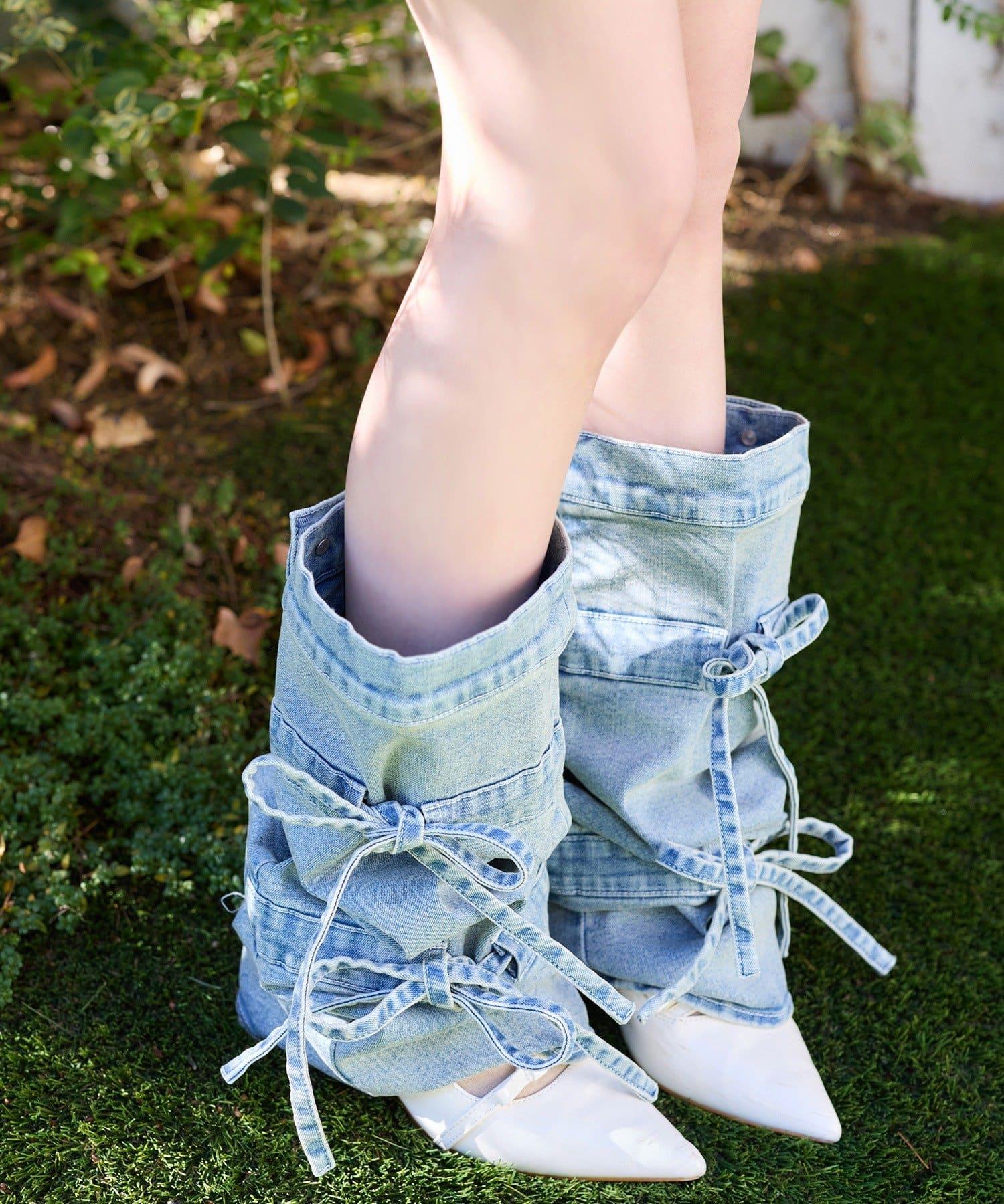 在牛仔布料上加入絲帶設計的腿部保暖套,讓你的搭配更加出彩。