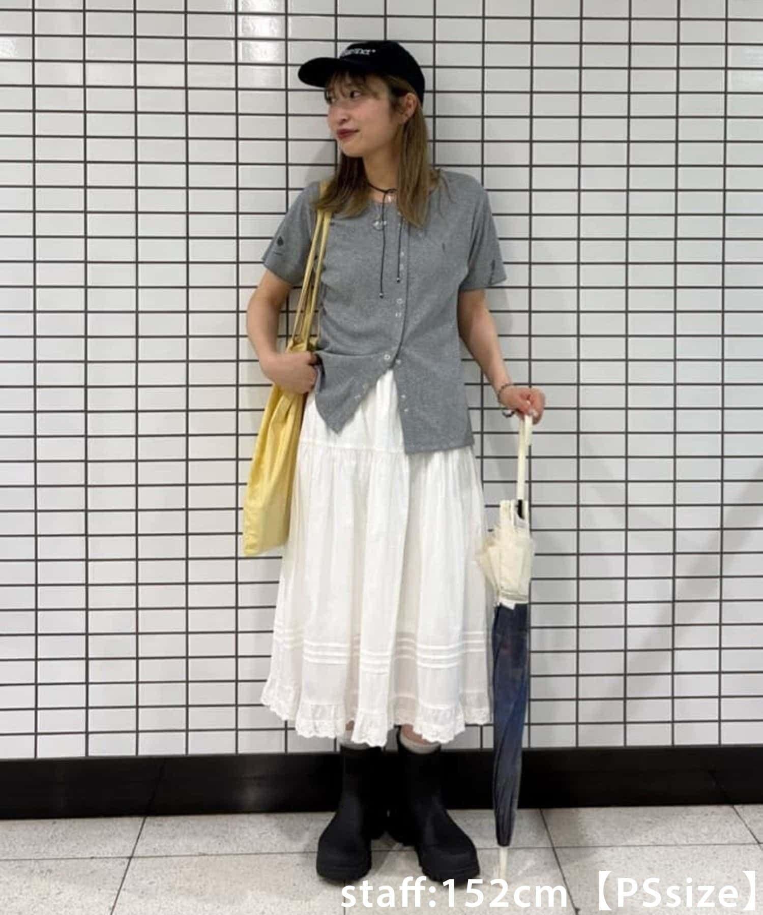 身高 163 厘米的員工:F 碼長度剛好露出腳踝!這是一款甜美的單品,建議搭配一件漂亮的外套,讓您看起來更加利落!