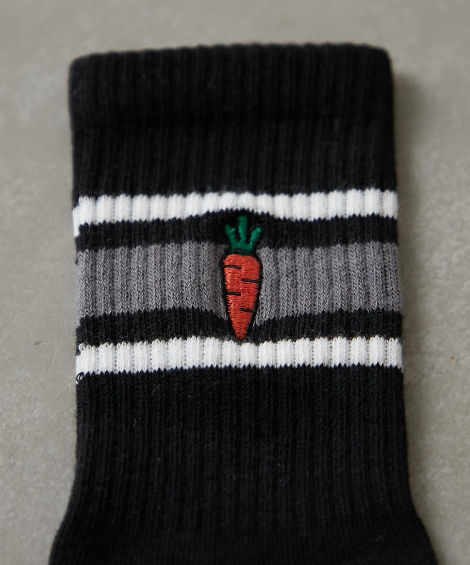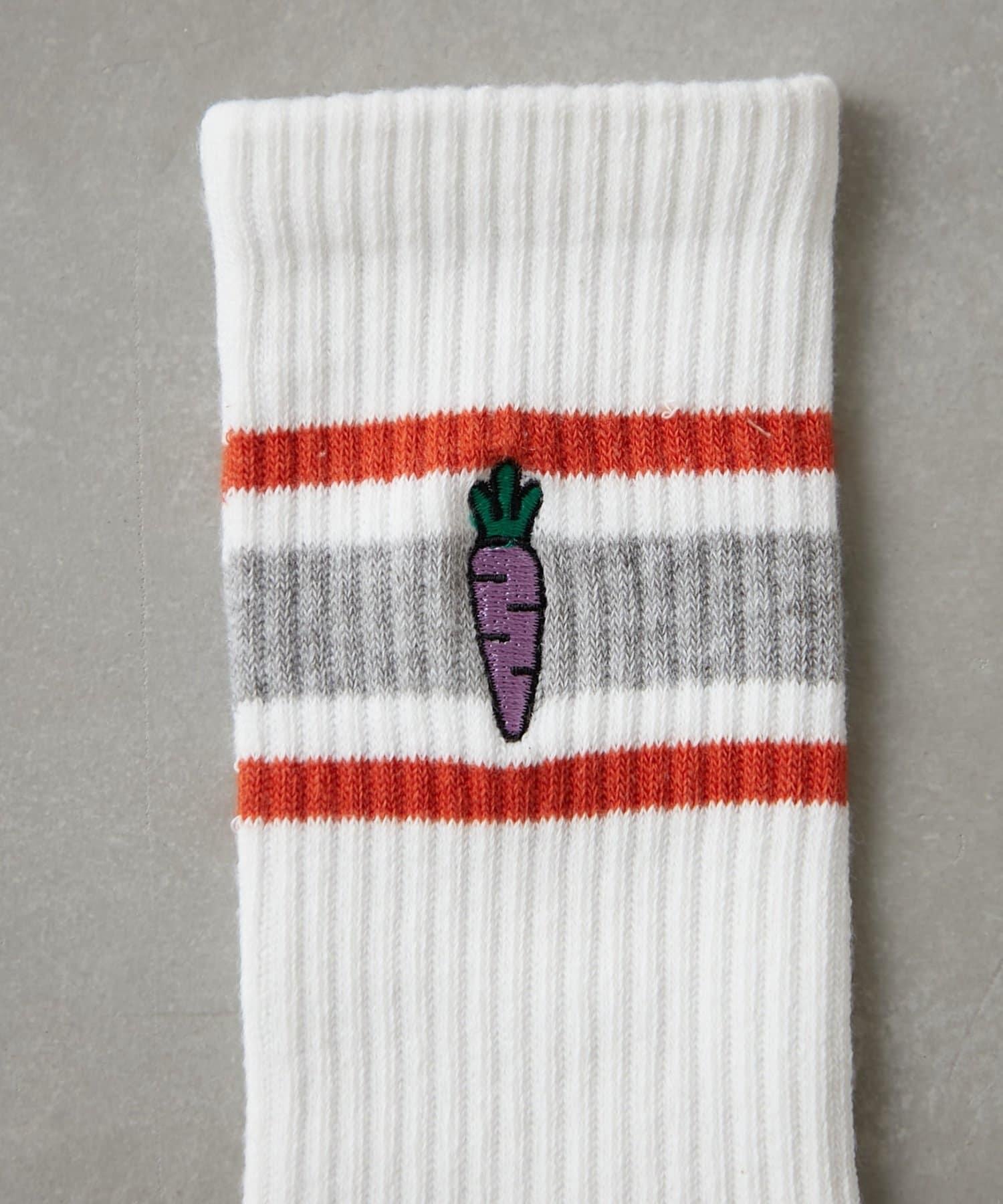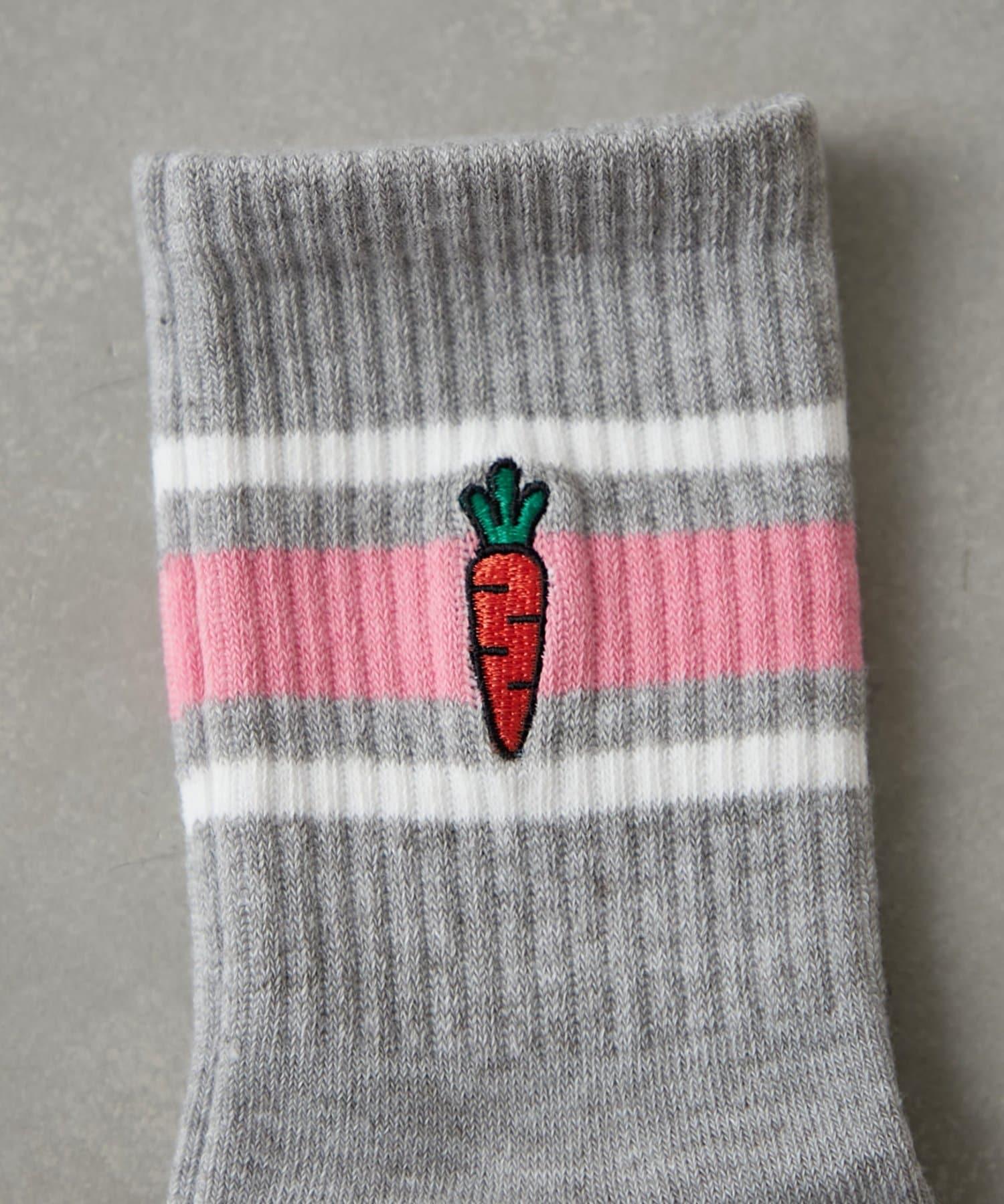 線襪上繡有胡蘿蔔和兔子圖案,給人一種微妙的趣味感。